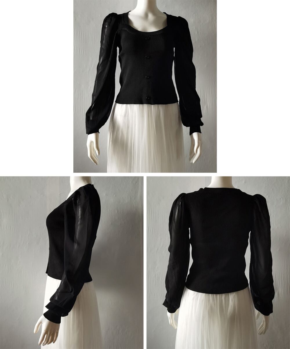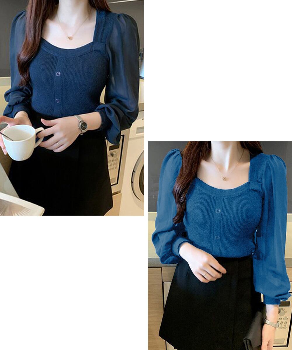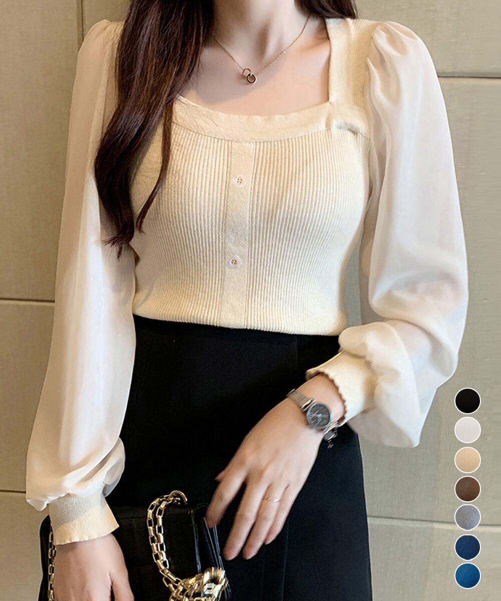 ニットトップス レディース フェミニン感ブラウス 無地 ボリューム袖 トップス シンプル 袖透け感