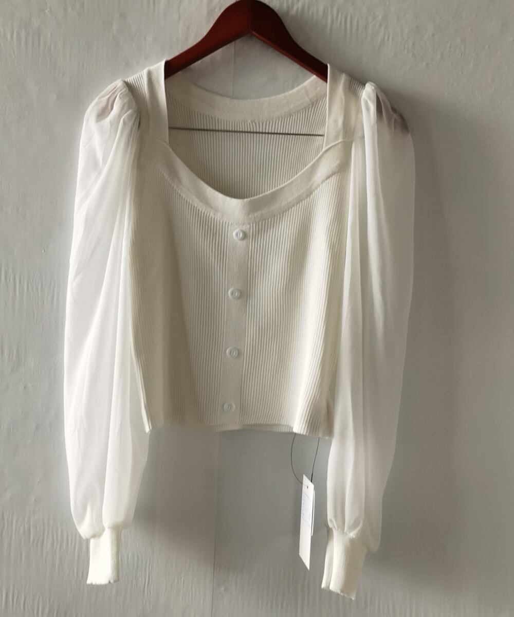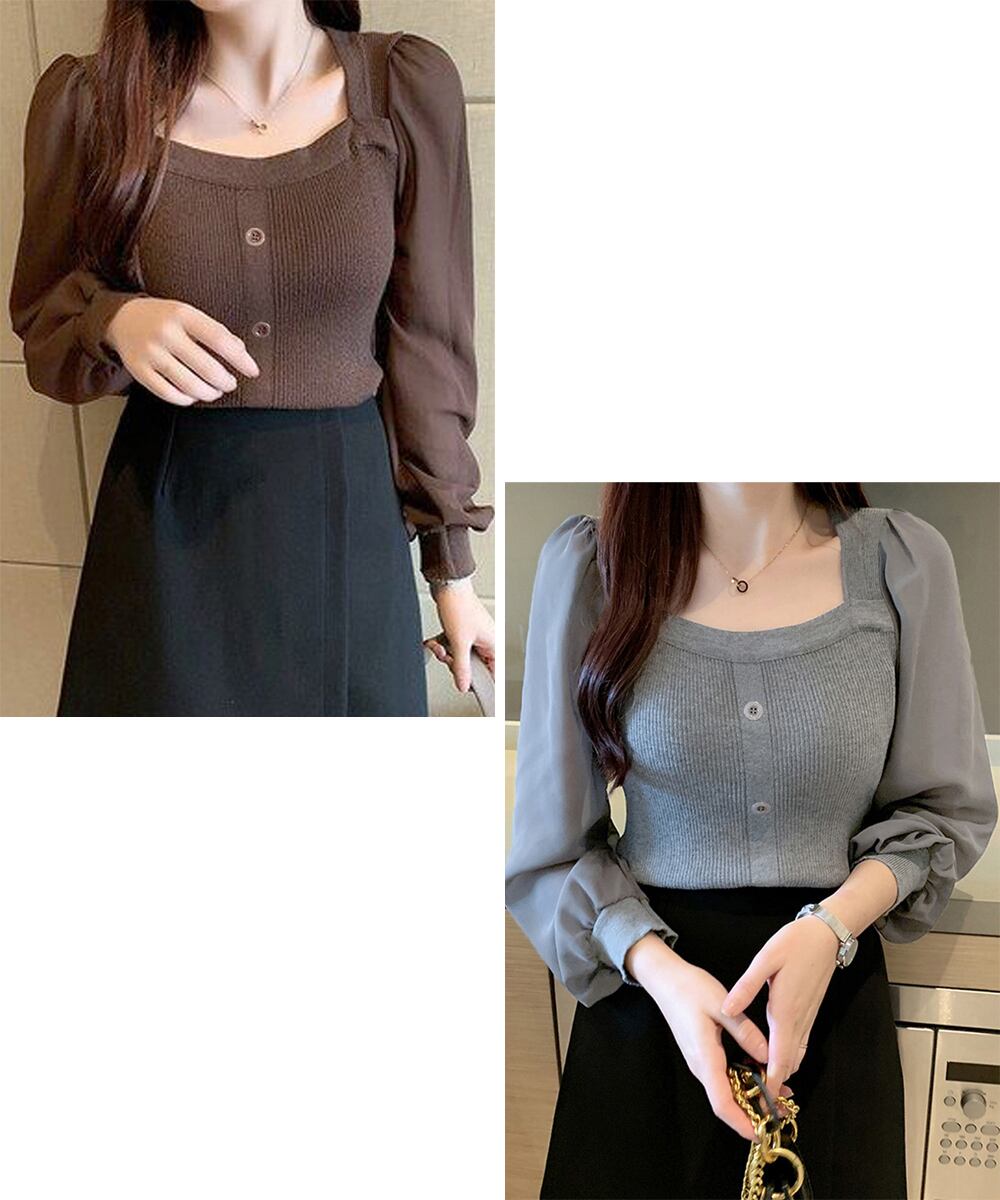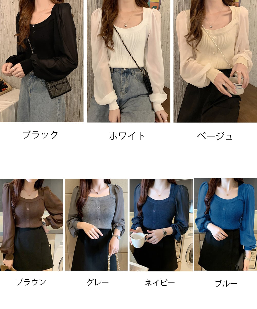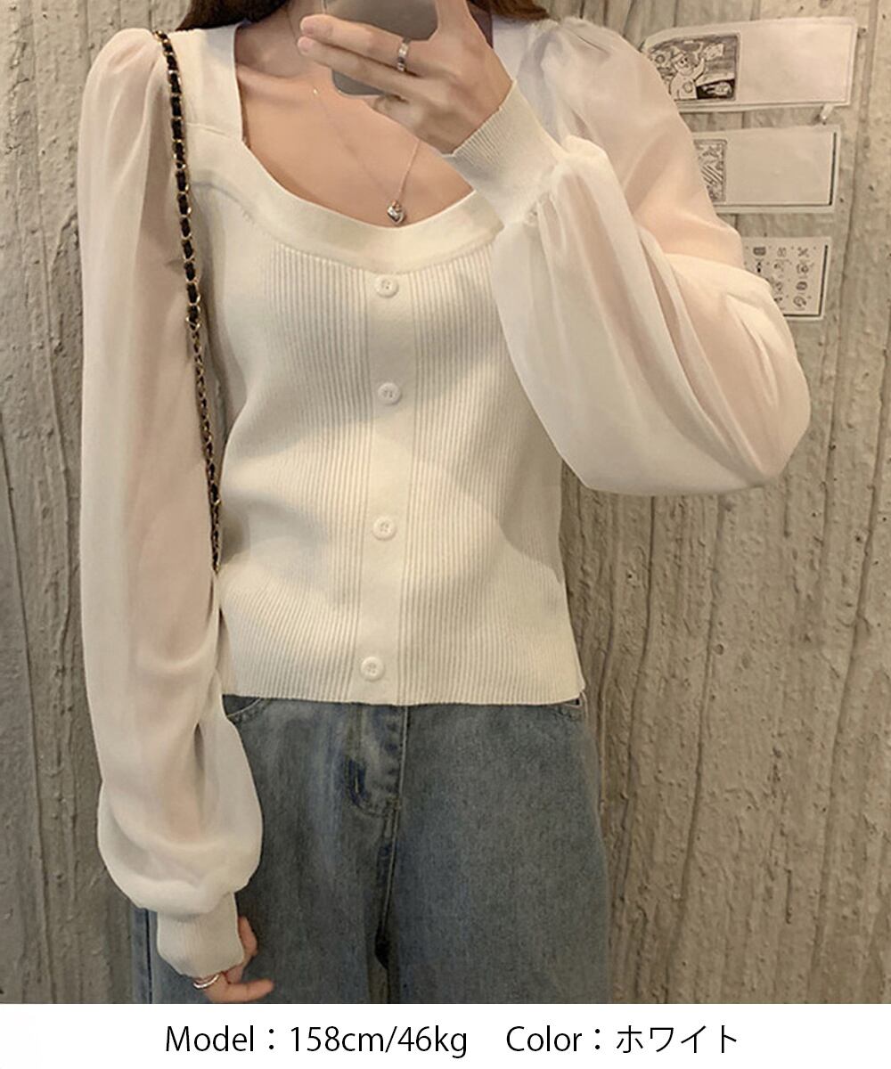 ニットトップス レディース フェミニン感ブラウス 無地 ボリューム袖 トップス シンプル 袖透け感