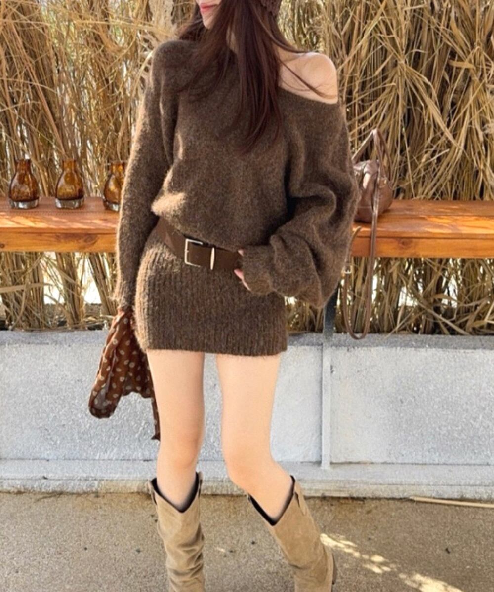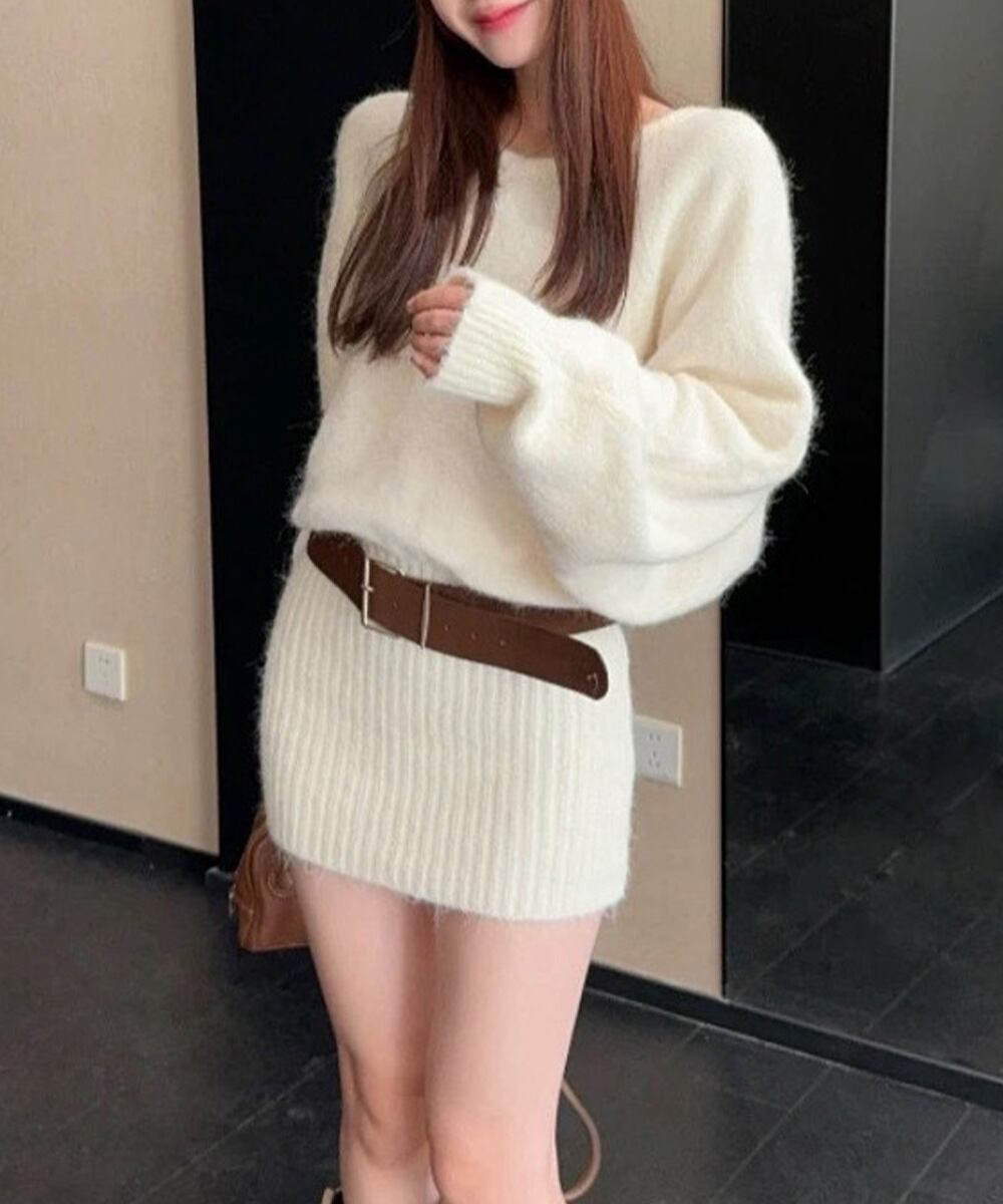 トップはボリュームスリーブで華奢見え、スカートはリブ編みで脚まわりをすっきり見せるシルエット。