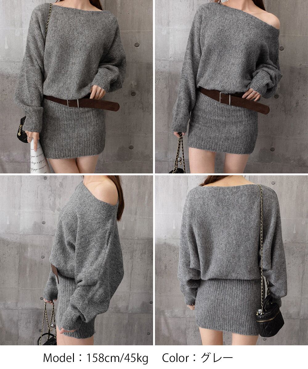 ベルト付きリブワンピース レディース タイトシャギーミニワンピース チュニックワンピ秋冬長袖 オフショルダーワンピ着やせ