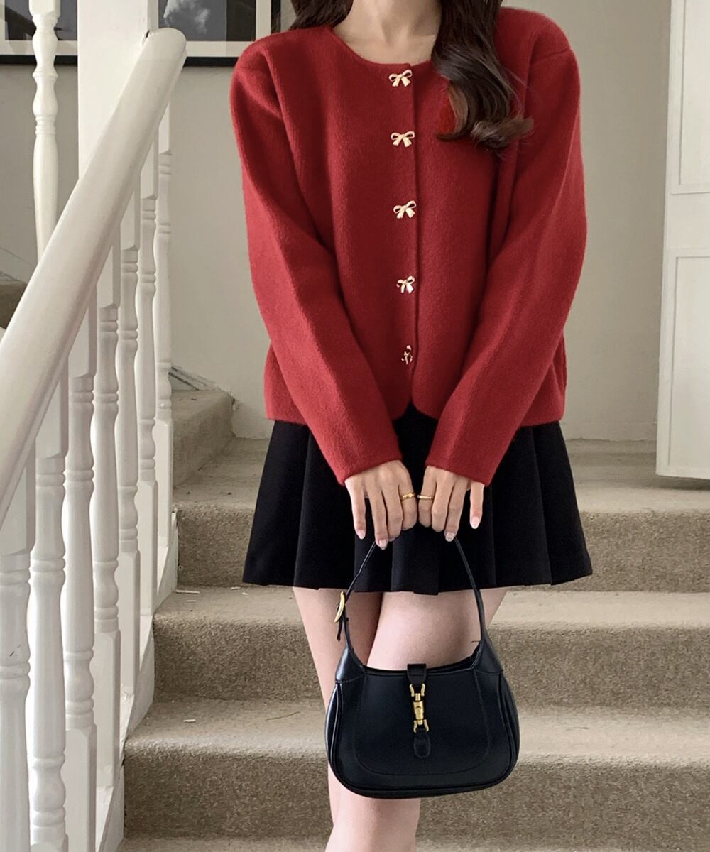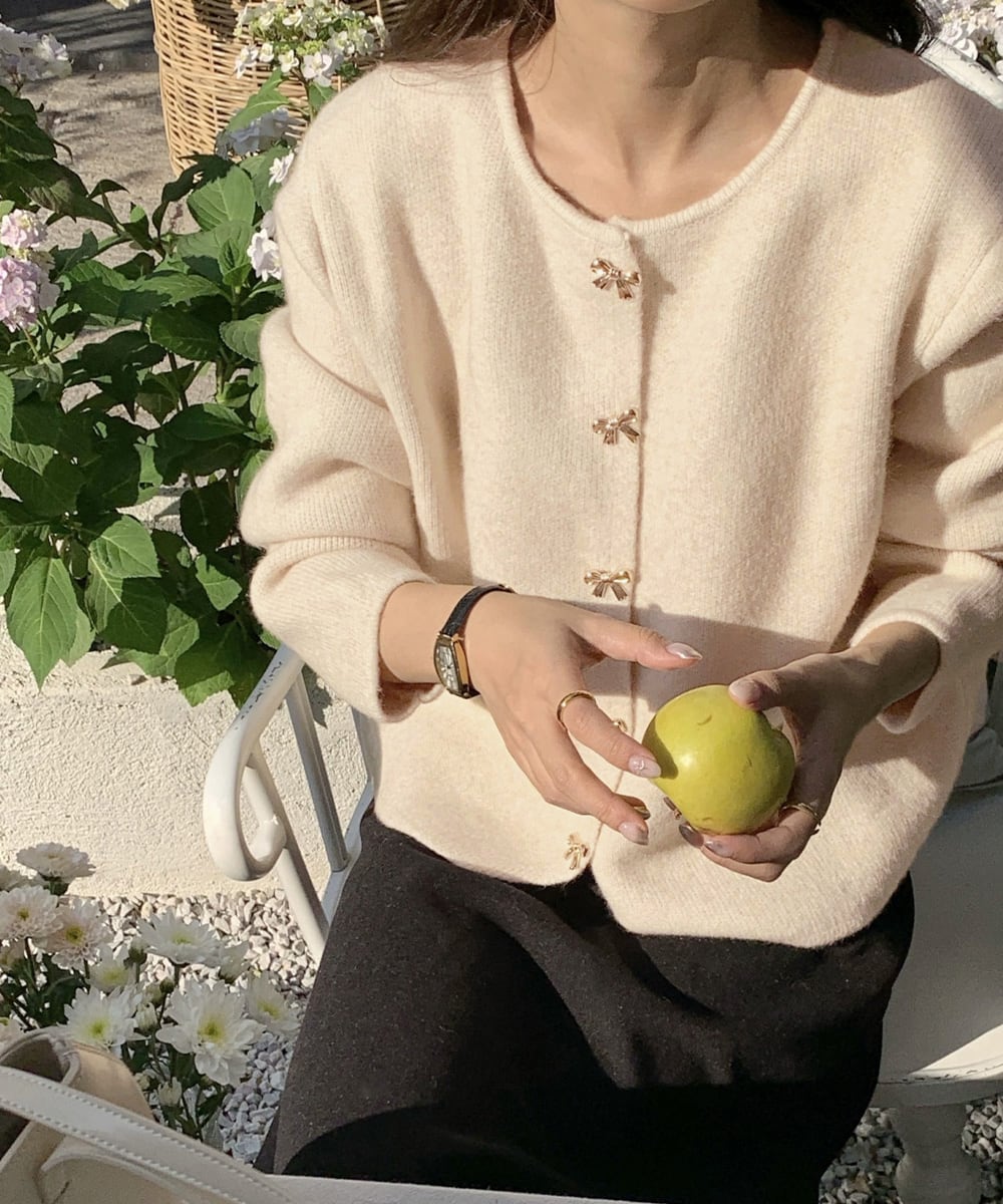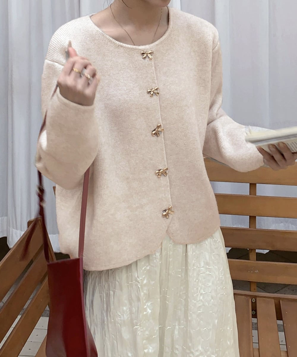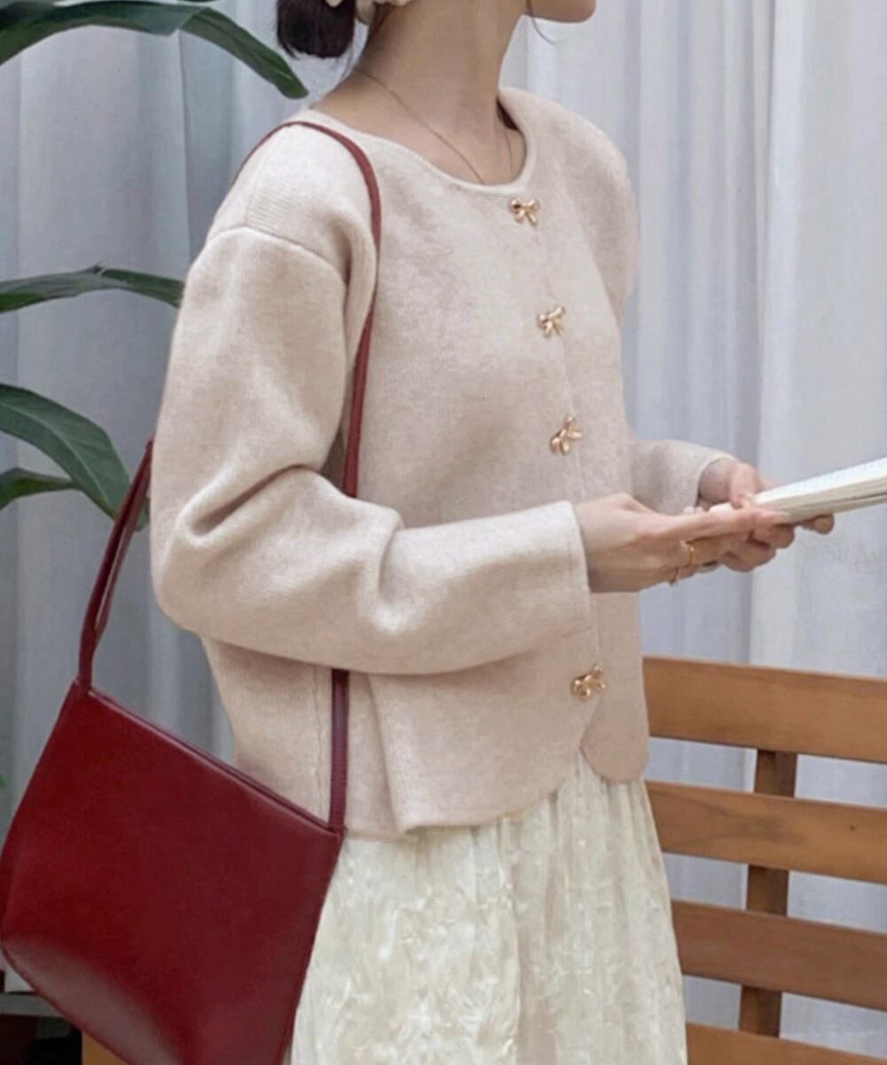 小さなリボン調のゴールドボタンが上品さを添えるポイント。