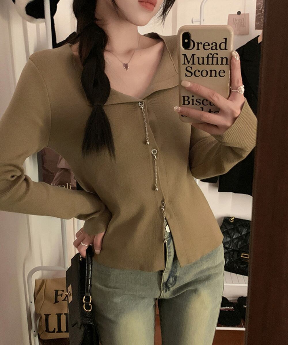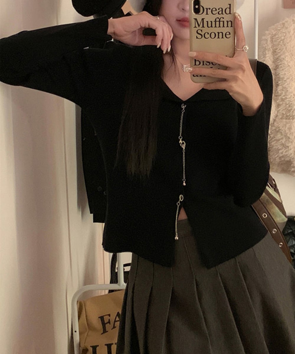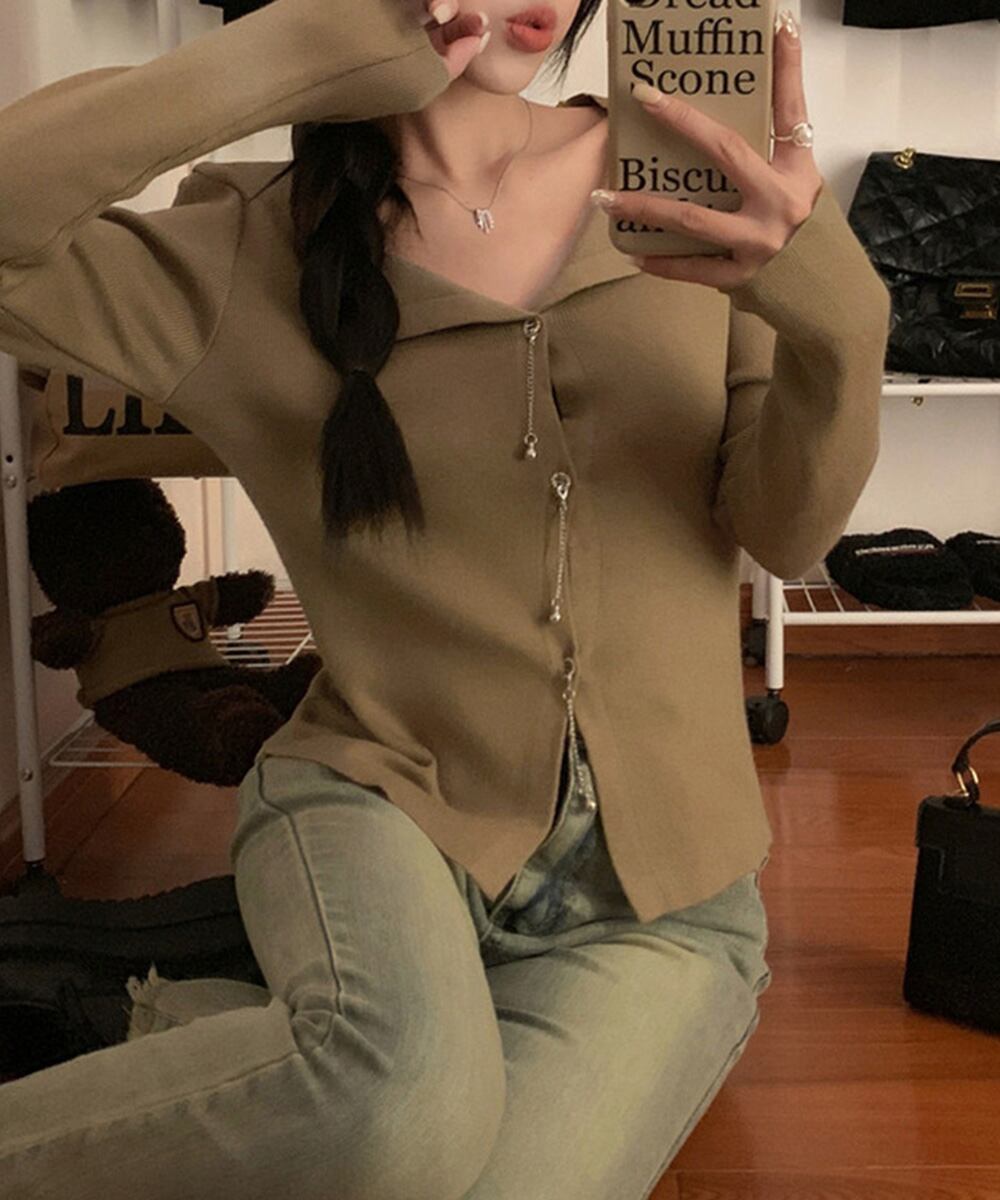 ボタンに沿った華奢なチェーンが、シンプルなシルエットに上品なアクセントをプラス。