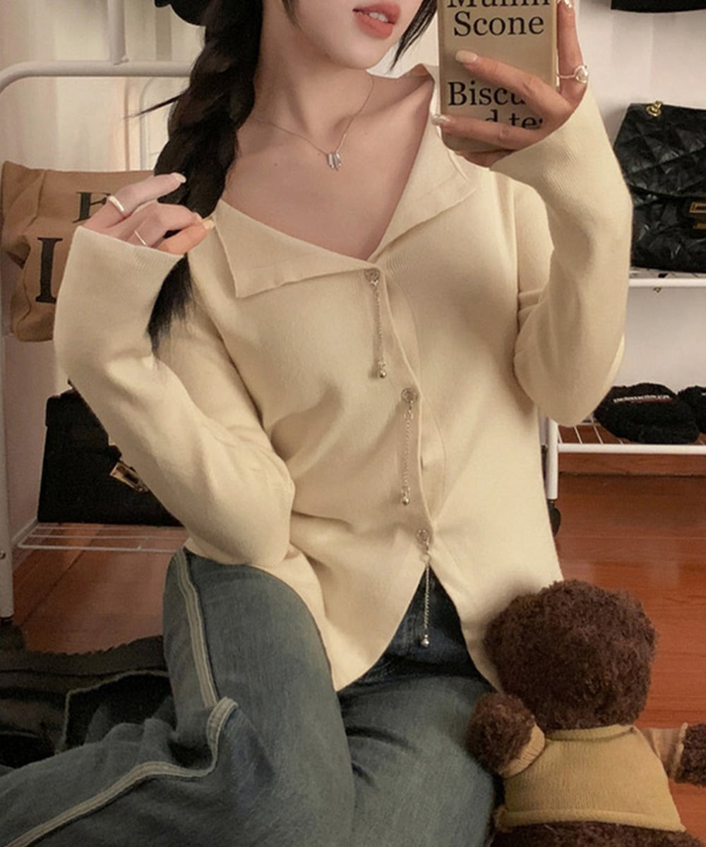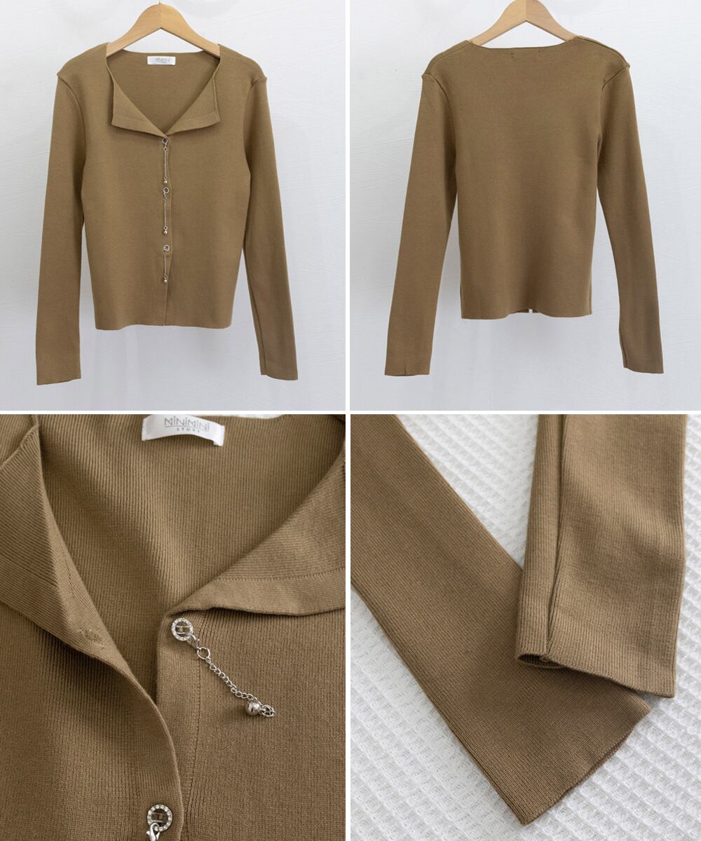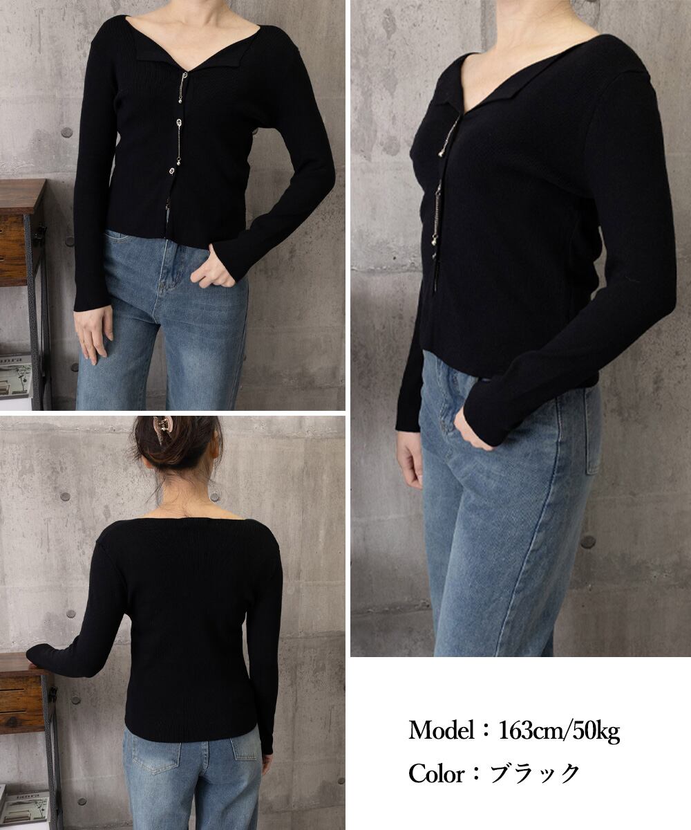 ボタンに沿った華奢なチェーンが、シンプルなシルエットに上品なアクセントをプラス。