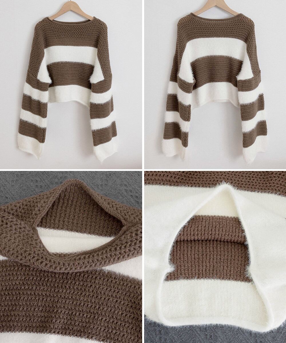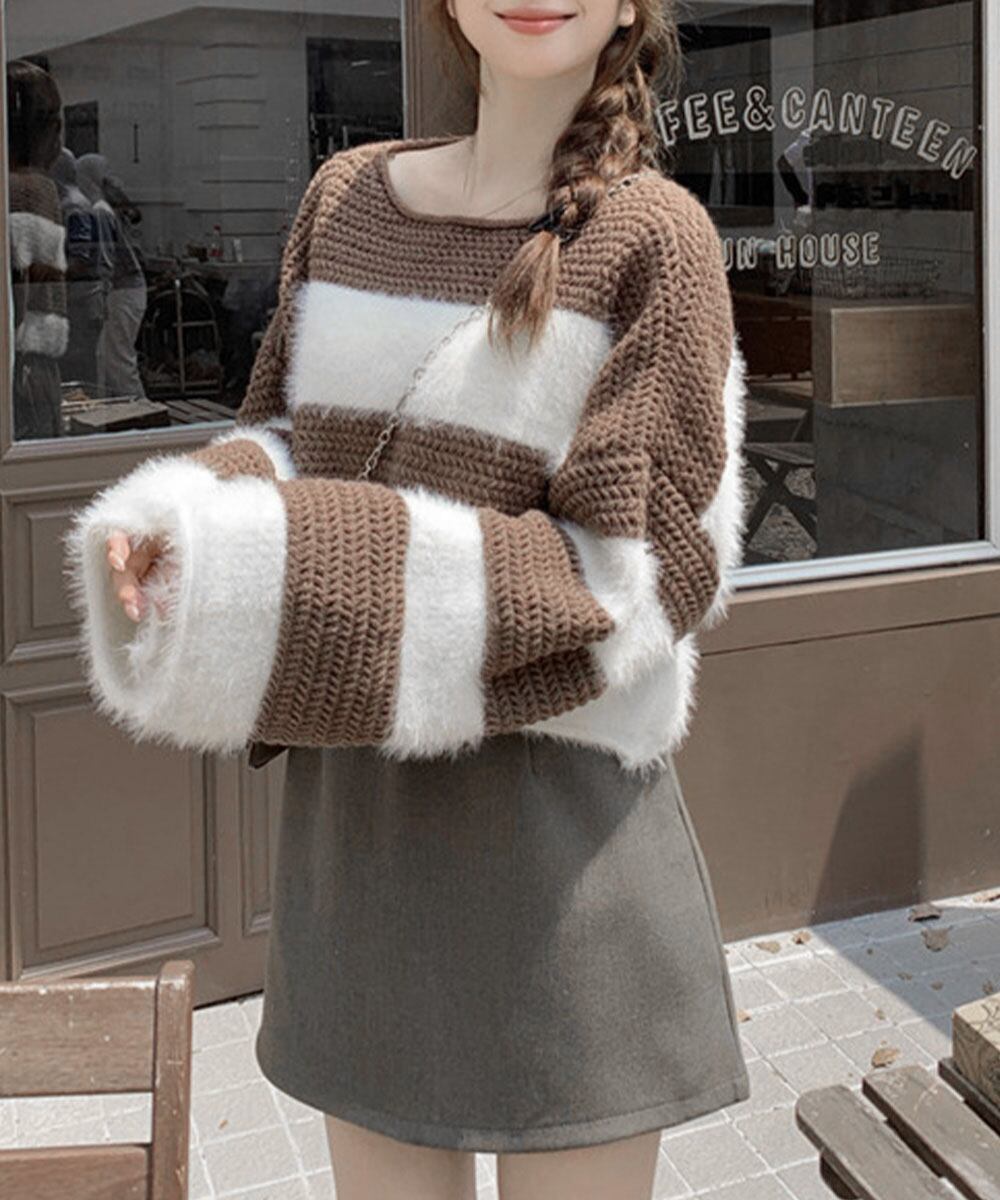ボーダーセーター冬 ゆるふわニット配色 韓国風ニット可愛い