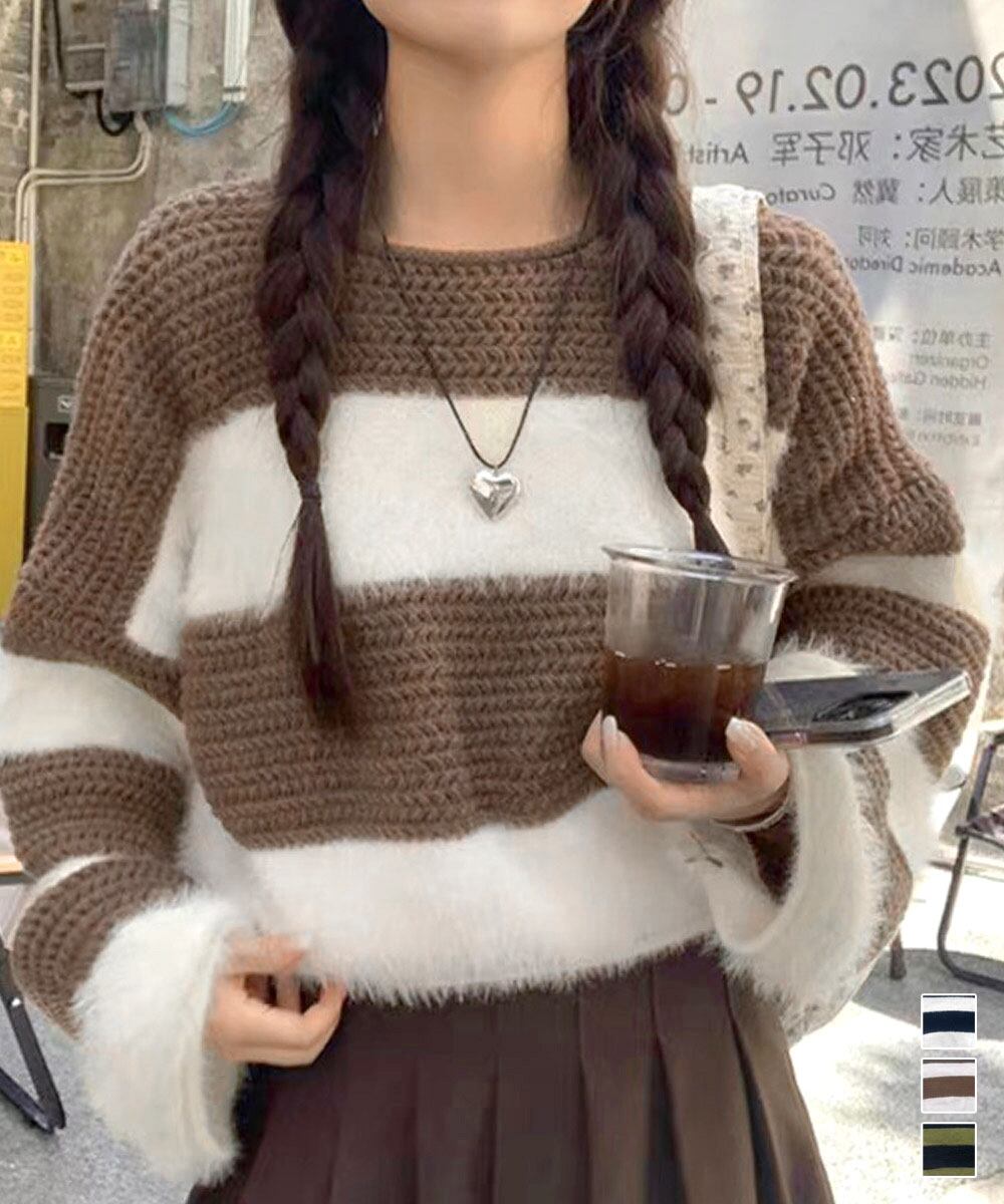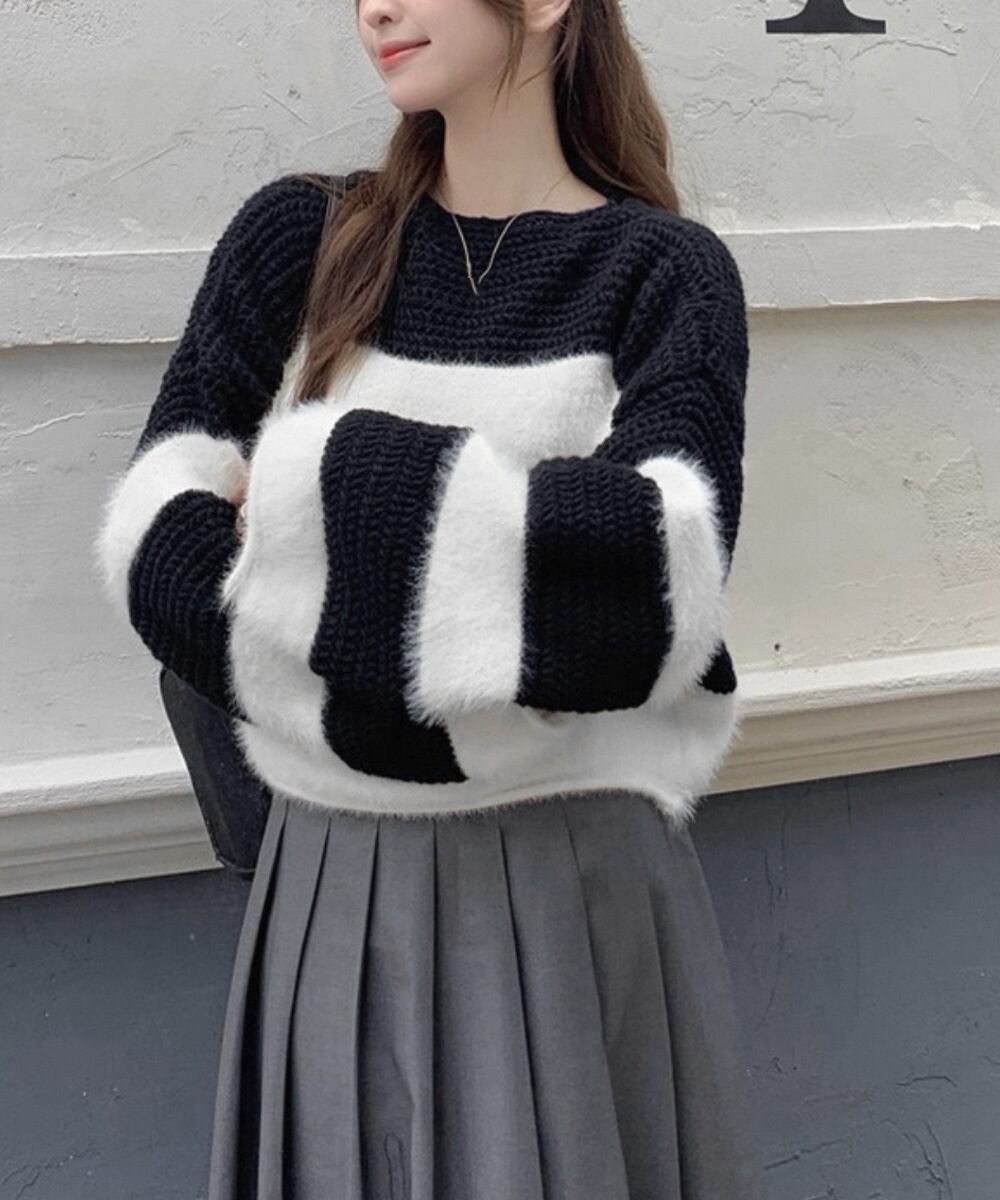 ふわふわのファー素材とざっくり編みを組み合わせたバイカラーニット。