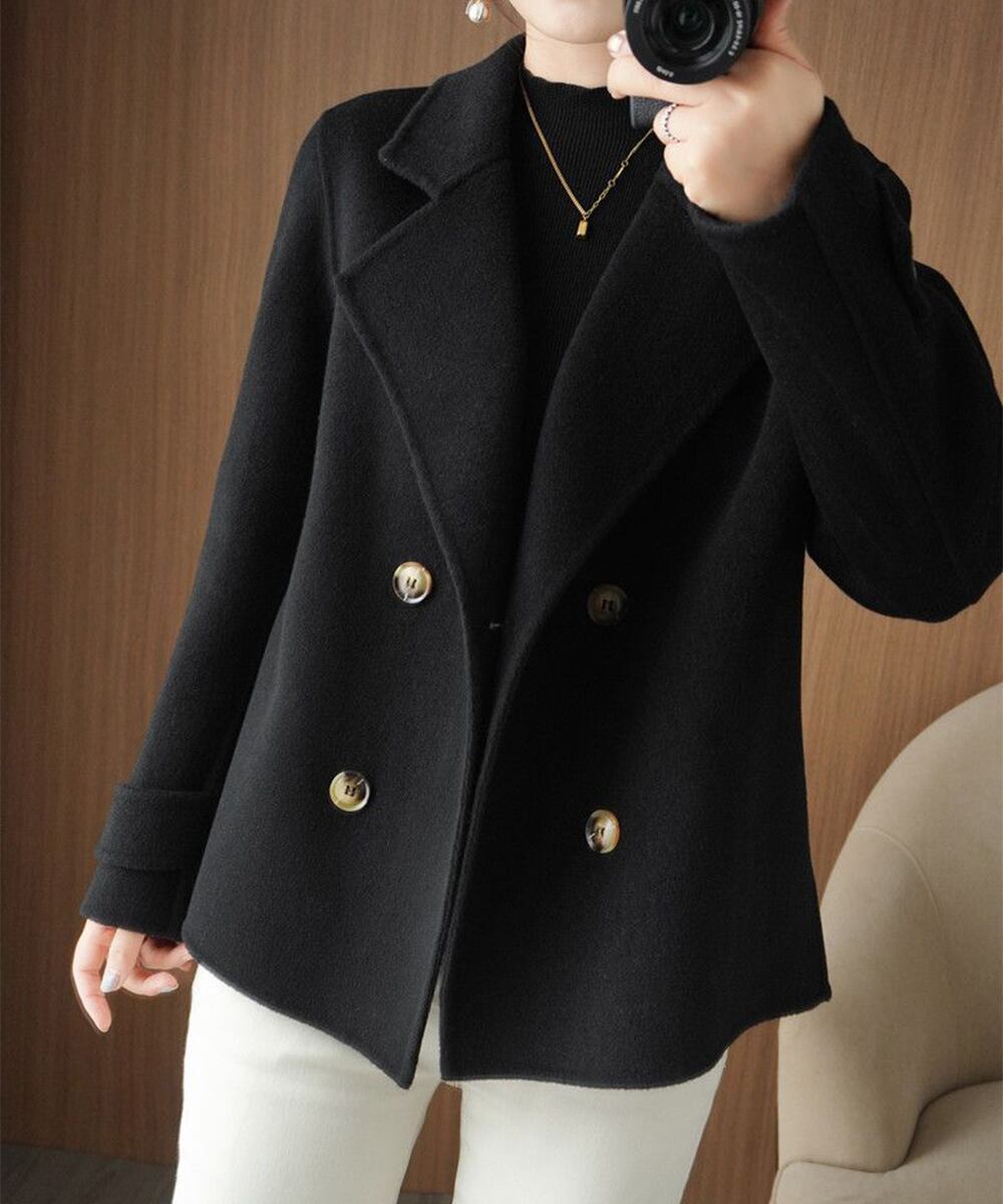落ち着いた上品さと大人の雰囲気を添える、ウールライク素材のダブルブレストショートコート。