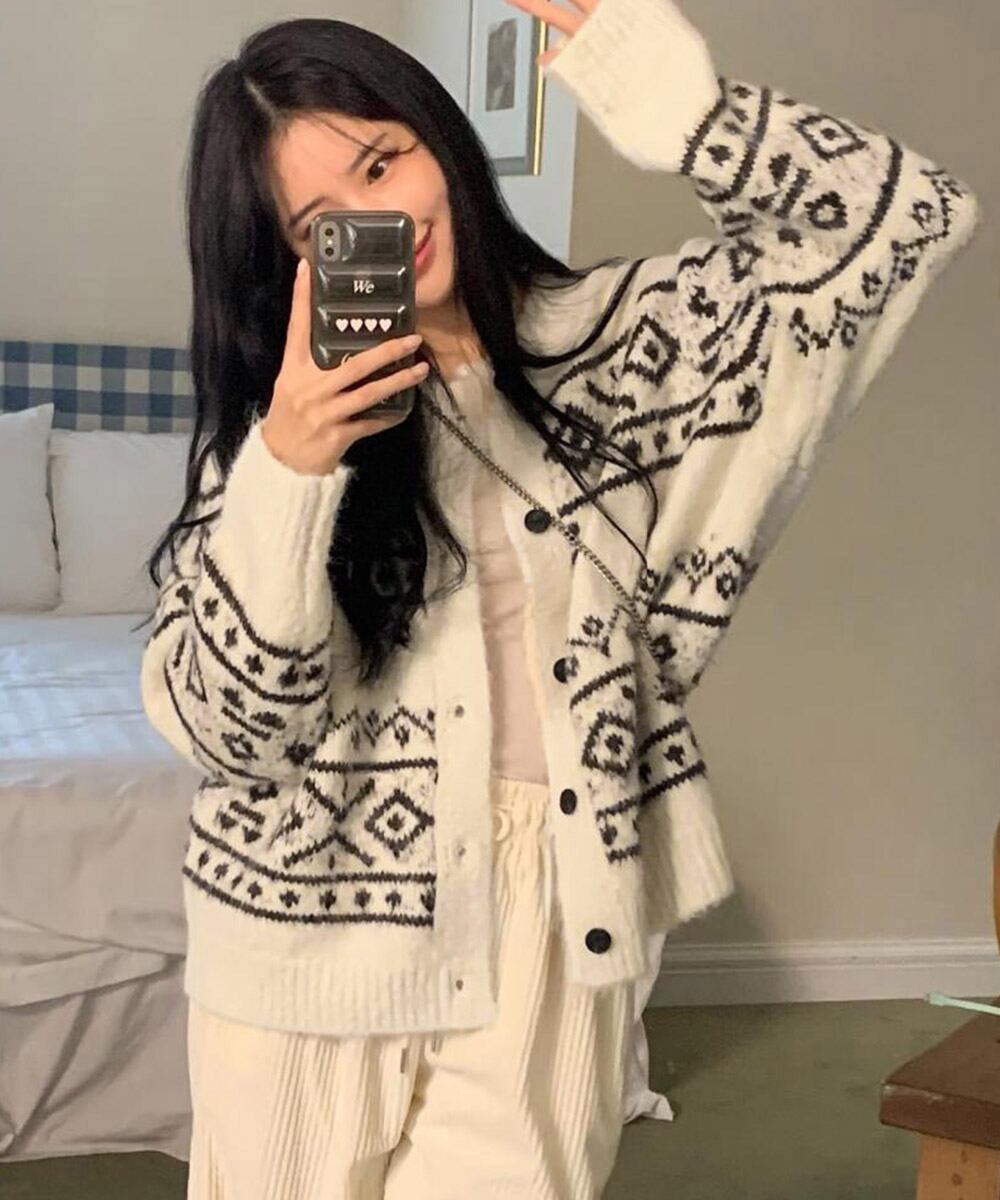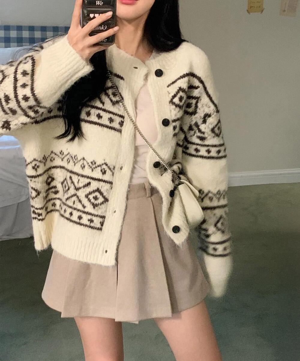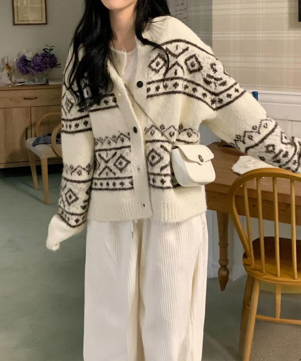 ノルディック柄が目を惹くジャカード編みのニットカーディガン。