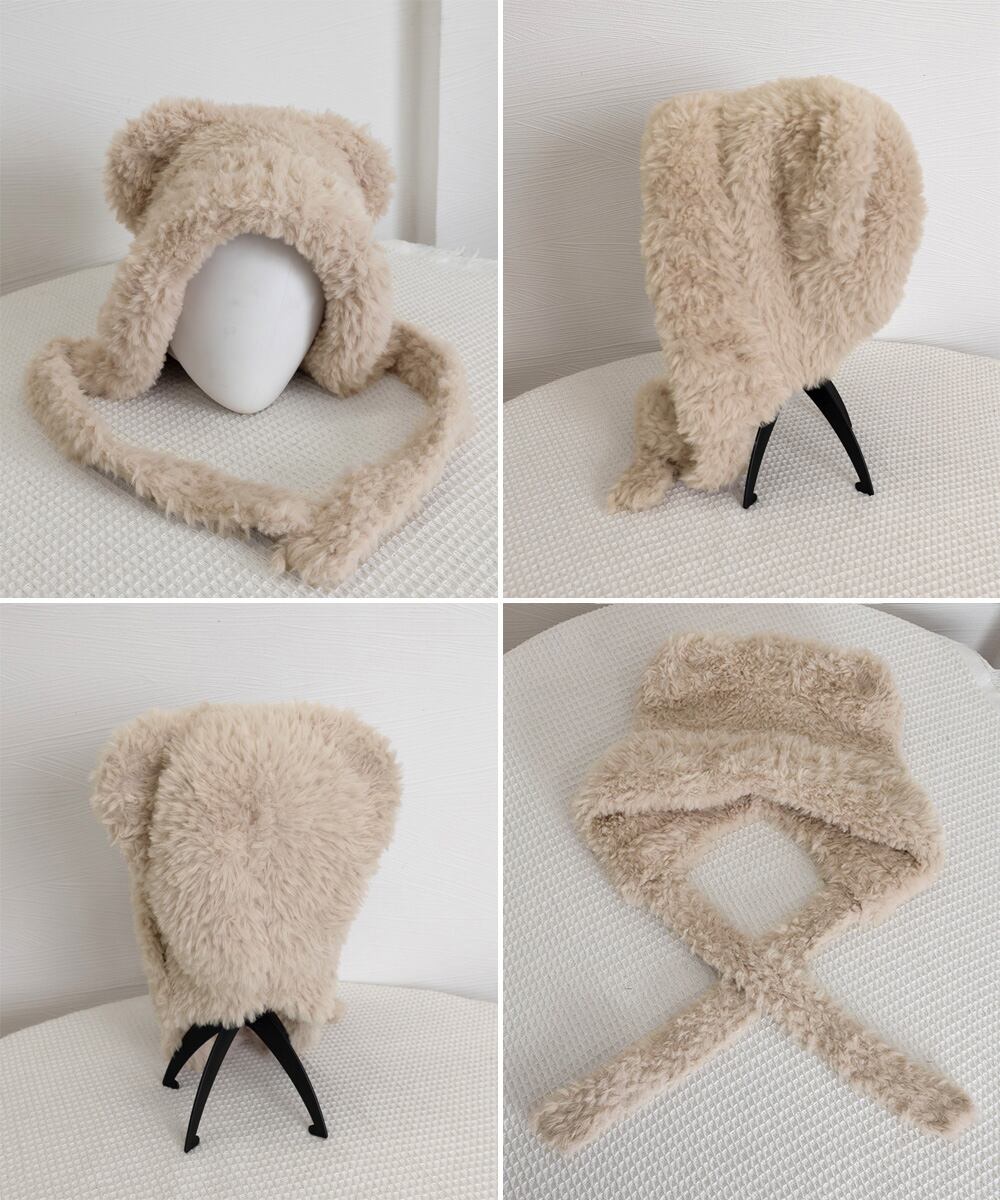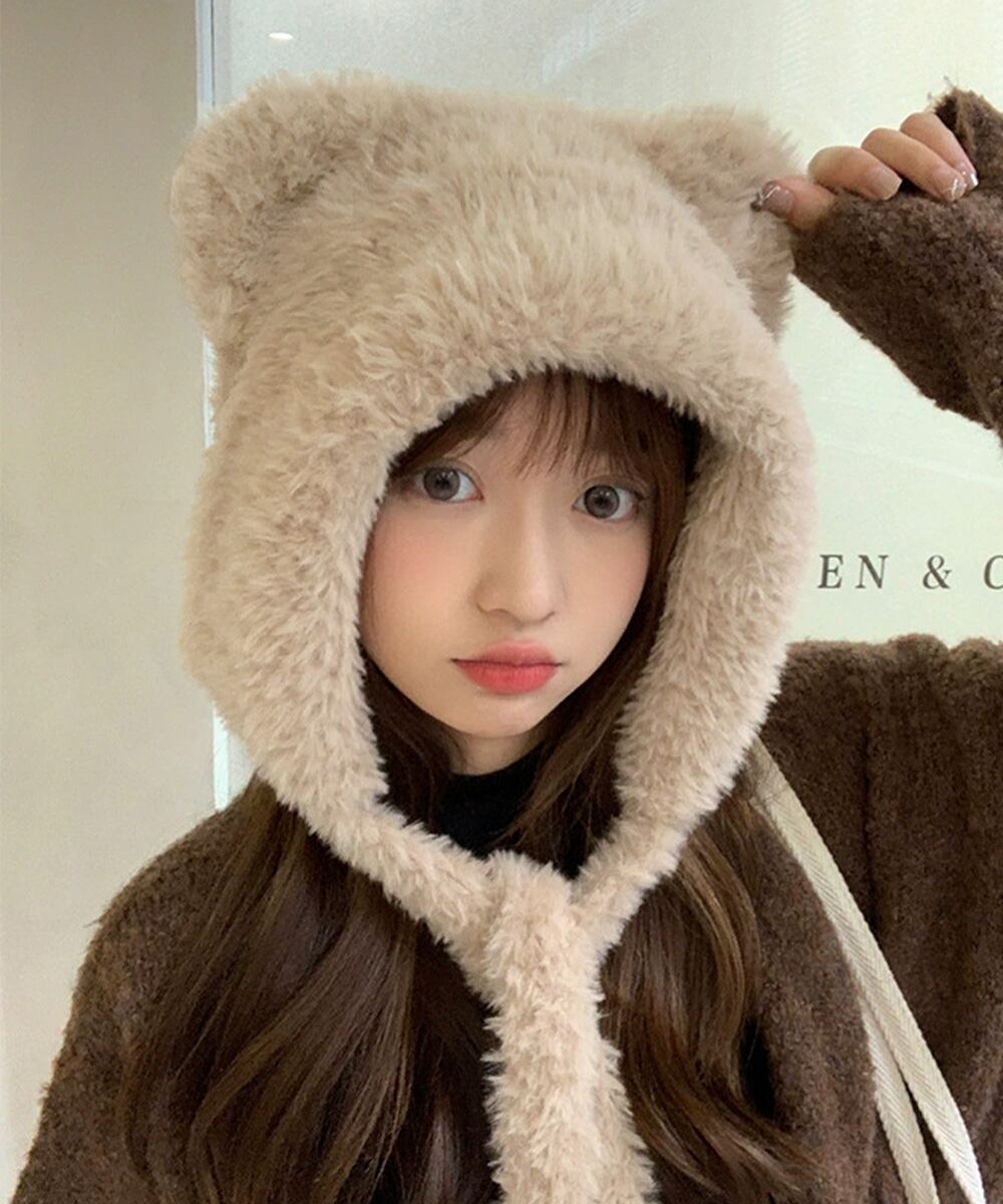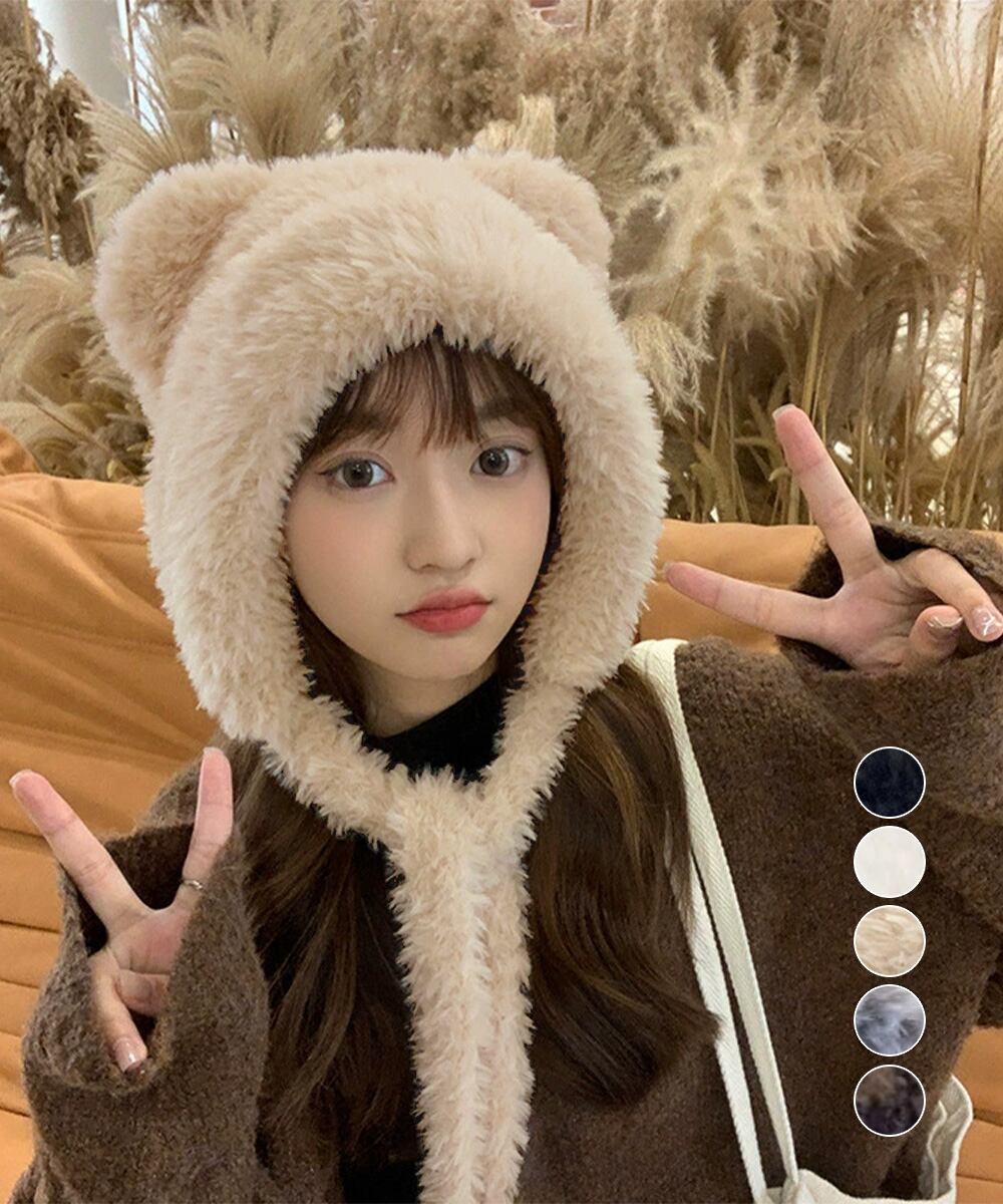 ふわふわのベア耳が愛らしい、秋冬ムードたっぷりのニット素材の帽子。
