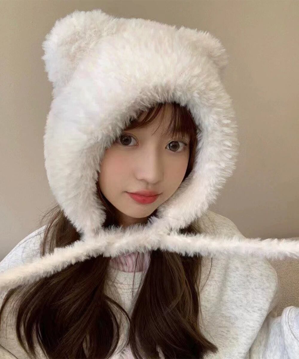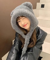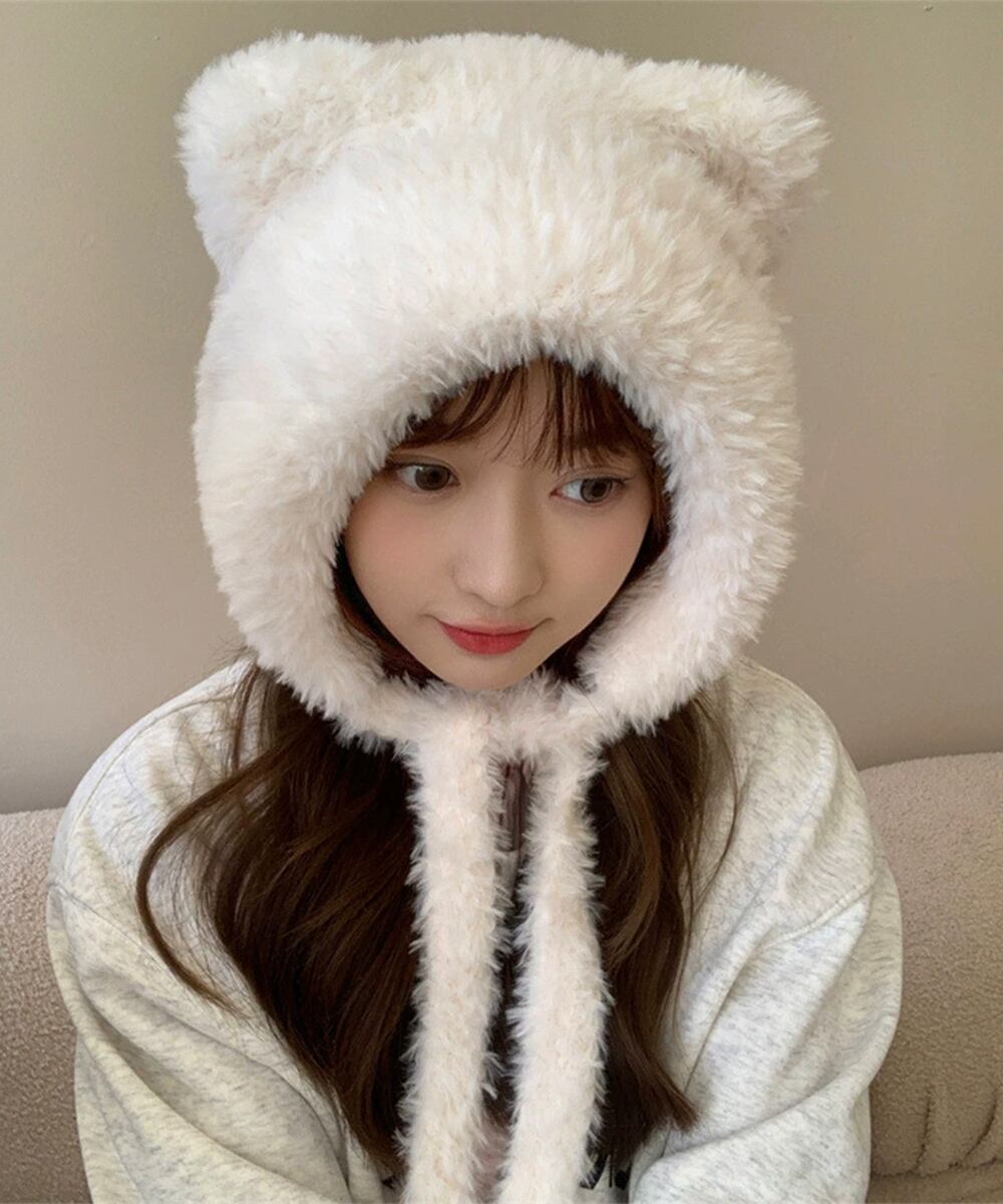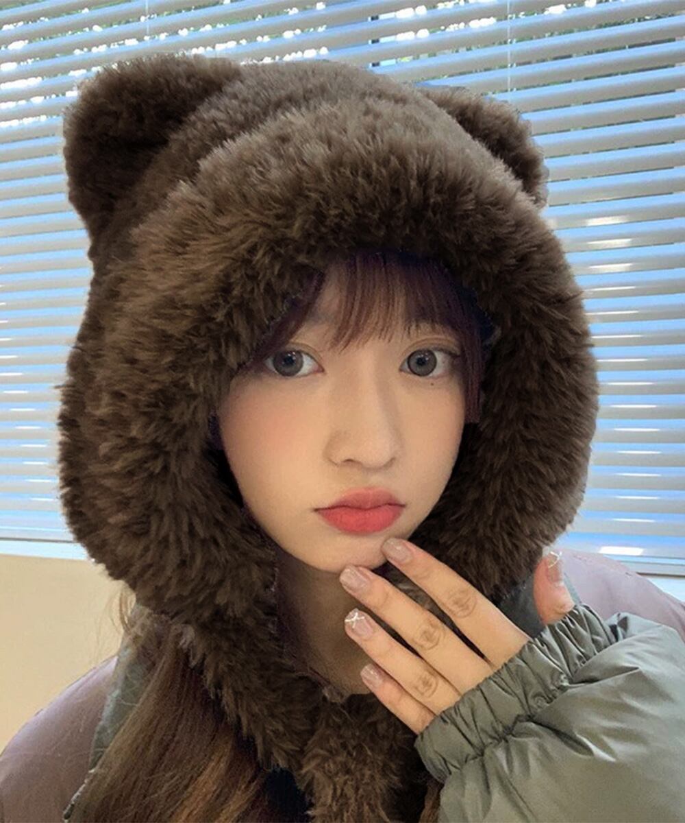 ふわふわのベア耳が愛らしい、秋冬ムードたっぷりのニット素材の帽子。