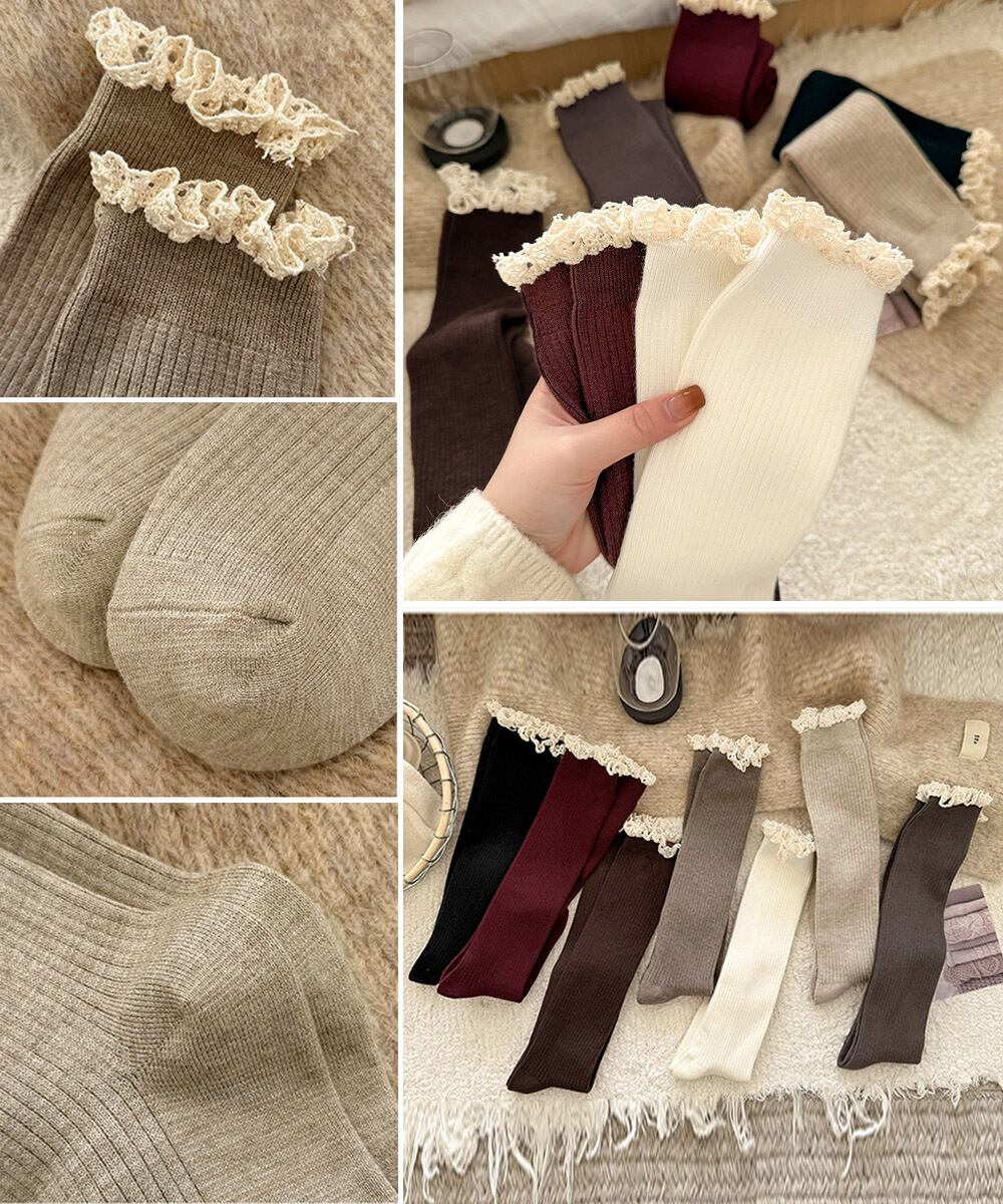 可愛いレースハイソックス レディース カジュアル防寒靴下あったか 春秋冬リブソックス 無地ルームソックス冷え対策美脚脚長