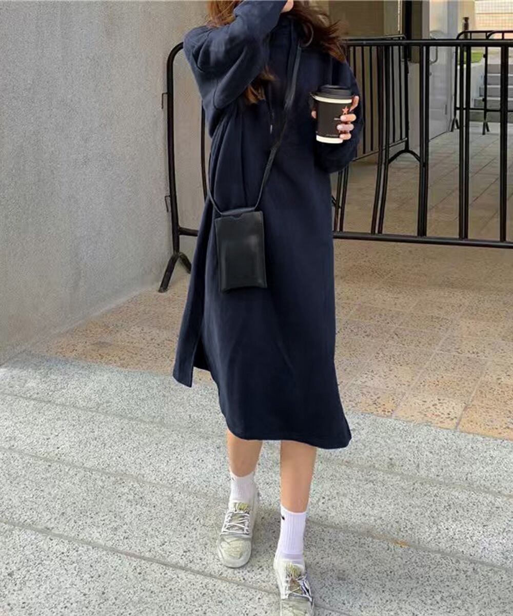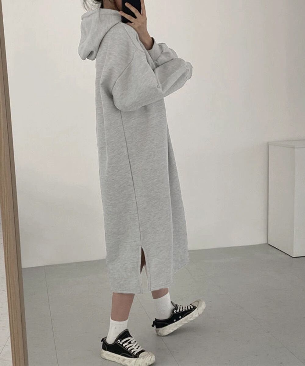 秋冬に嬉しいあたたかさと着心地の良さを兼ね備えたロング丈パーカーワンピース。