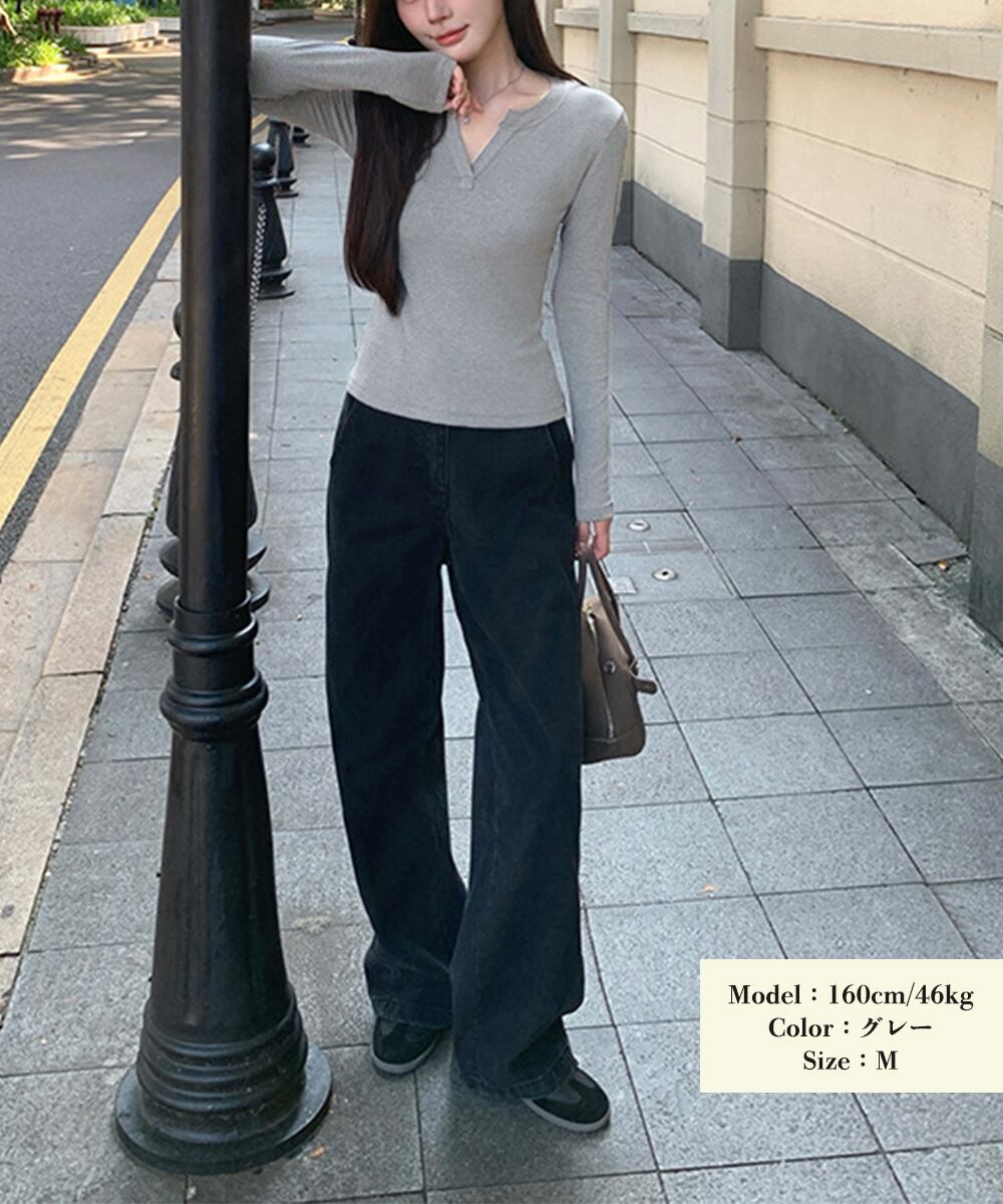 胸元の小さなVカットがさりげないアクセントになり、大人っぽい雰囲気で着られる一枚。