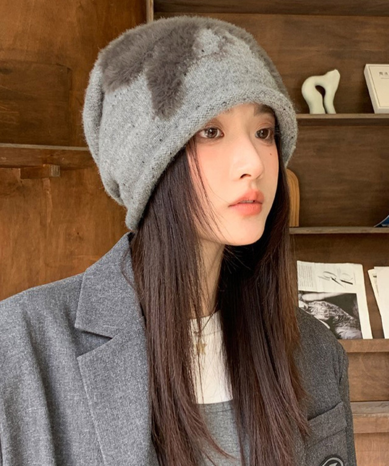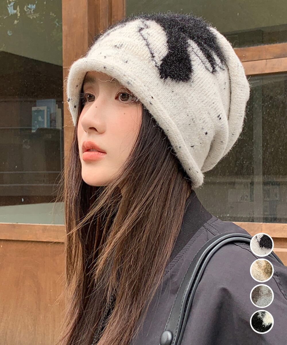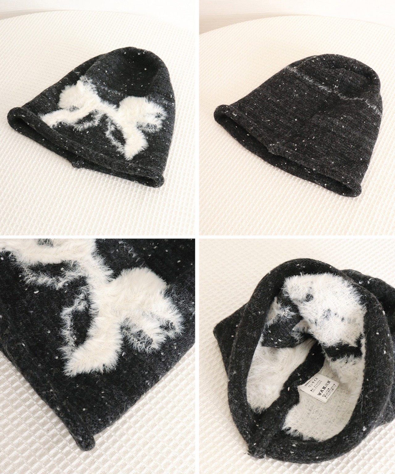 ふわふわ素材のリボン柄がポイントになった、ニットビーニー帽です。