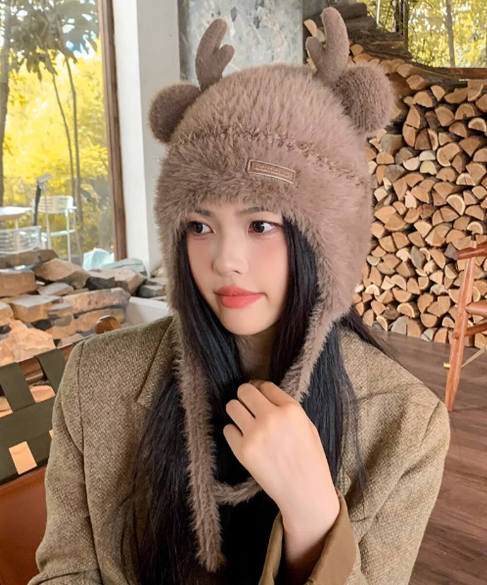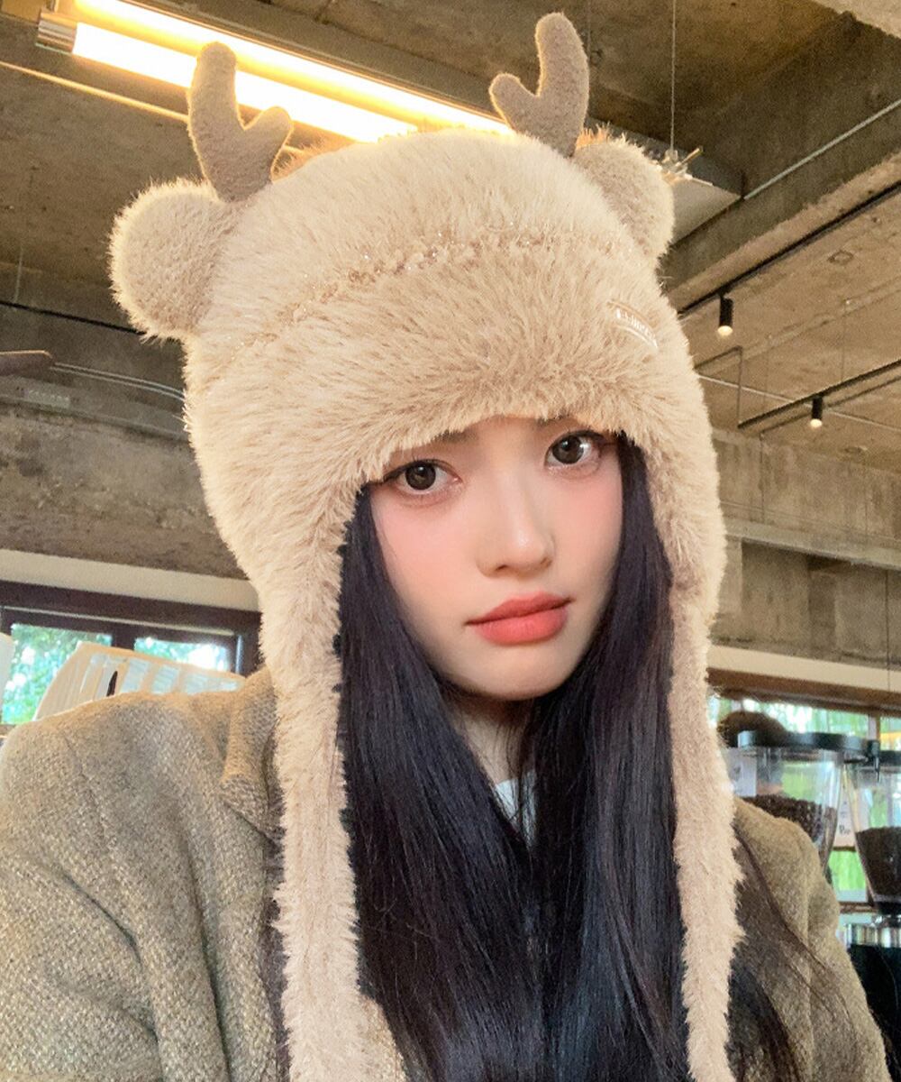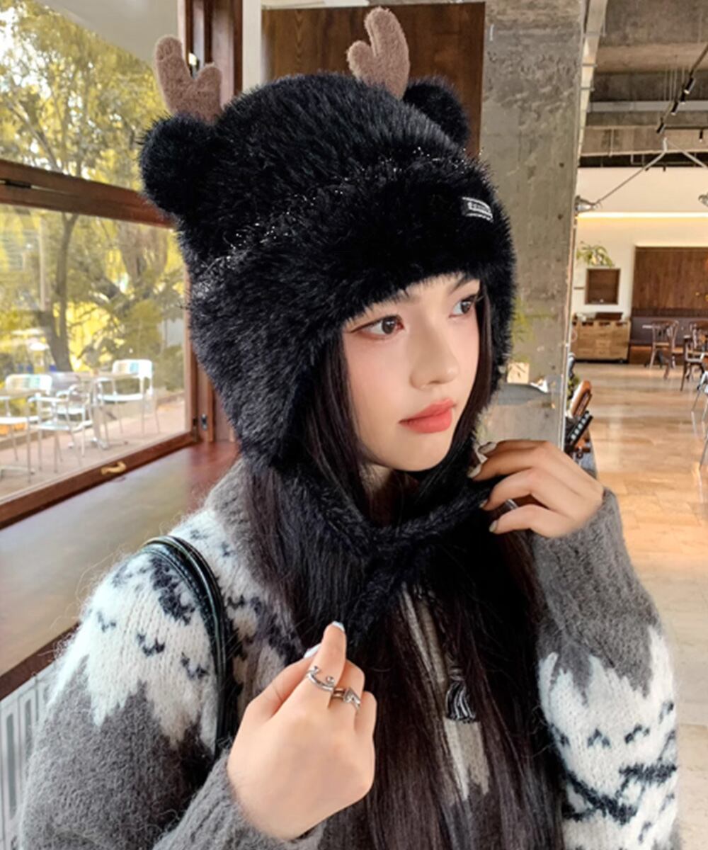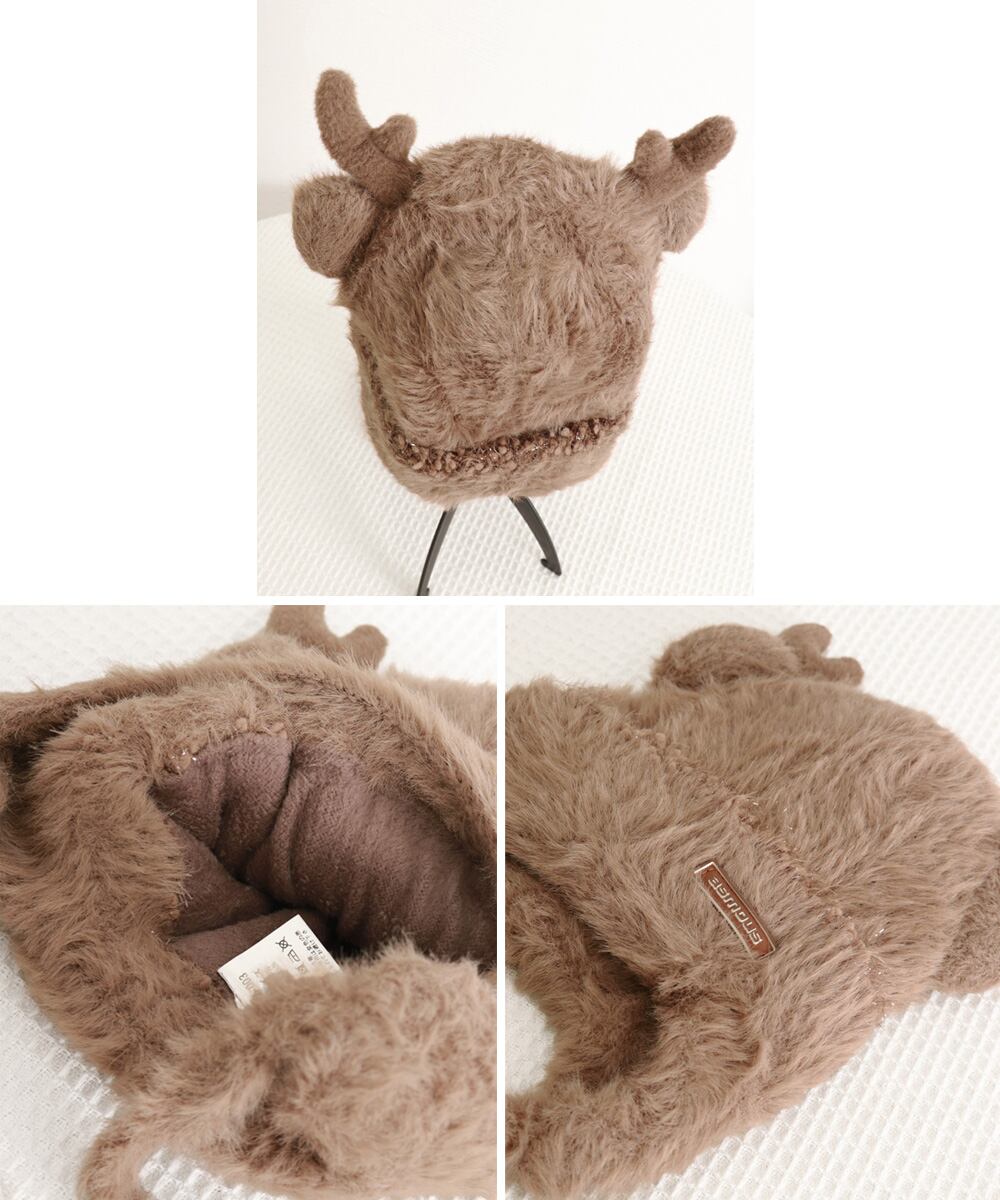 ふわふわ素材が可愛い、もこもこ鹿角とくま耳帽子。