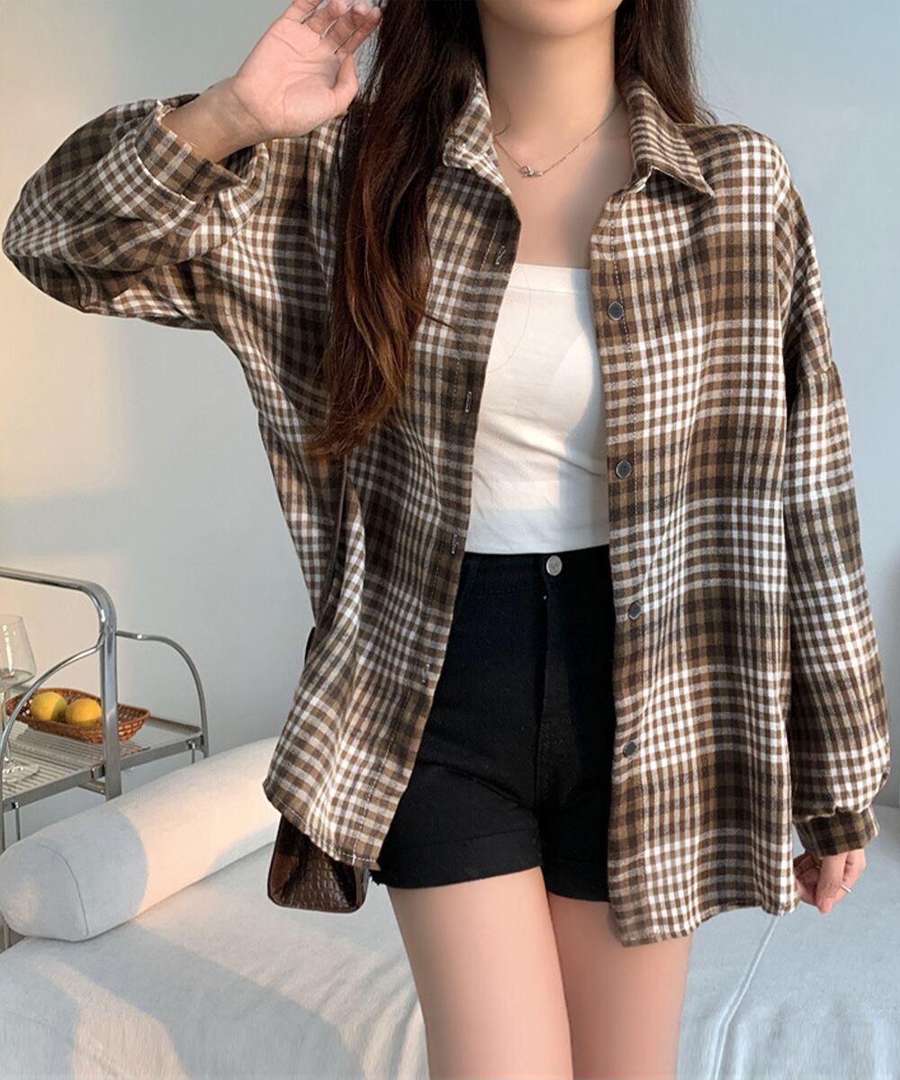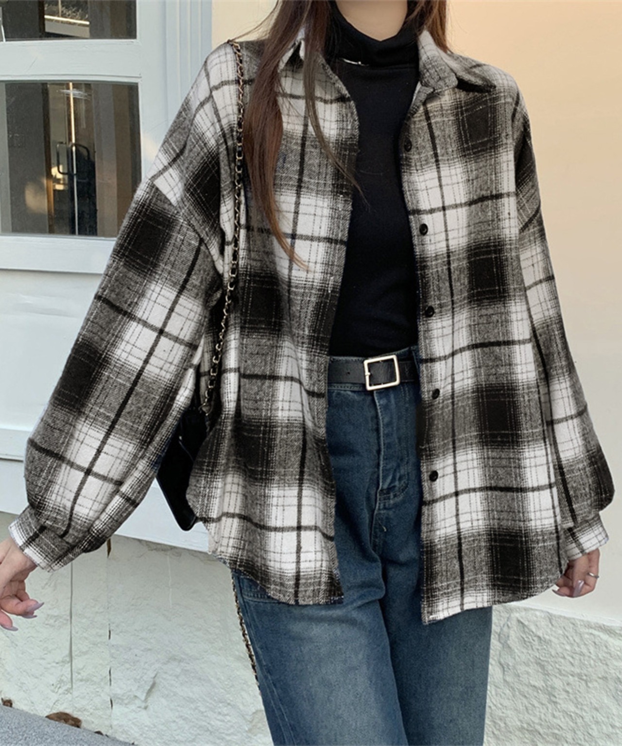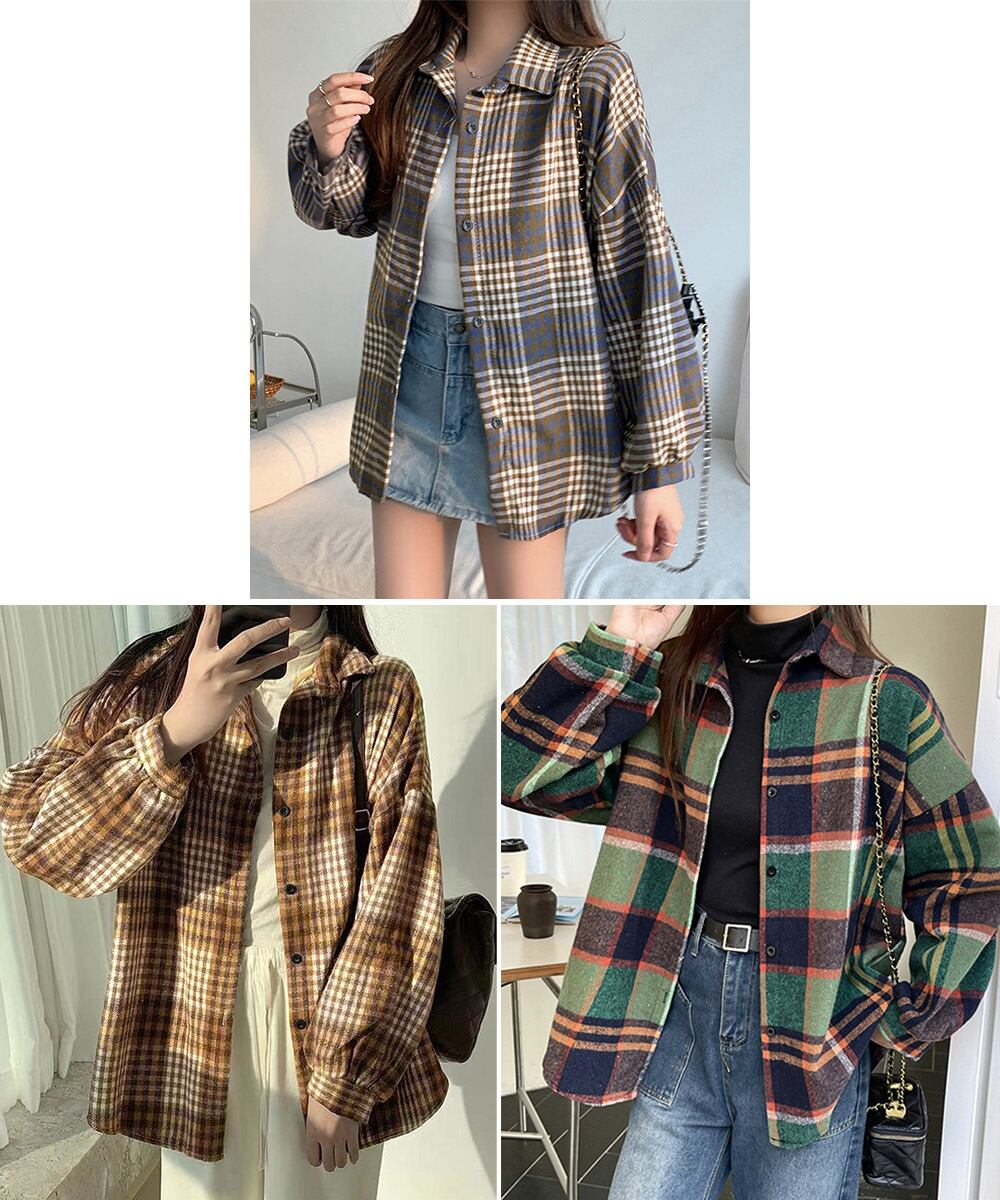 チェック柄羽織り秋 着やせシャツ韓国風 起毛シャツブラウス