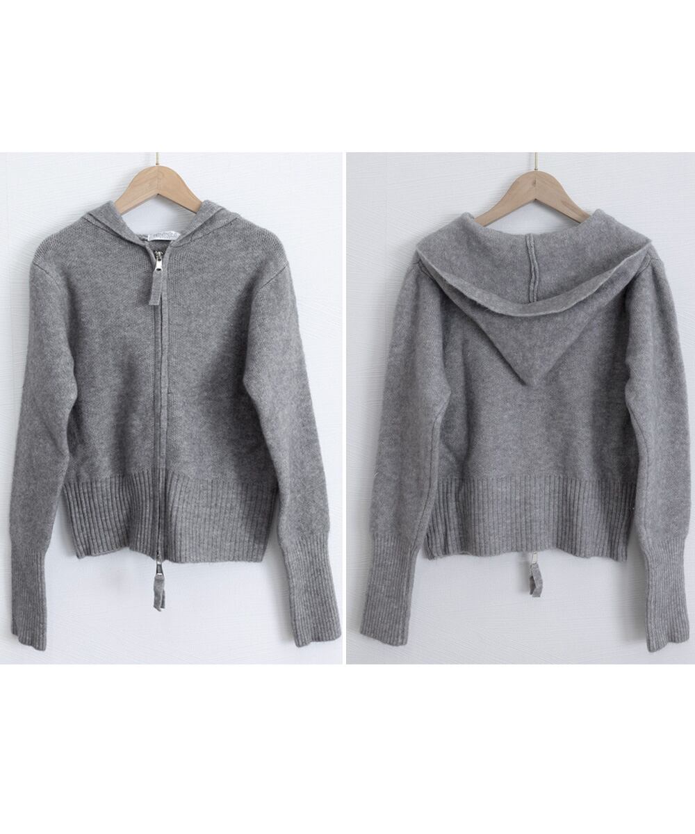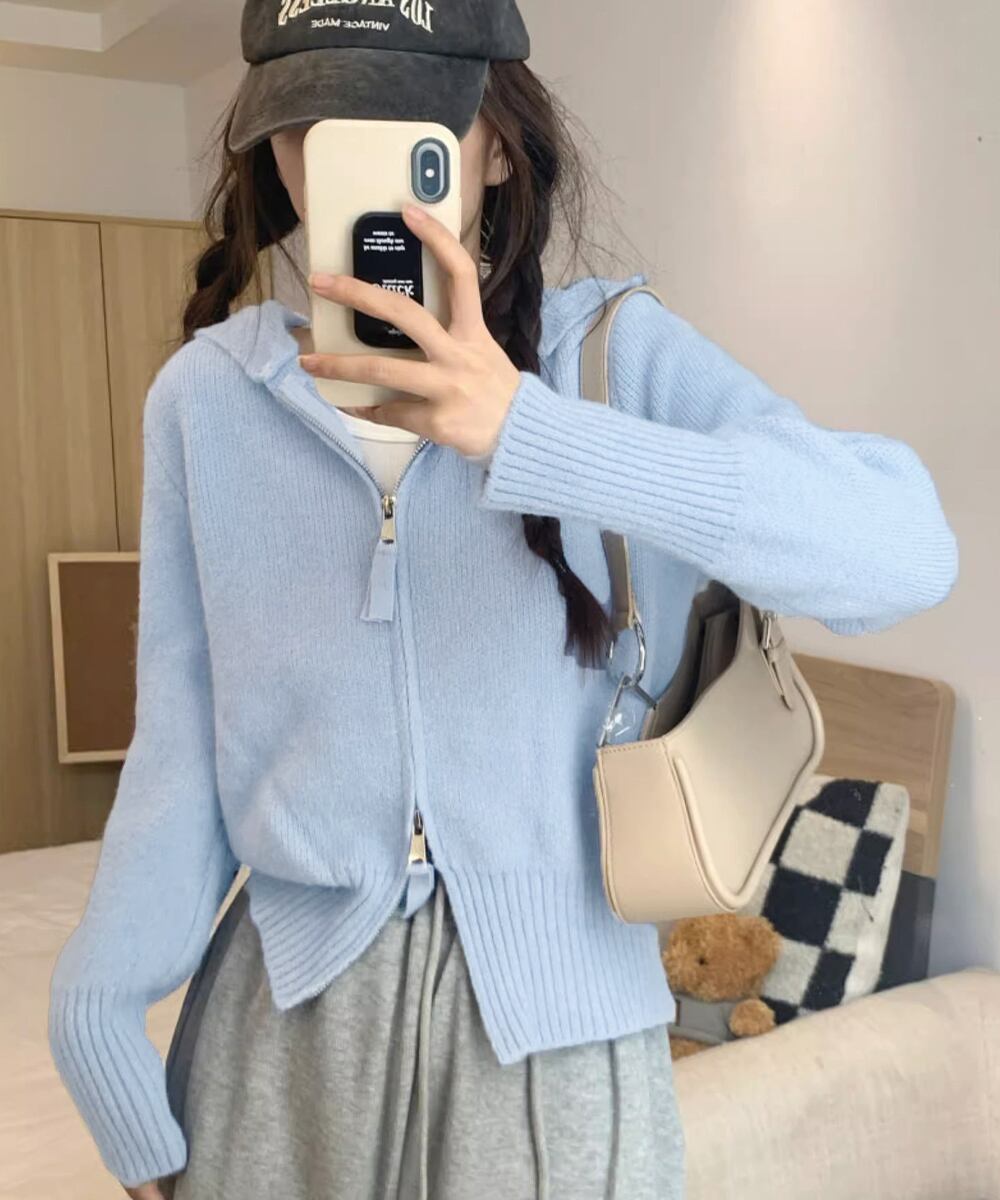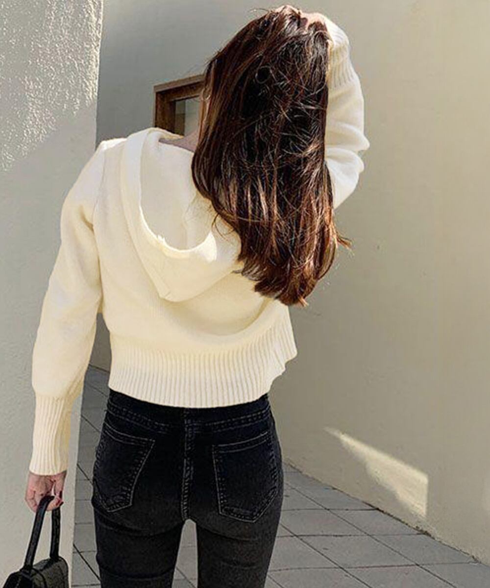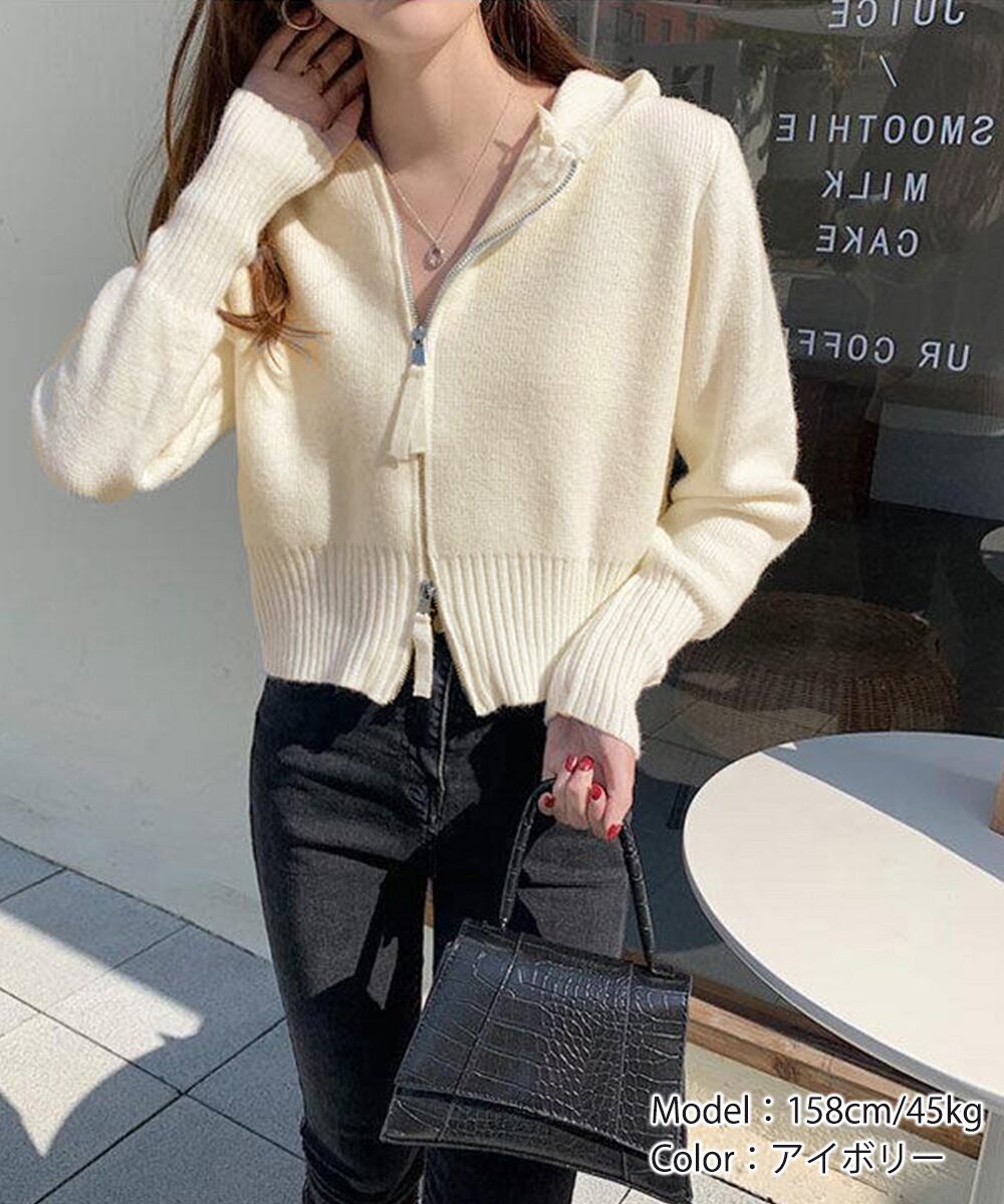 2WAYショート丈ニットトップス フード付き 前開き長袖ZIPニットセーター あったか中厚手ニット 通勤通学ニットウェア