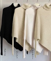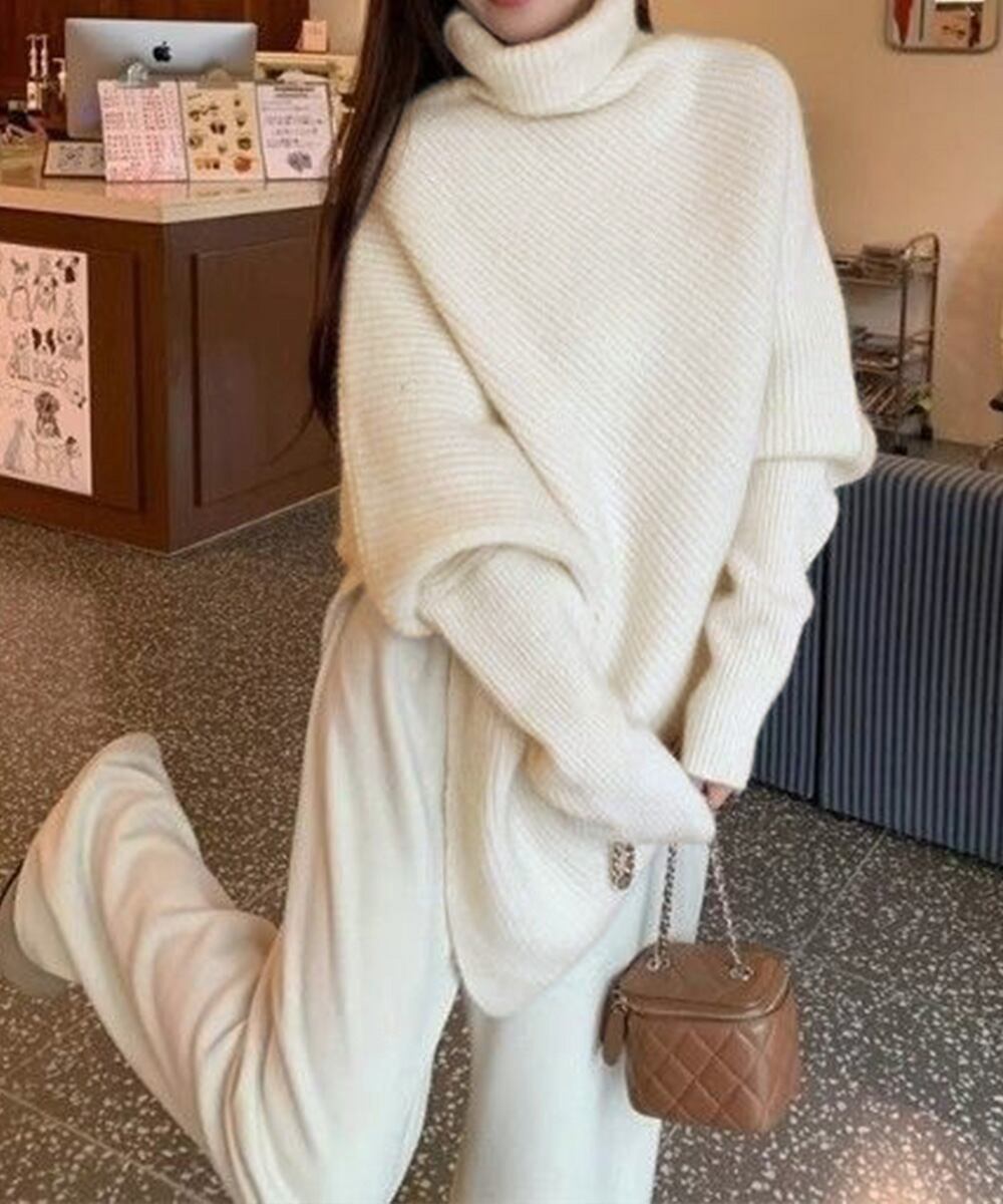 ハイネックとアシンメトリーなデザインが目を引くバットウィングスリーブニットセーター。