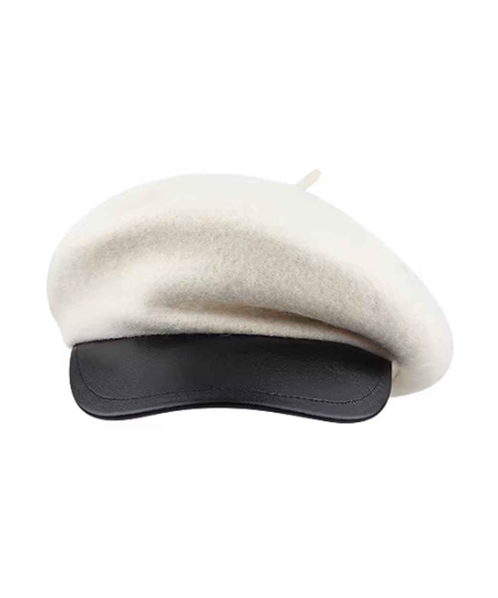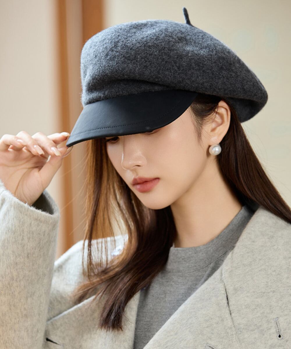 ベレー帽とキャスケットを組み合わせた、トレンド感のあるつば付き帽子。