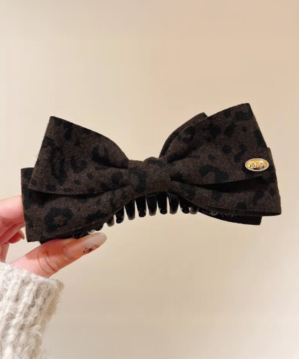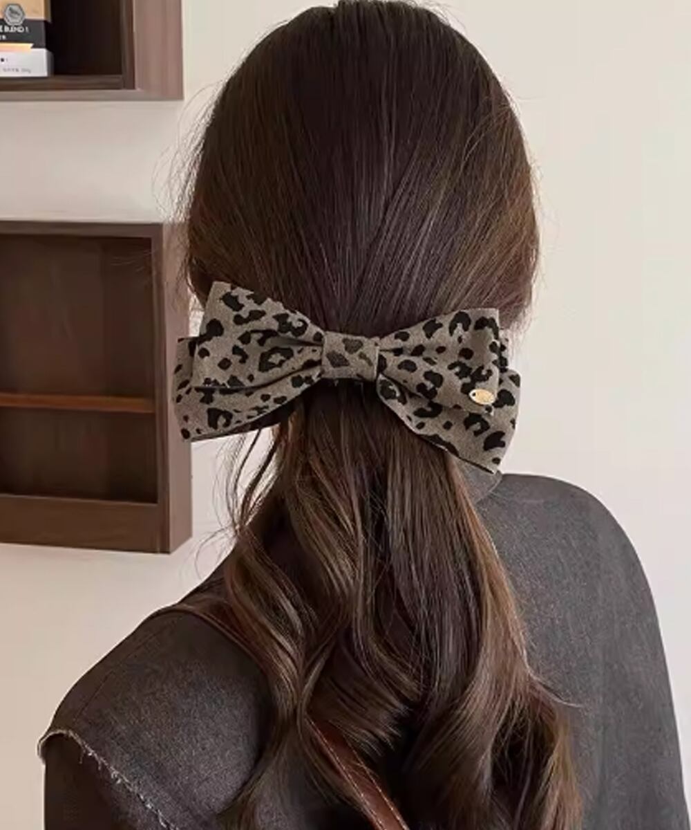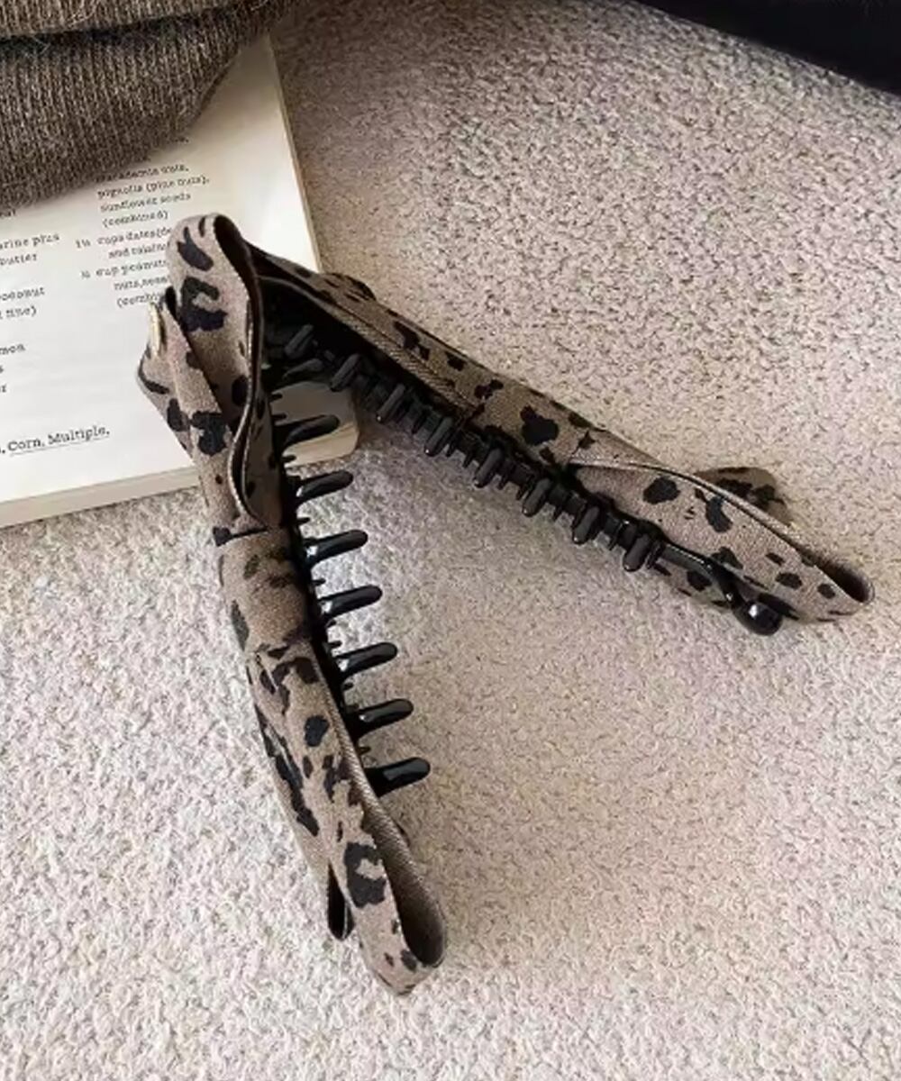 落ち着いたトーンのレオパード柄が大人っぽい印象のファブリックバナナクリップ。