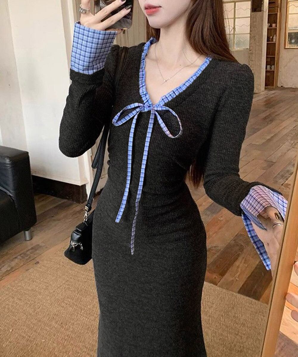 【日本倉庫からの発送】 配色リボンニットマーメイドワンピース長袖 #[84YGL-009_26800]【送料込み】【260128】