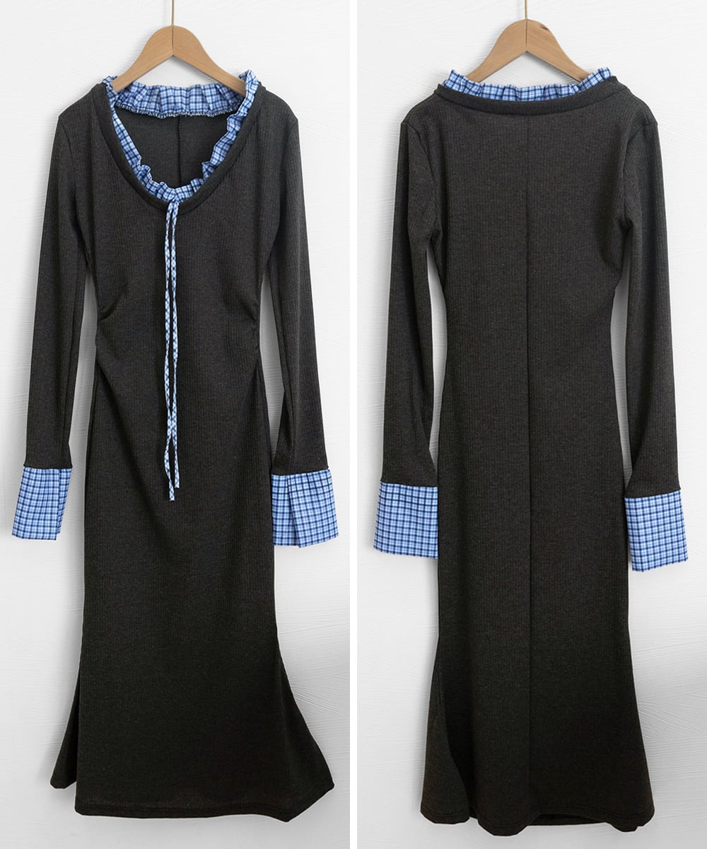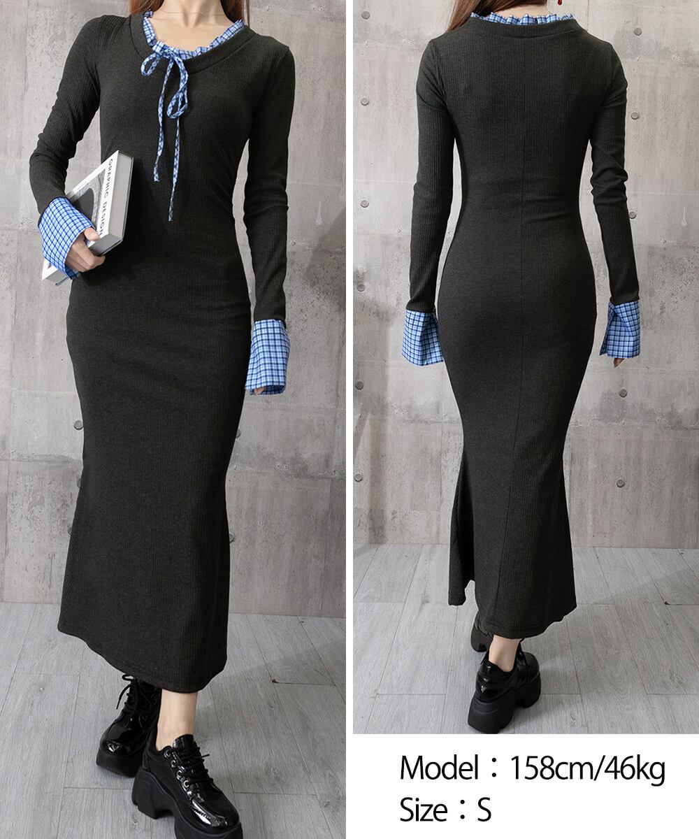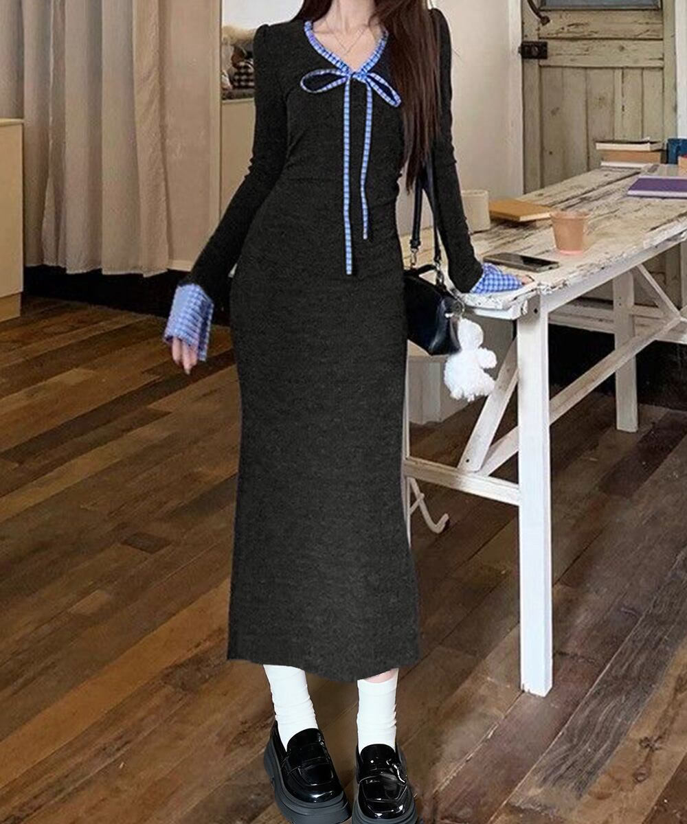 チェック柄の配色パイピングとリボンがポイントのロング丈ニットワンピース。