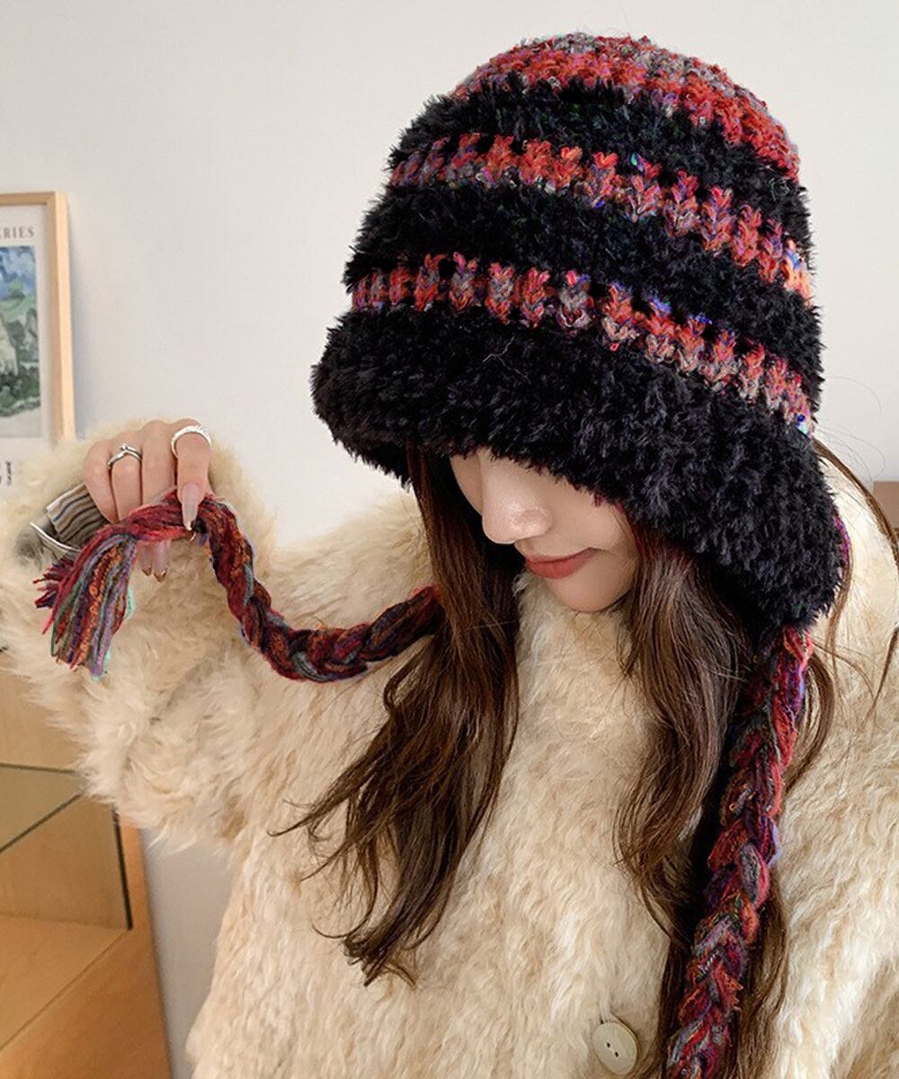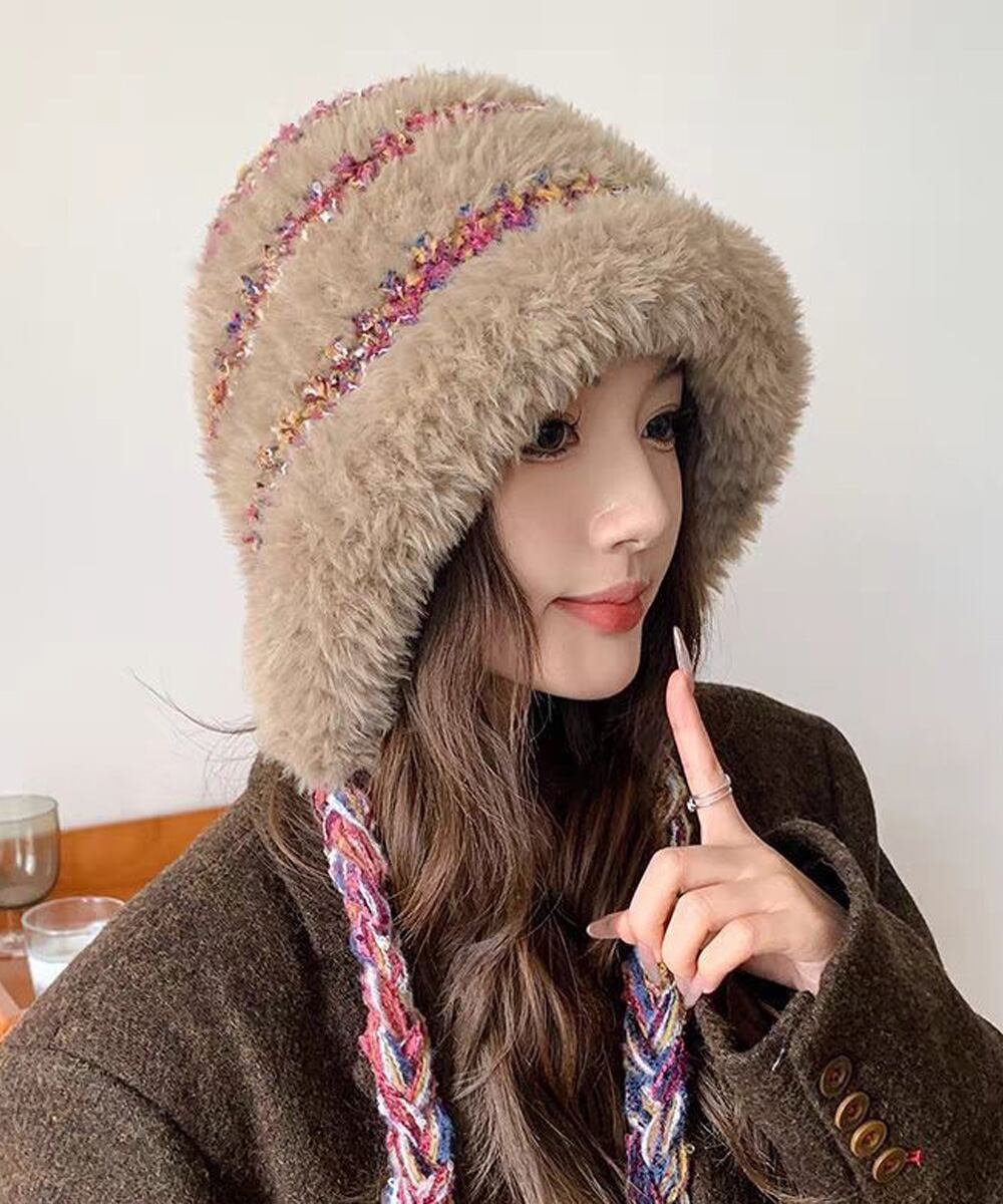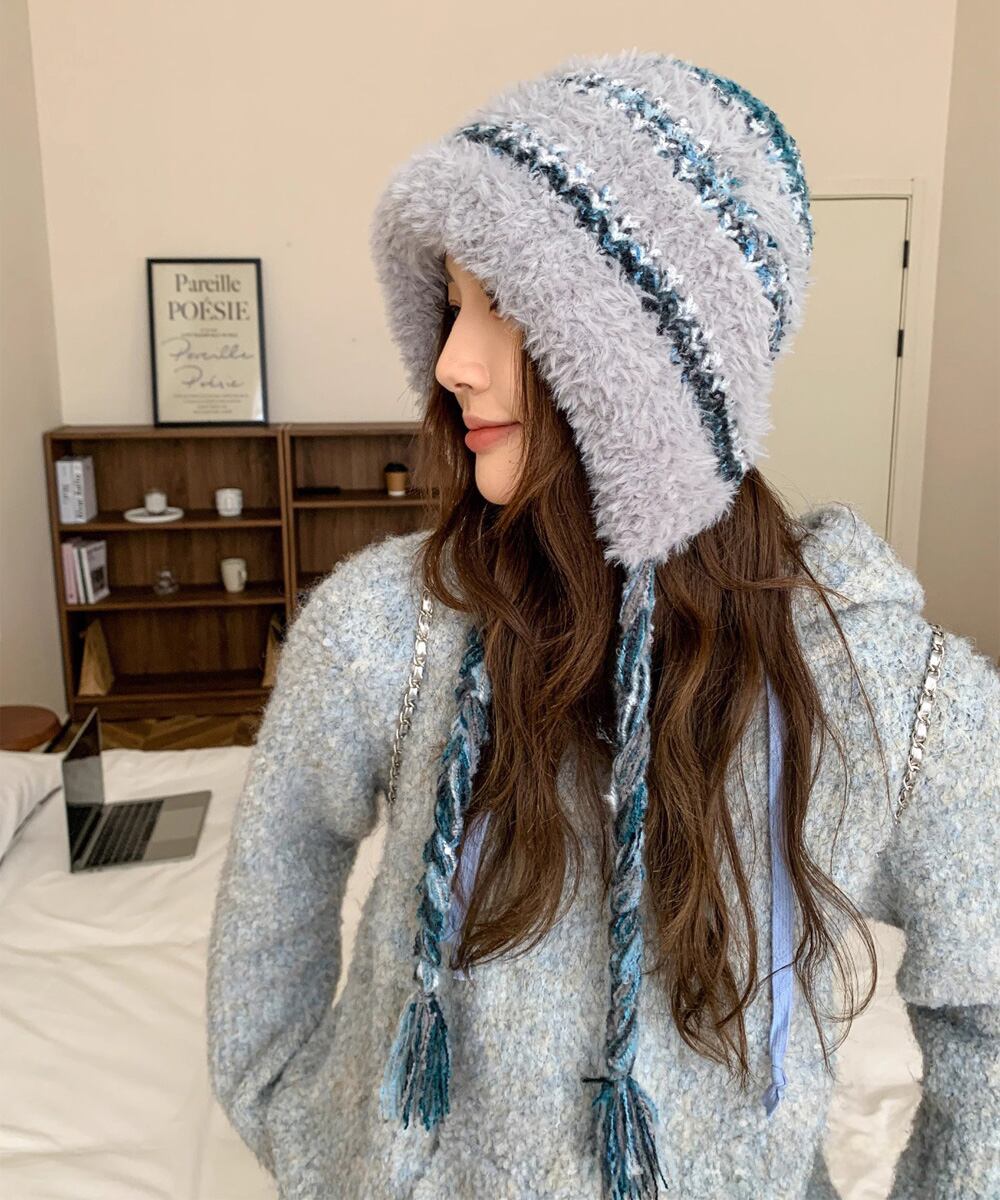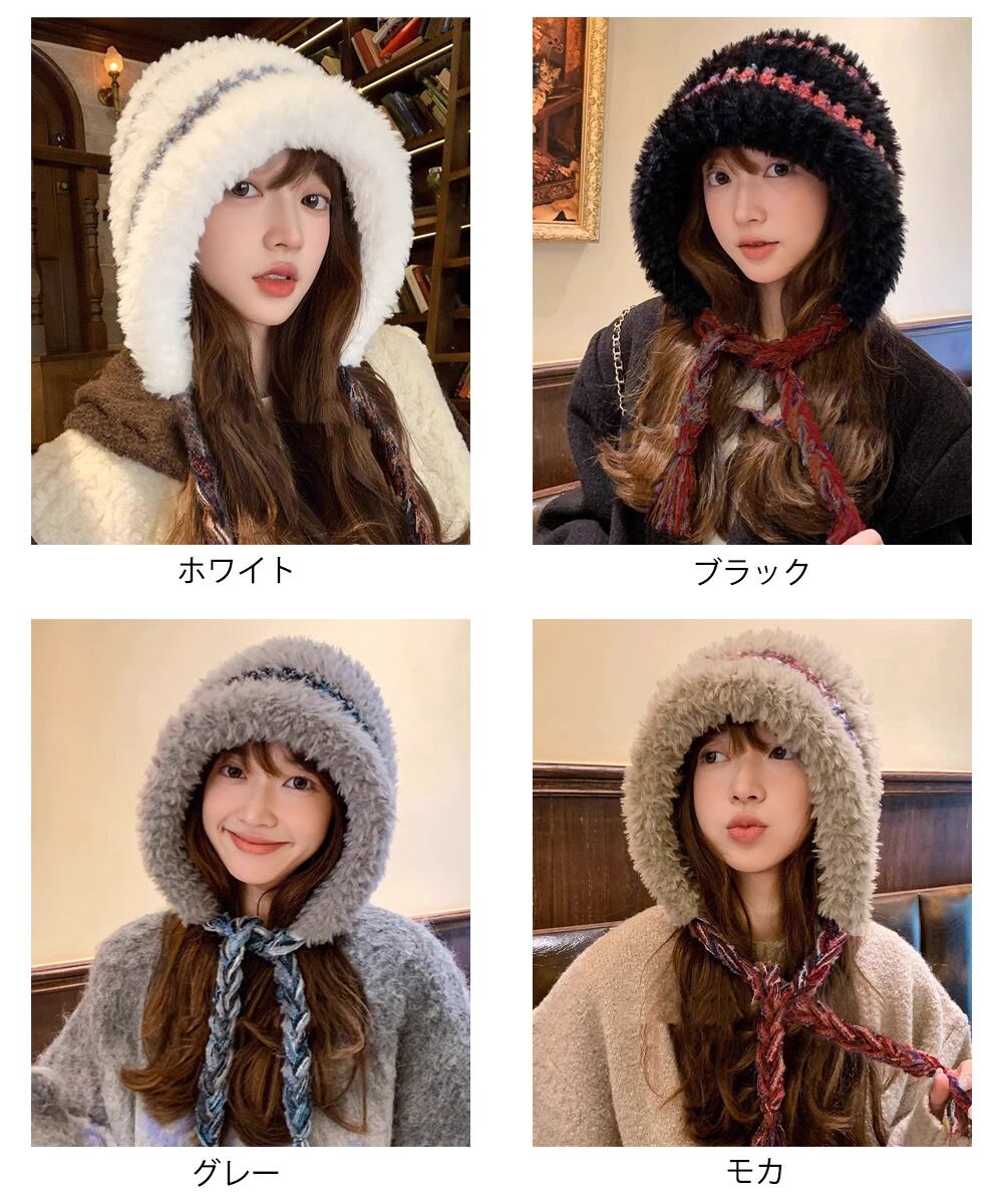 あったか帽子秋冬用 もふもふ帽子紐付き 小顔見せニット帽子