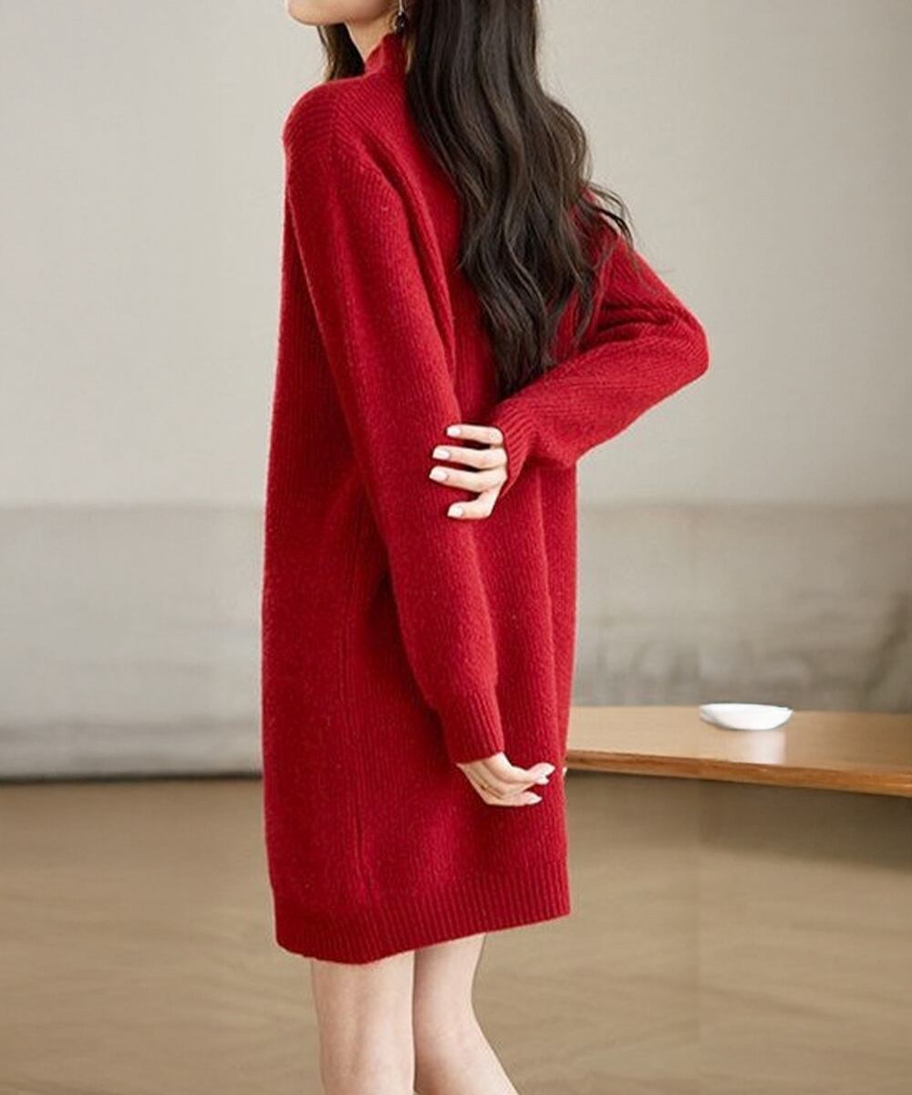 ラメ入りリブニットワンピースレディース 体型カバーセーターワンピ きれいめ通勤ワンピース長袖 モックネックワンピ秋冬上品