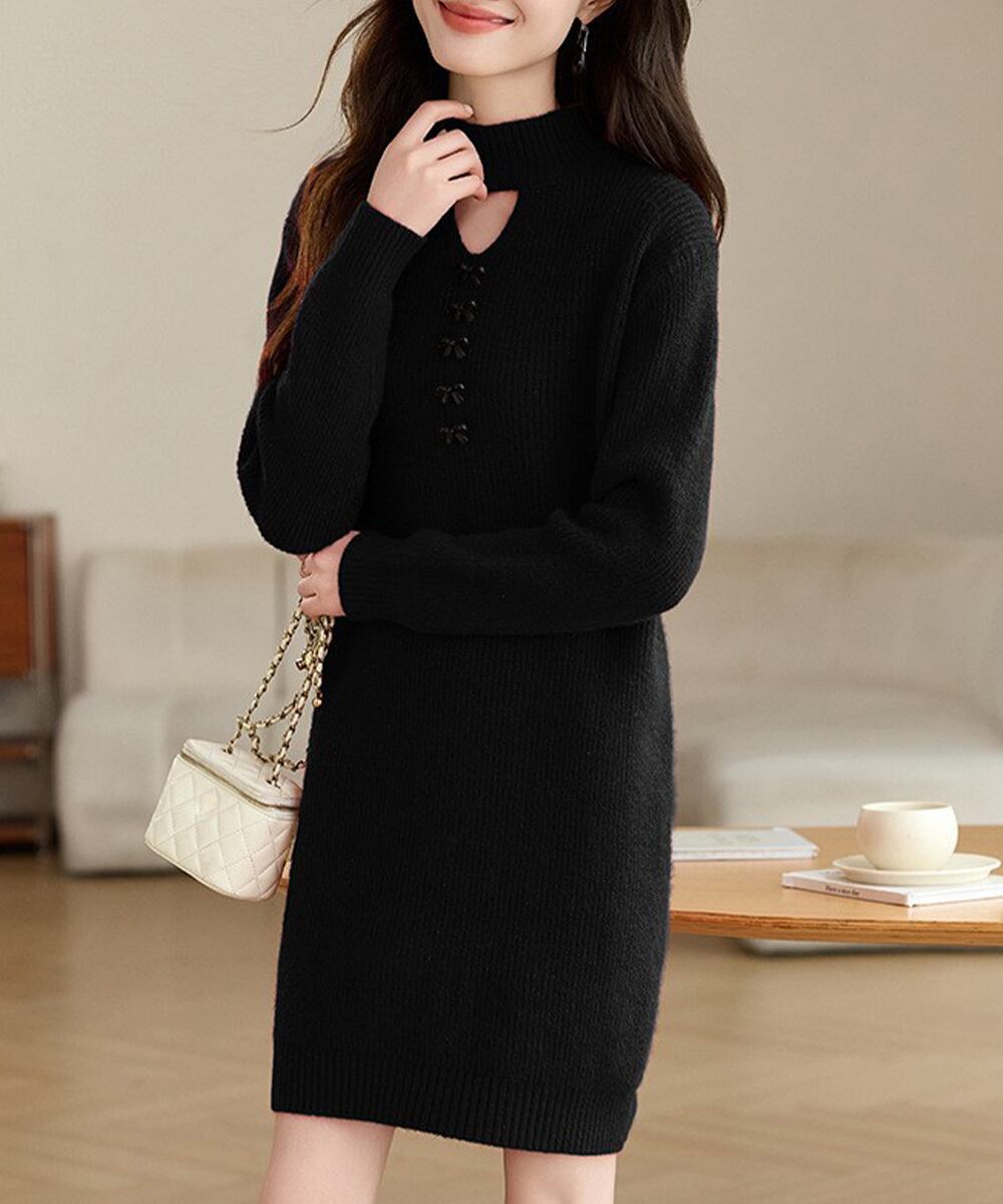 大人ゆったりニット 韓国風ワンピ細見え フェミニンワンピ黒