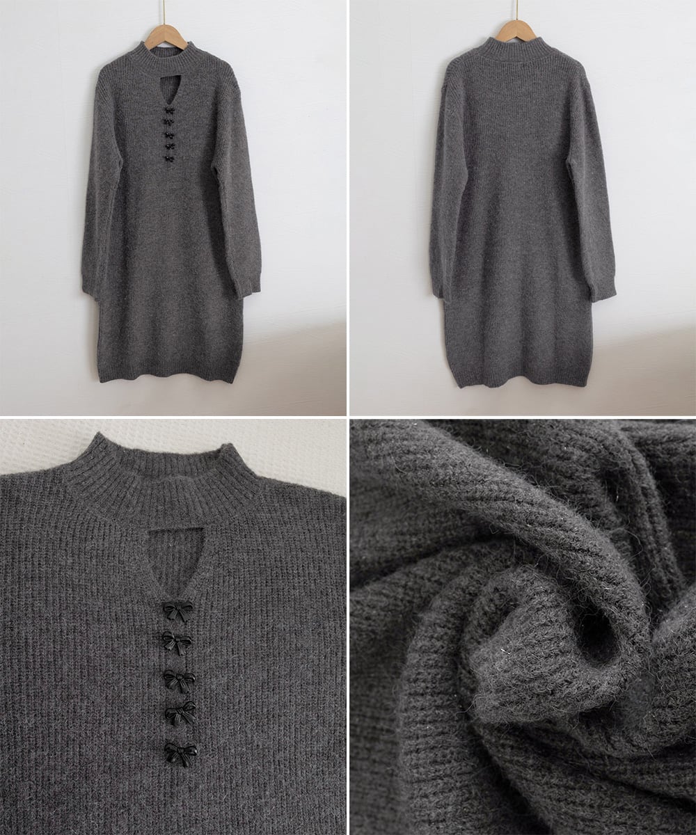 胸元に三角カットアウトとリボン装飾をあしらった、ラメ入りリブニットワンピース。