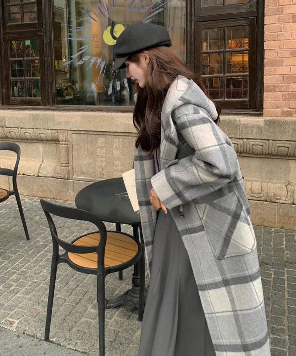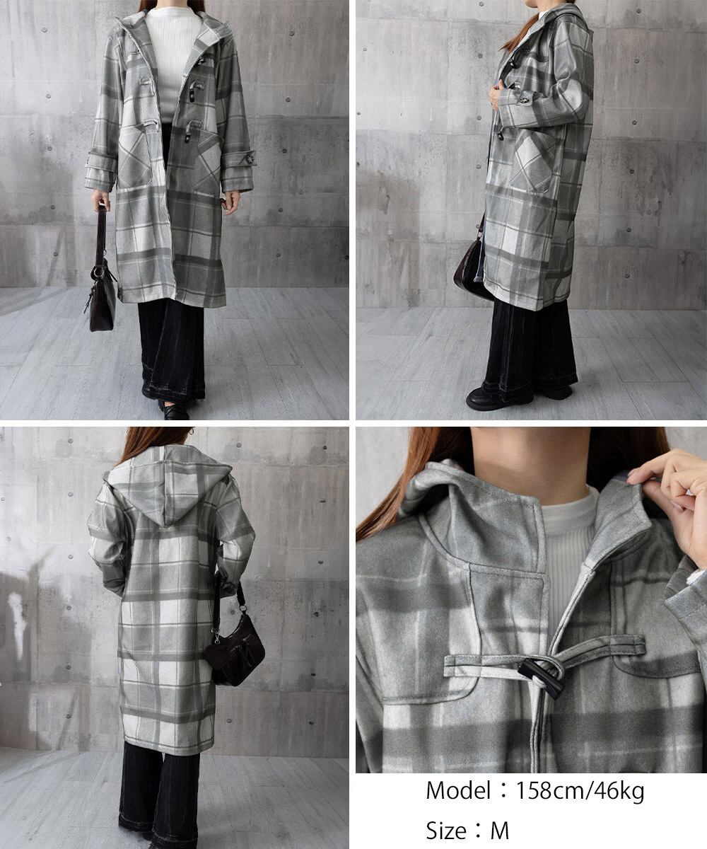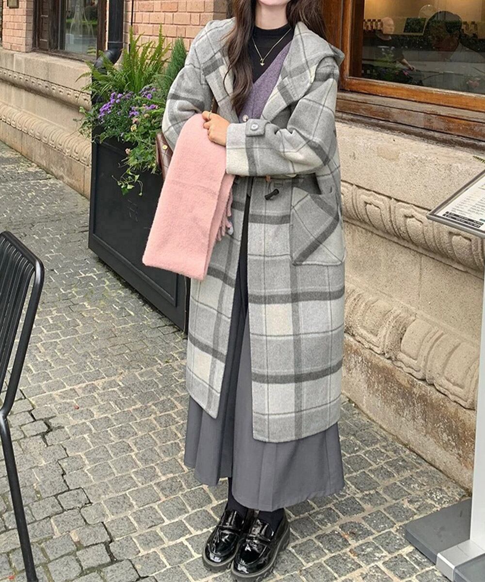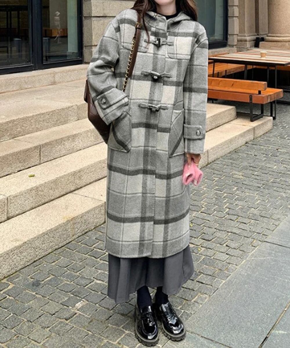 チェック柄とトグルボタンが印象的な、フード付きロングコート。