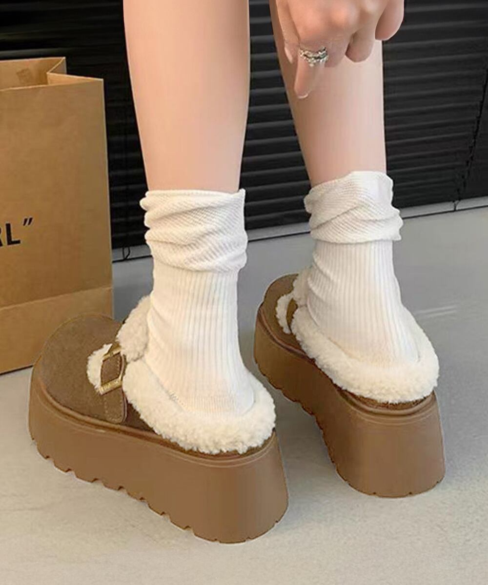 ふわふわプラットシューズ 暖かい冬靴 履きやすい フェイクムートンローファー 歩きやすい もこもこ防寒靴バックルデザイン