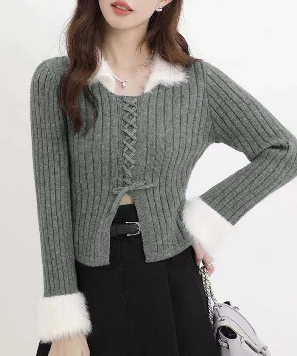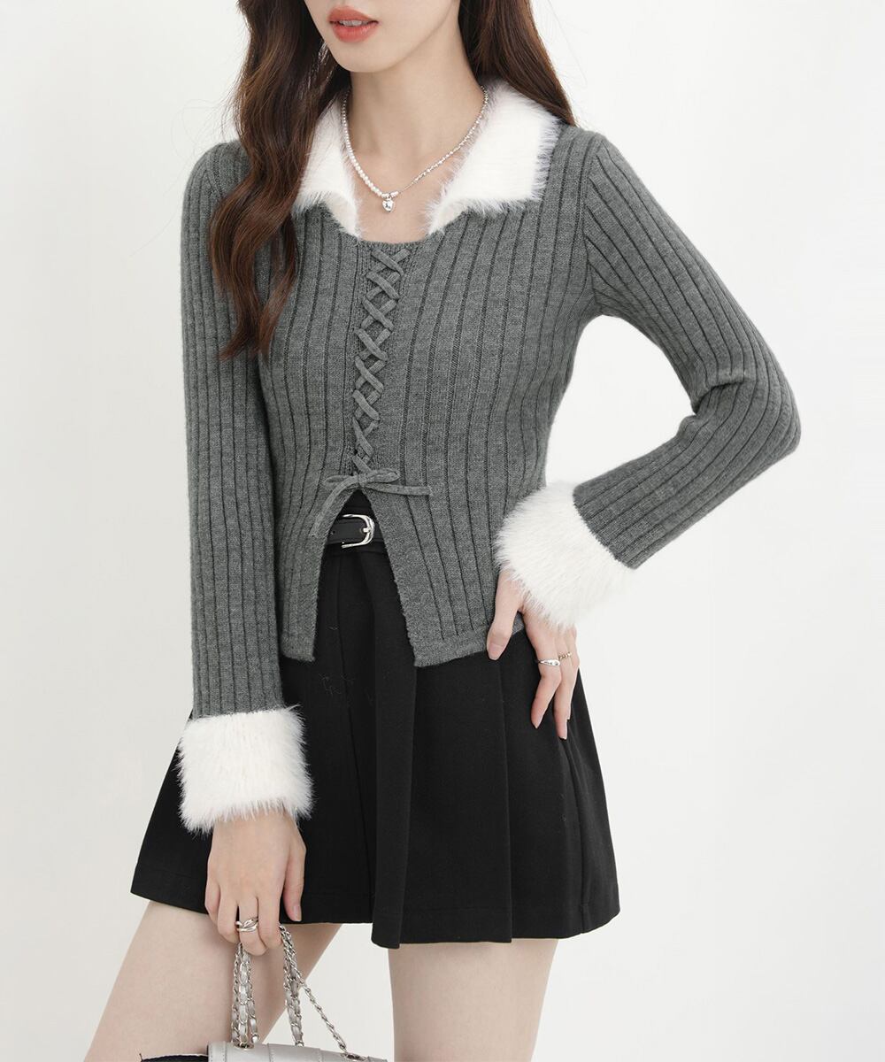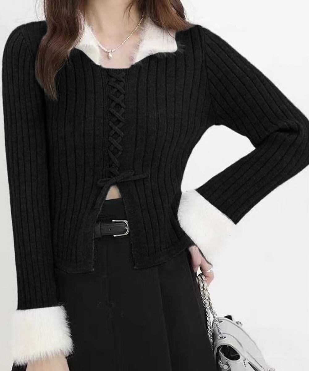 【日本倉庫からの発送】 ファー襟 レースアップニットトップス配色 #[2YIKE-009_26100]【送料込み】【260128】