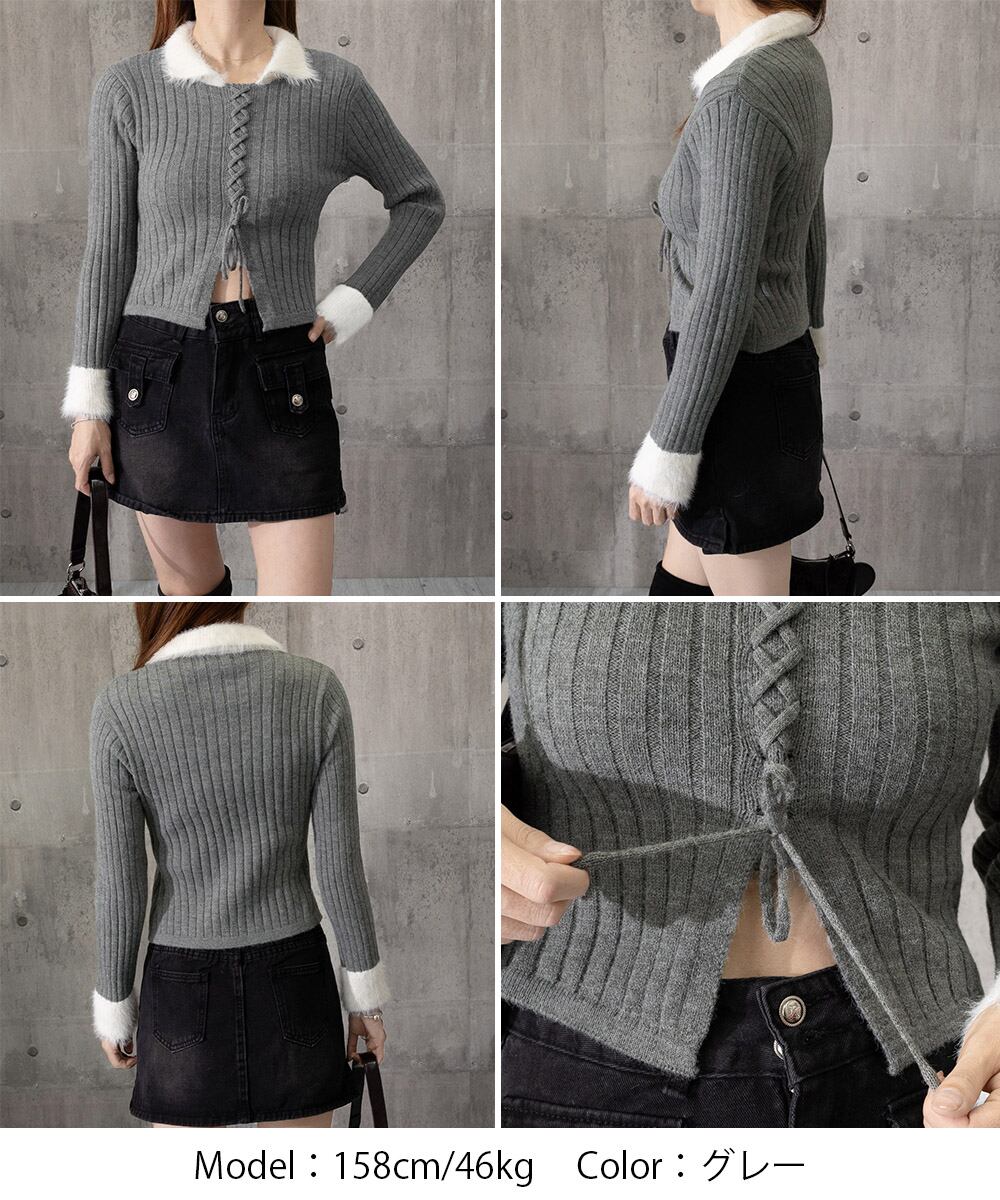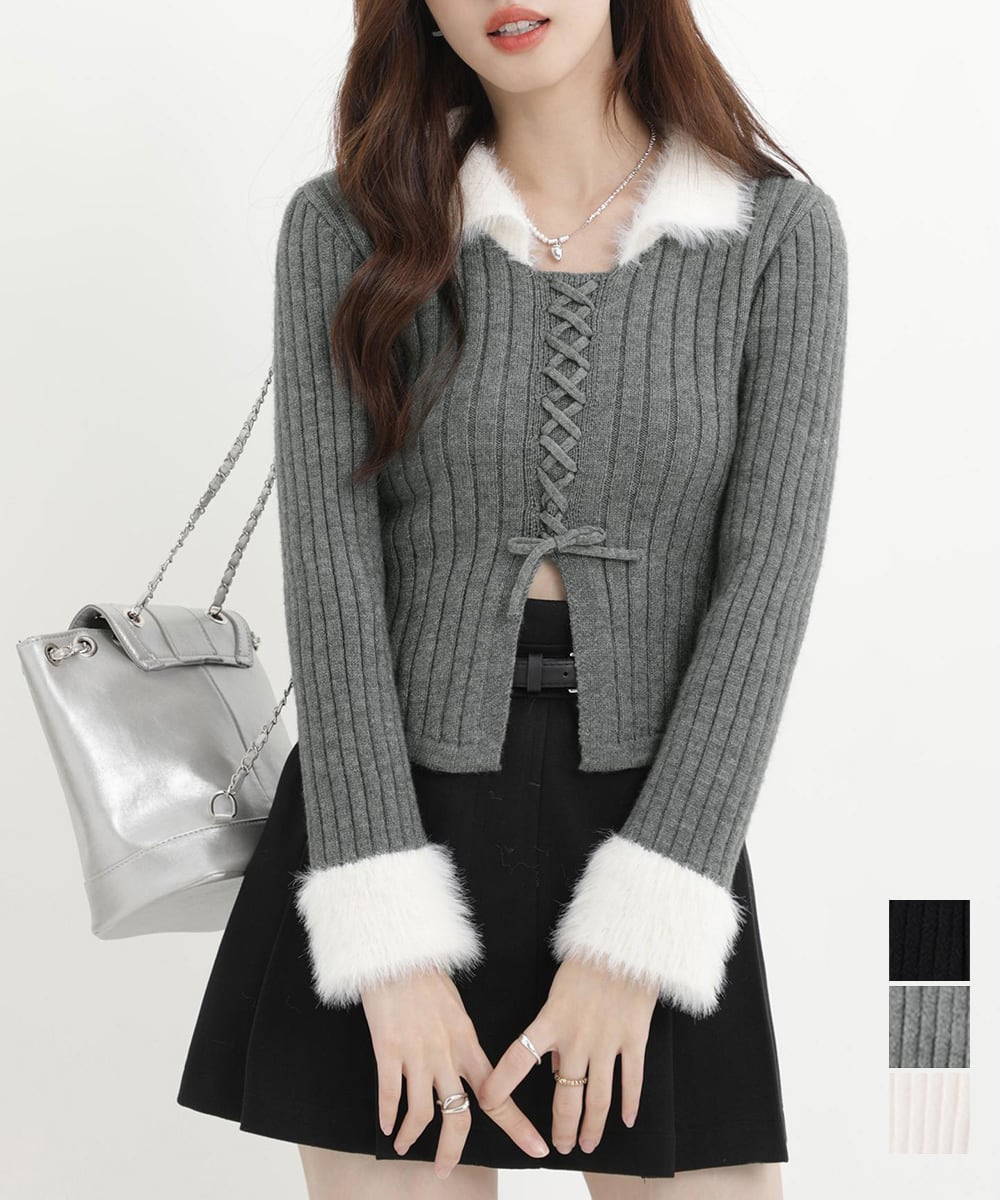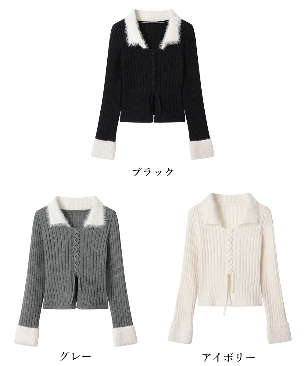 【日本倉庫からの発送】 ファー襟 レースアップニットトップス配色 #[2YIKE-009_26100]【送料込み】【260128】