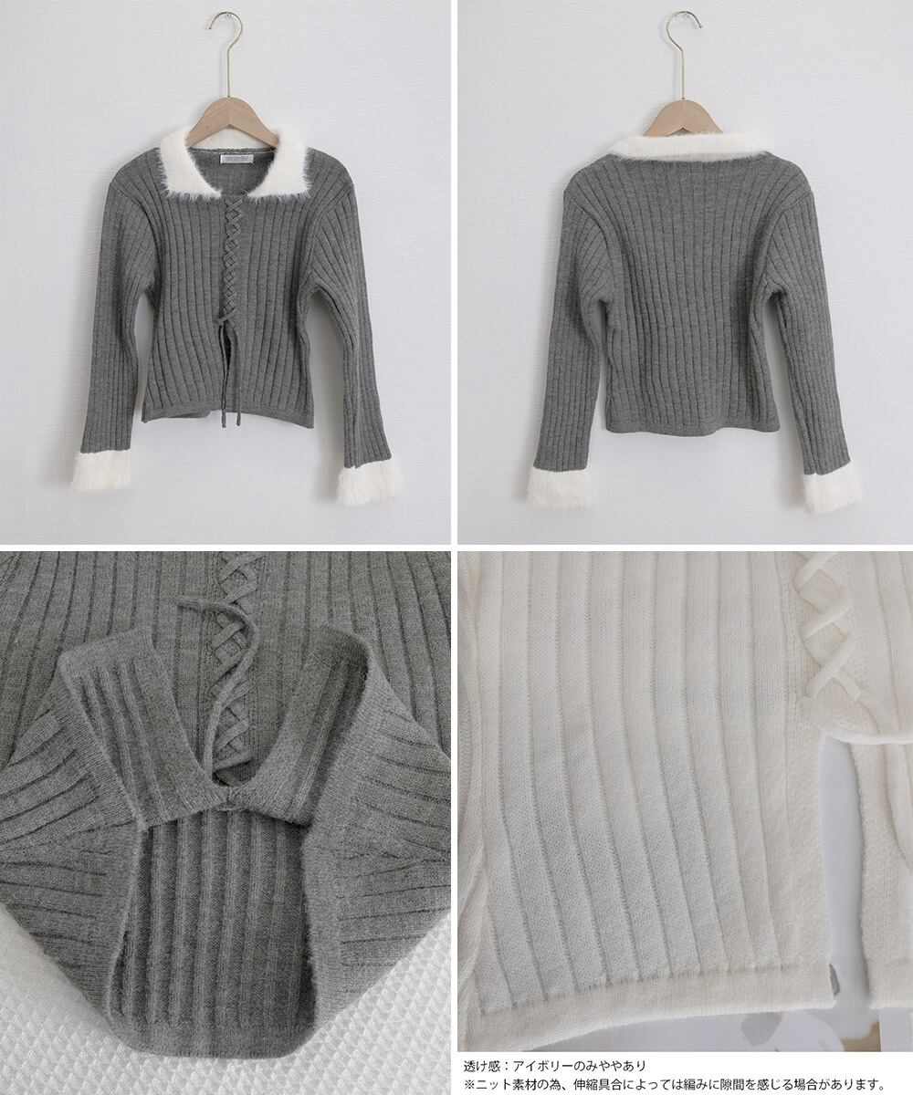 襟元と袖口にエコファーをあしらった、フロントレースアップのリブニットセーター。