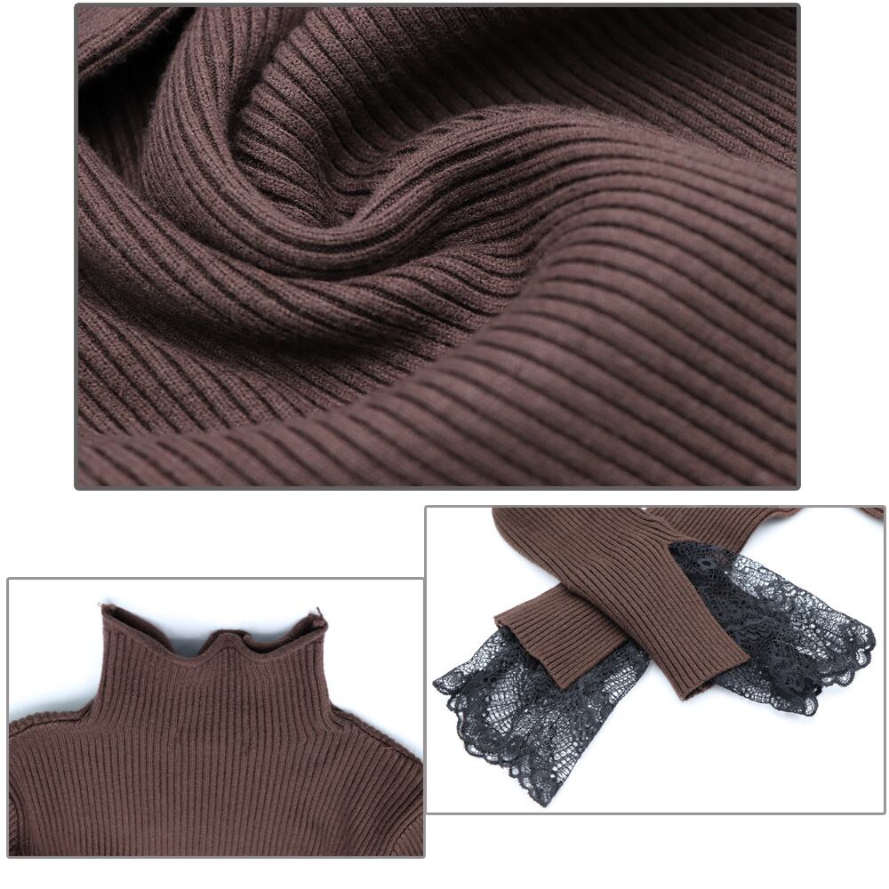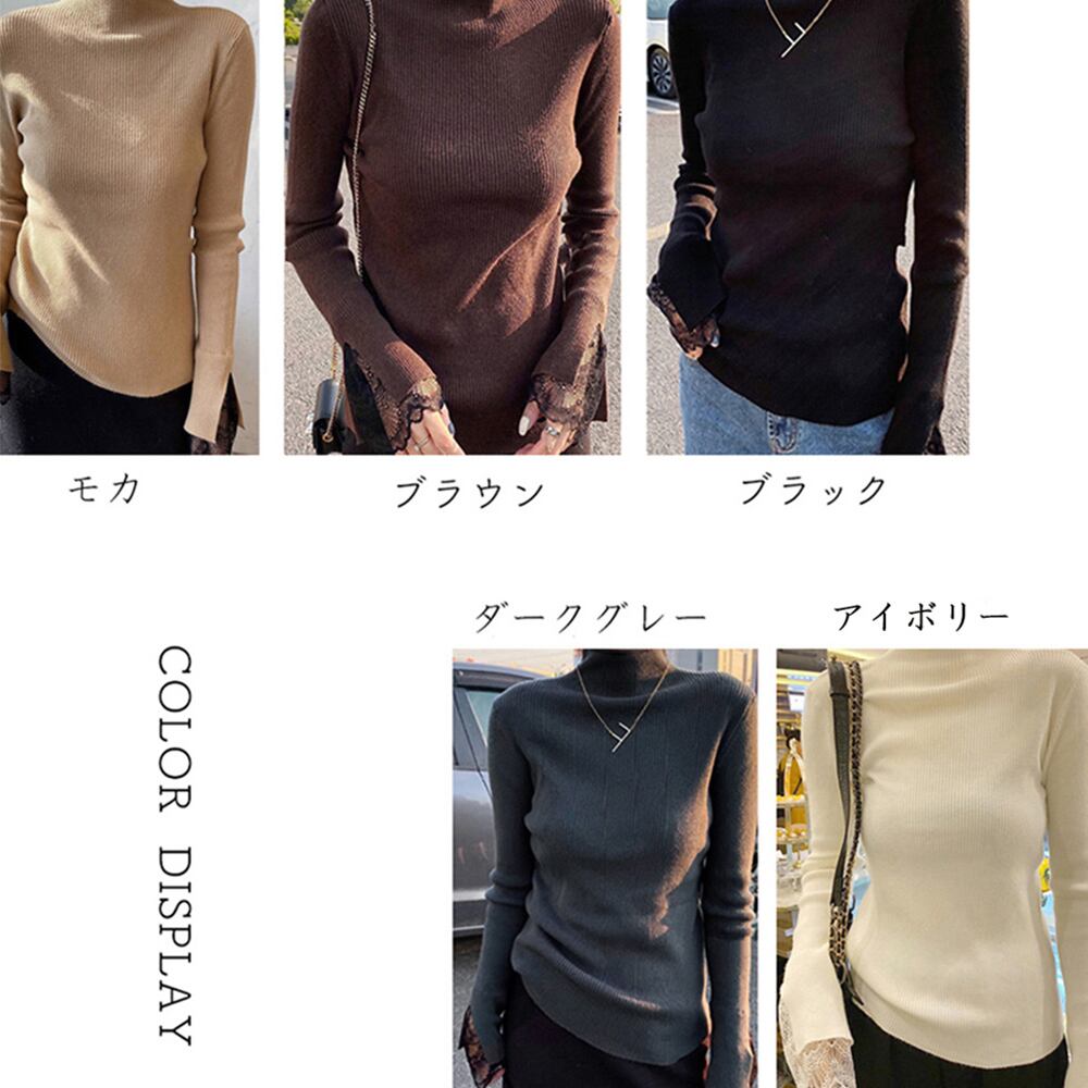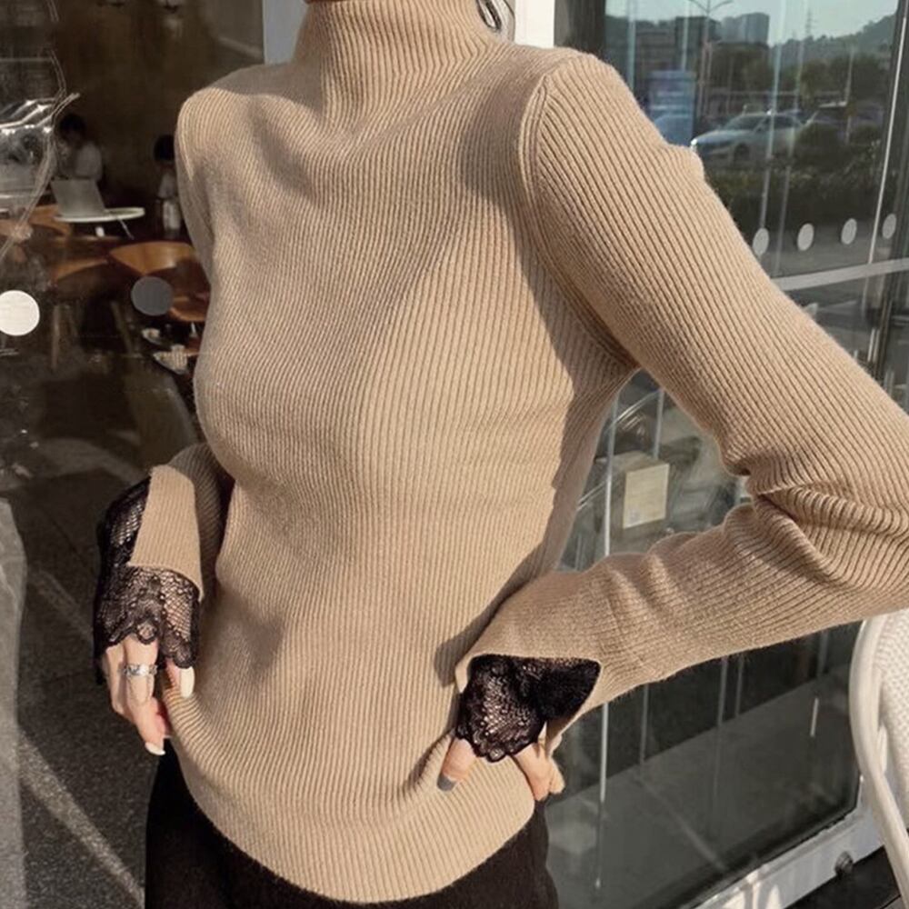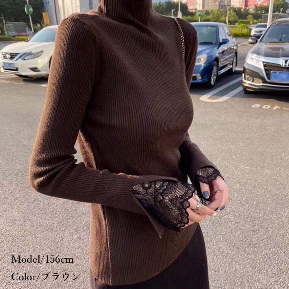 リブ編みでシャープな体のラインを演出、袖先はレース付きで可愛い印象