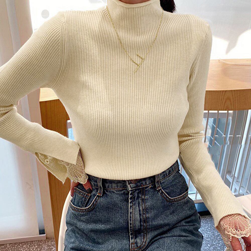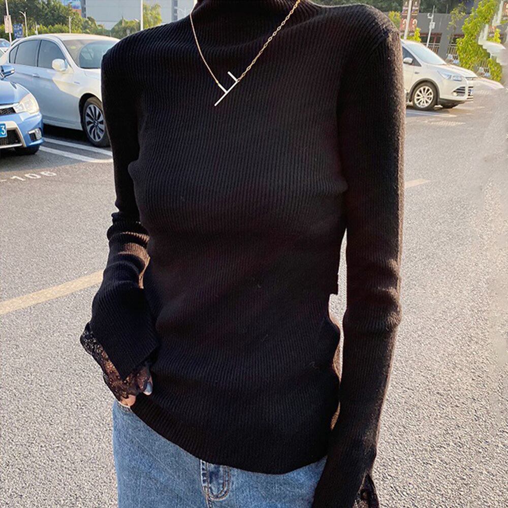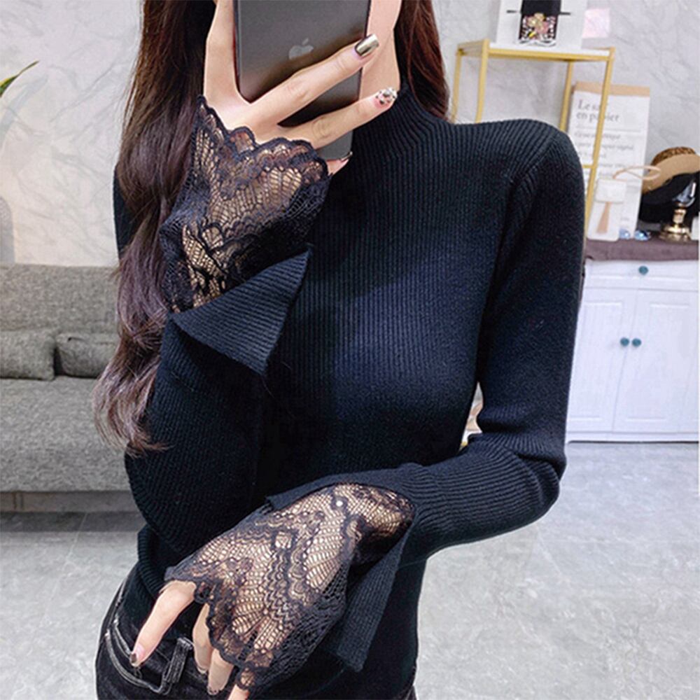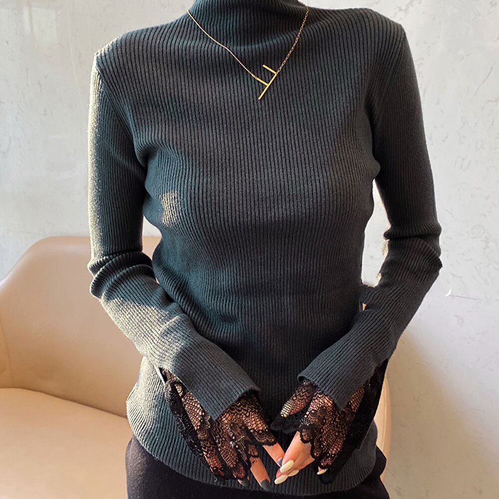 リブ編みでシャープな体のラインを演出、袖先はレース付きで可愛い印象