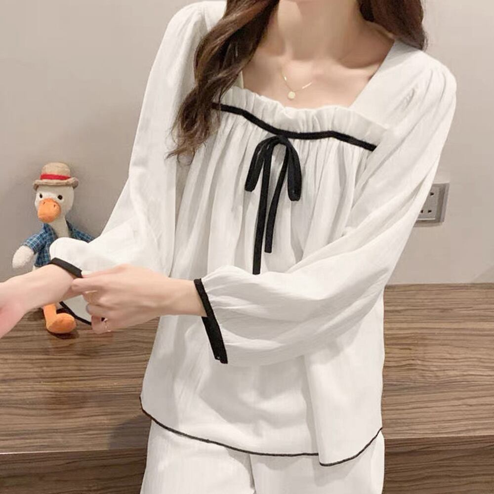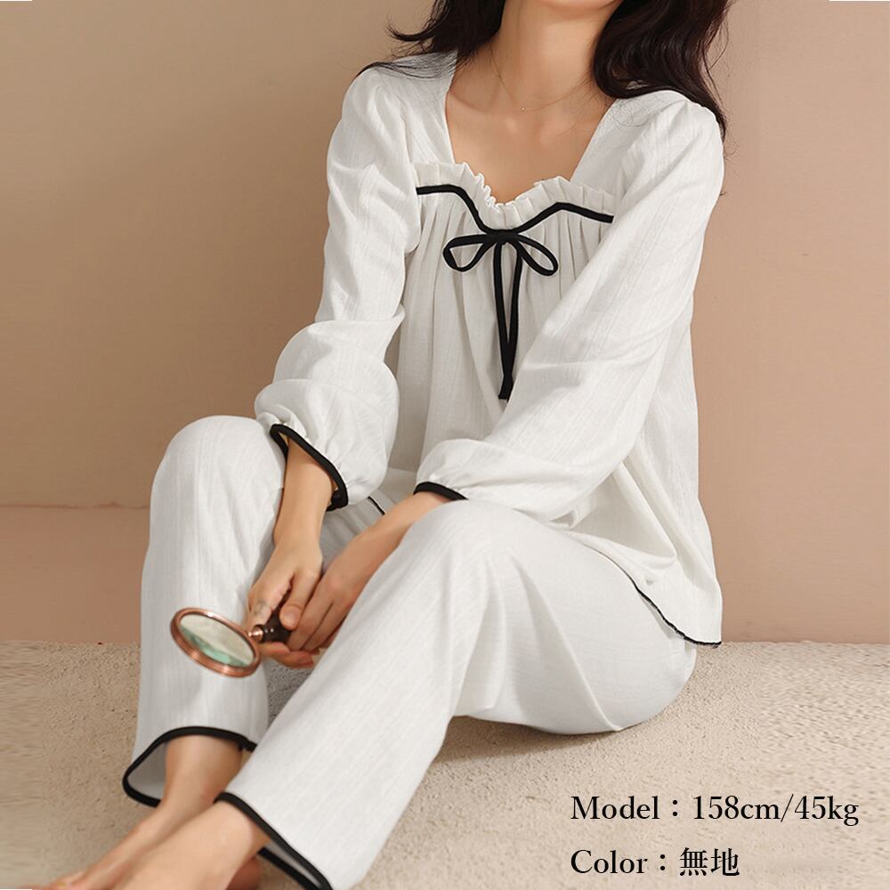 お家のリラックスタイムでも可愛くいたい女性のワガママを実現するリボン付きタック入りフリル襟の部屋着2点セット