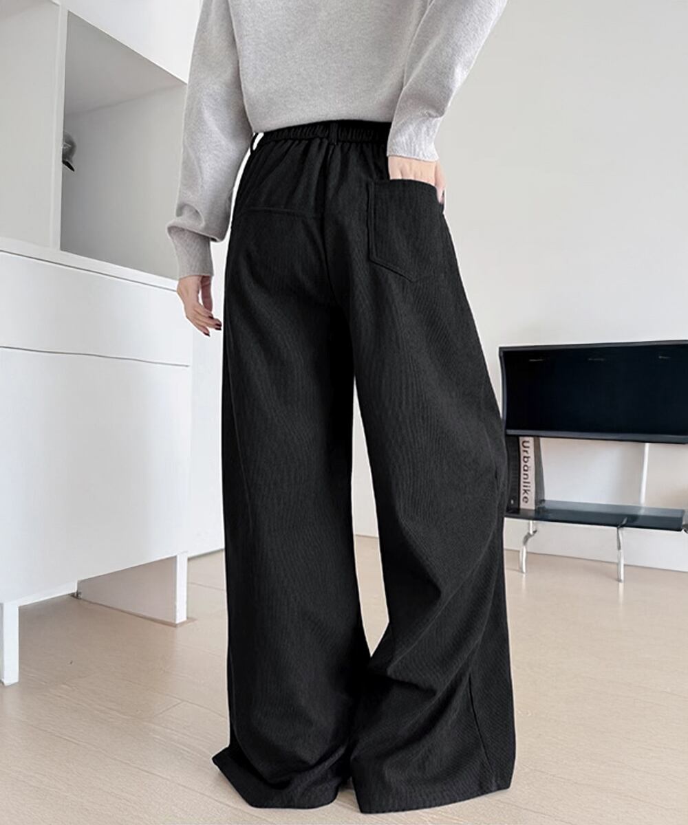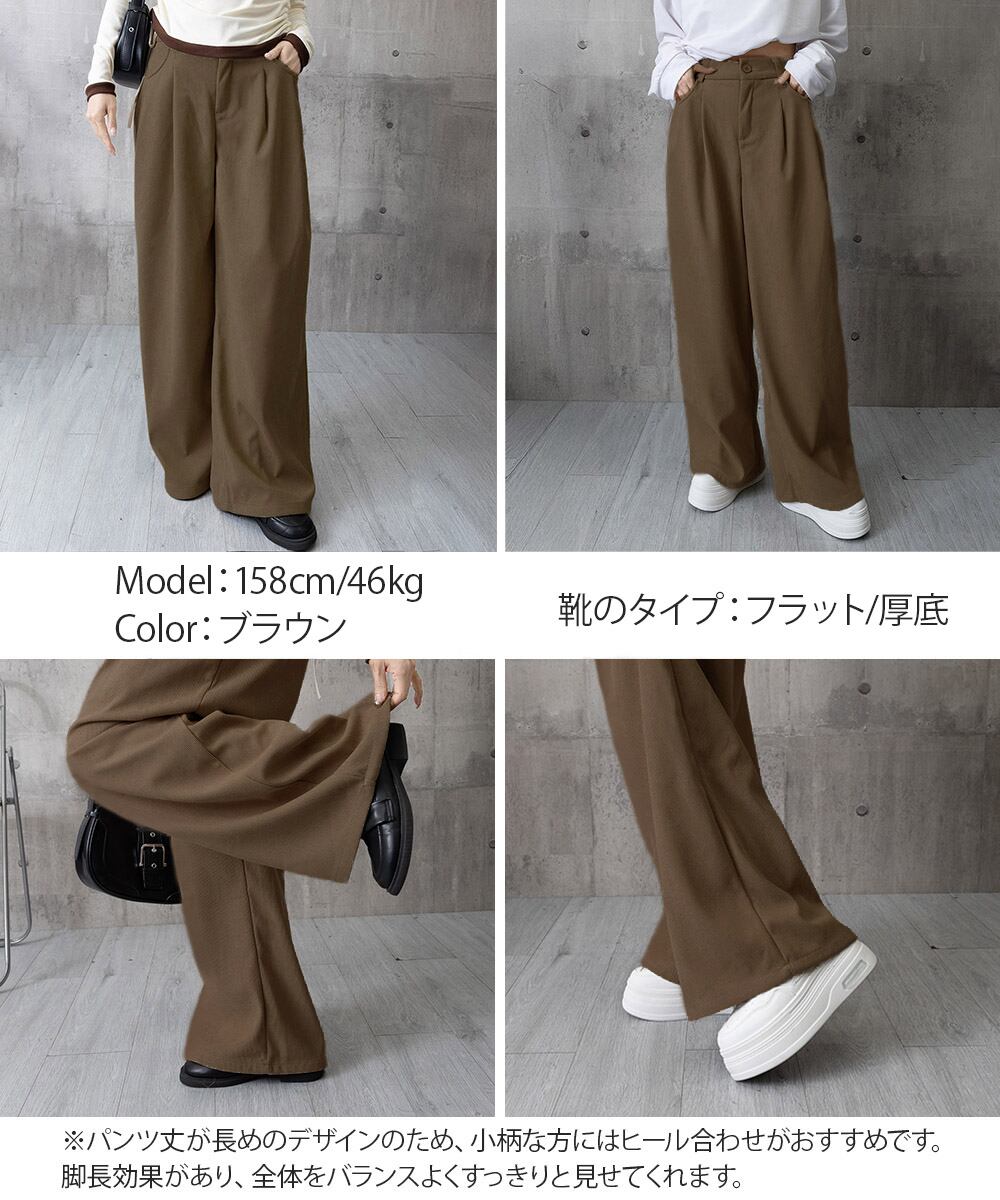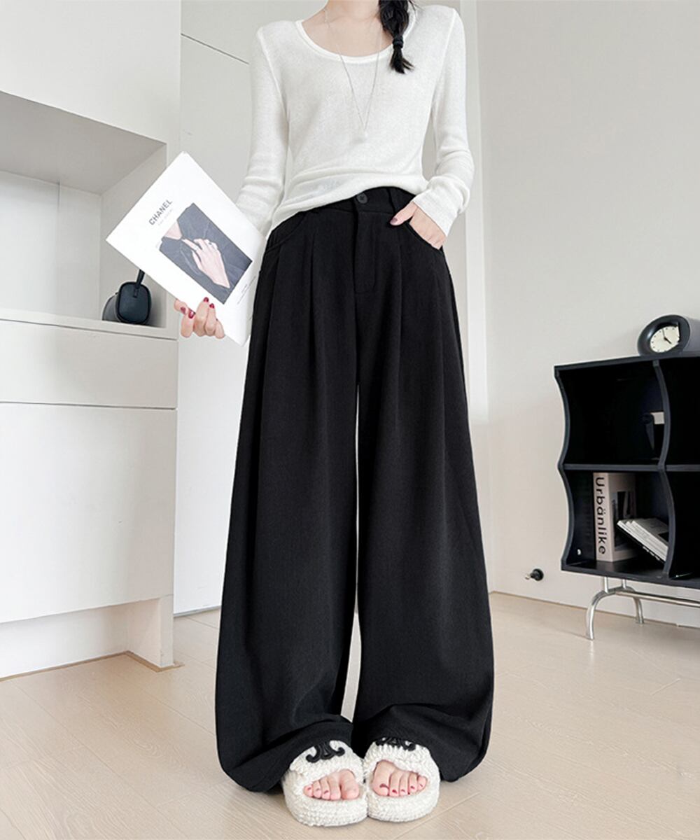 ハイウエストイージーパンツ体型カバー ゆったりロングパンツ やや厚手タックパンツ 韓国風 脚長見せボトムス大人カジュアル