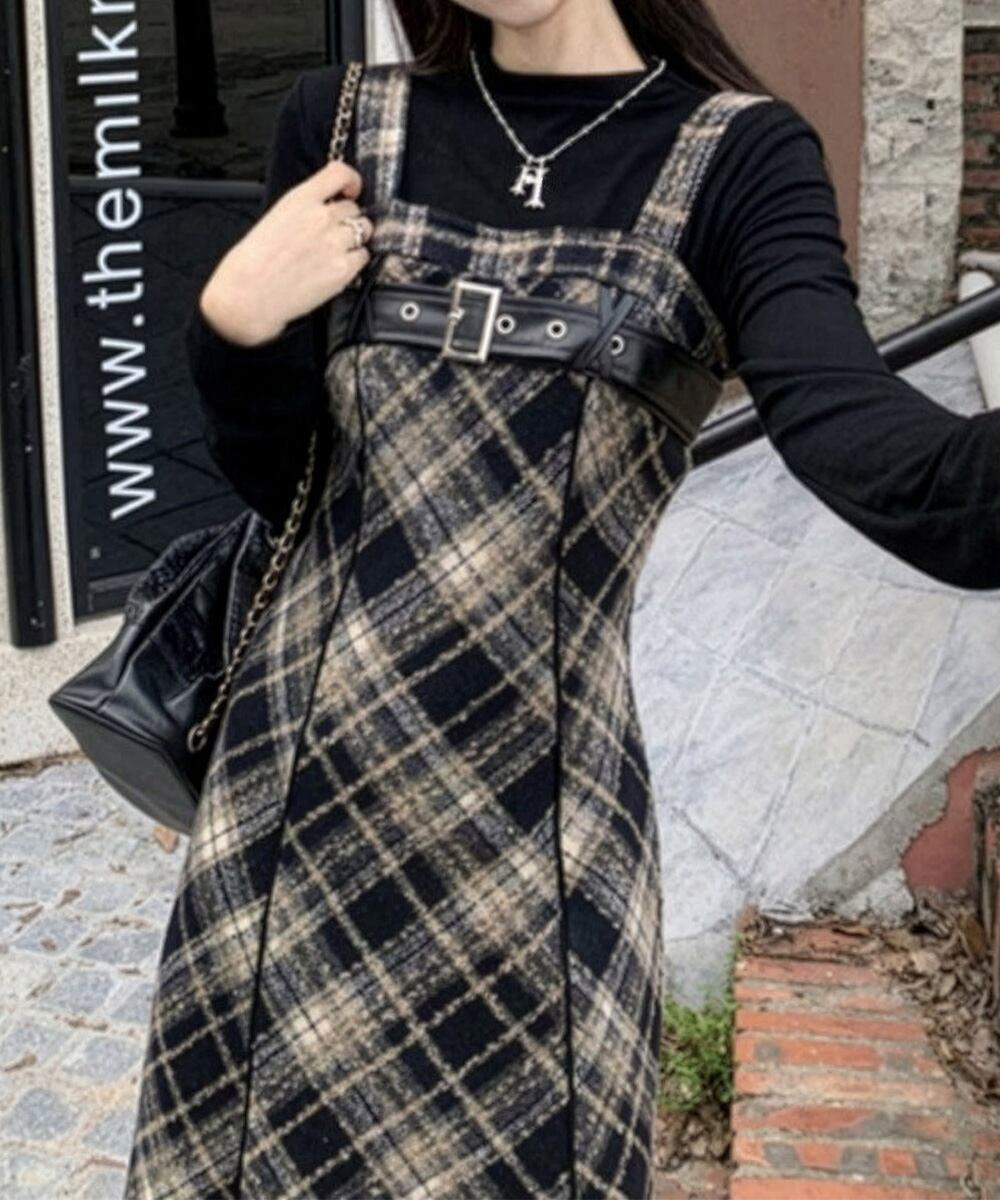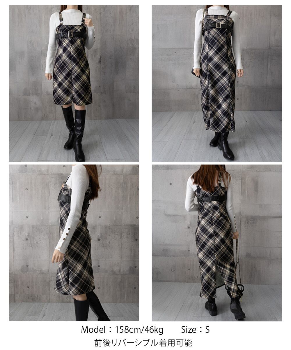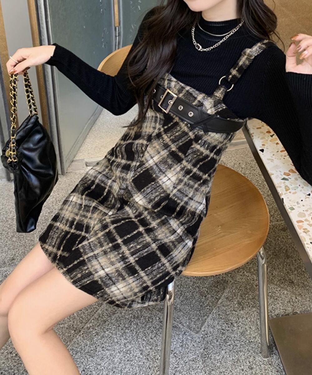 チェック柄が目を引くサスペンダーワンピースで、春秋冬レイヤードスタイルにぴったり。