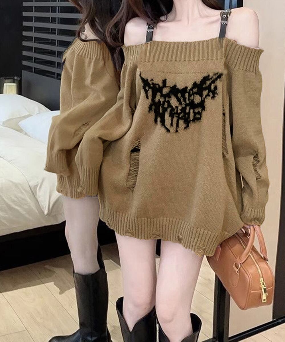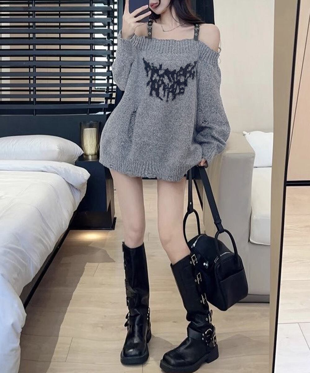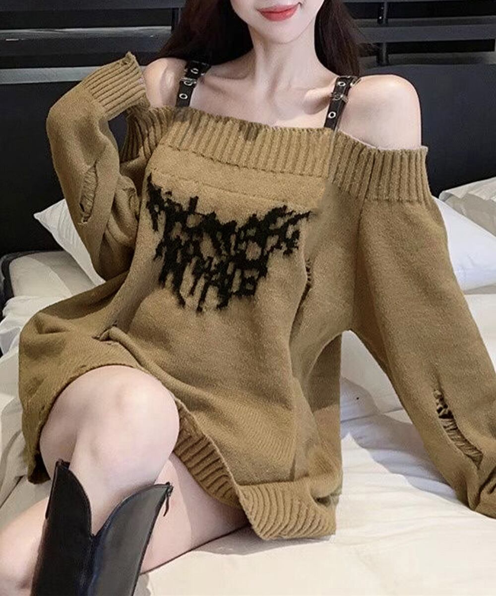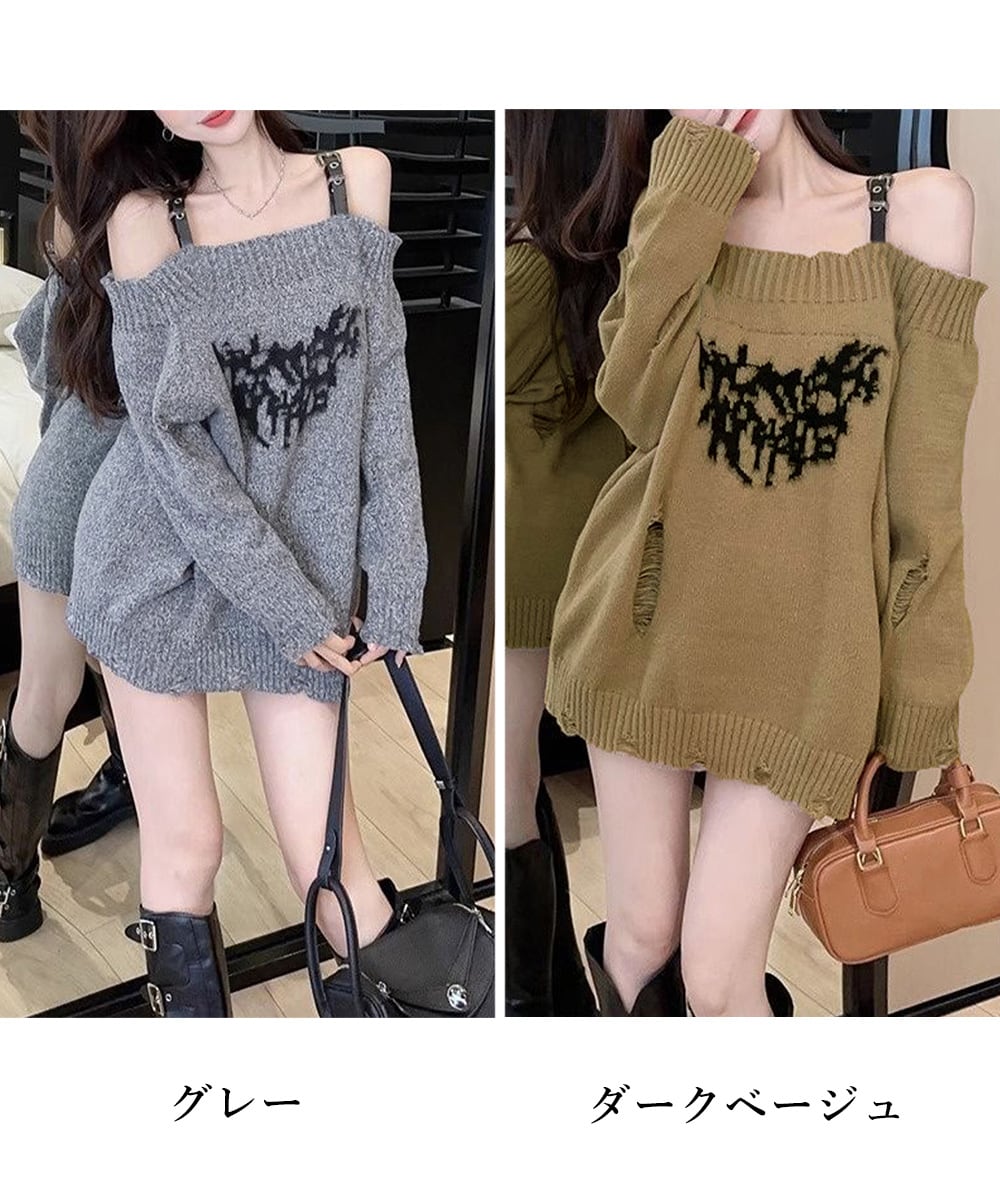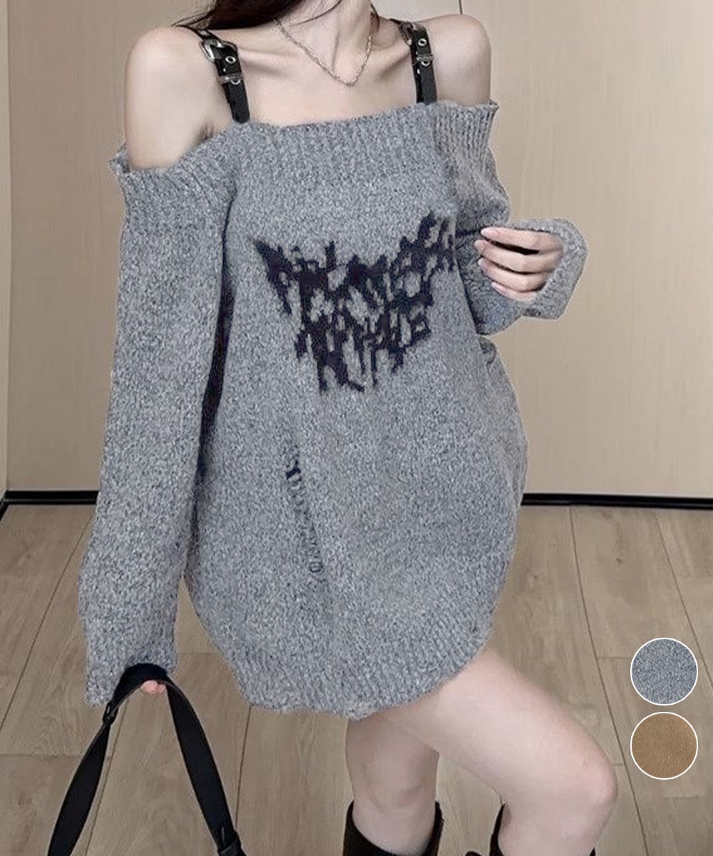 肩見せニットチュニックレディース レザー調肩紐ニットワンピース フロントグラフィティニットトップス ゆったりY2Kニット