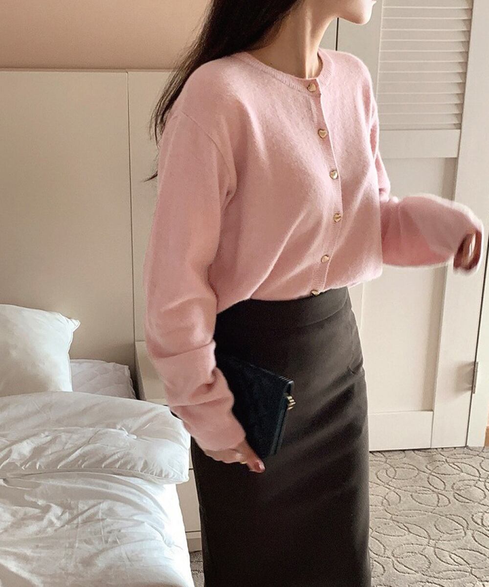 ハートボタンがさりげないアクセントになり、女性らしさを引き立てる一枚。