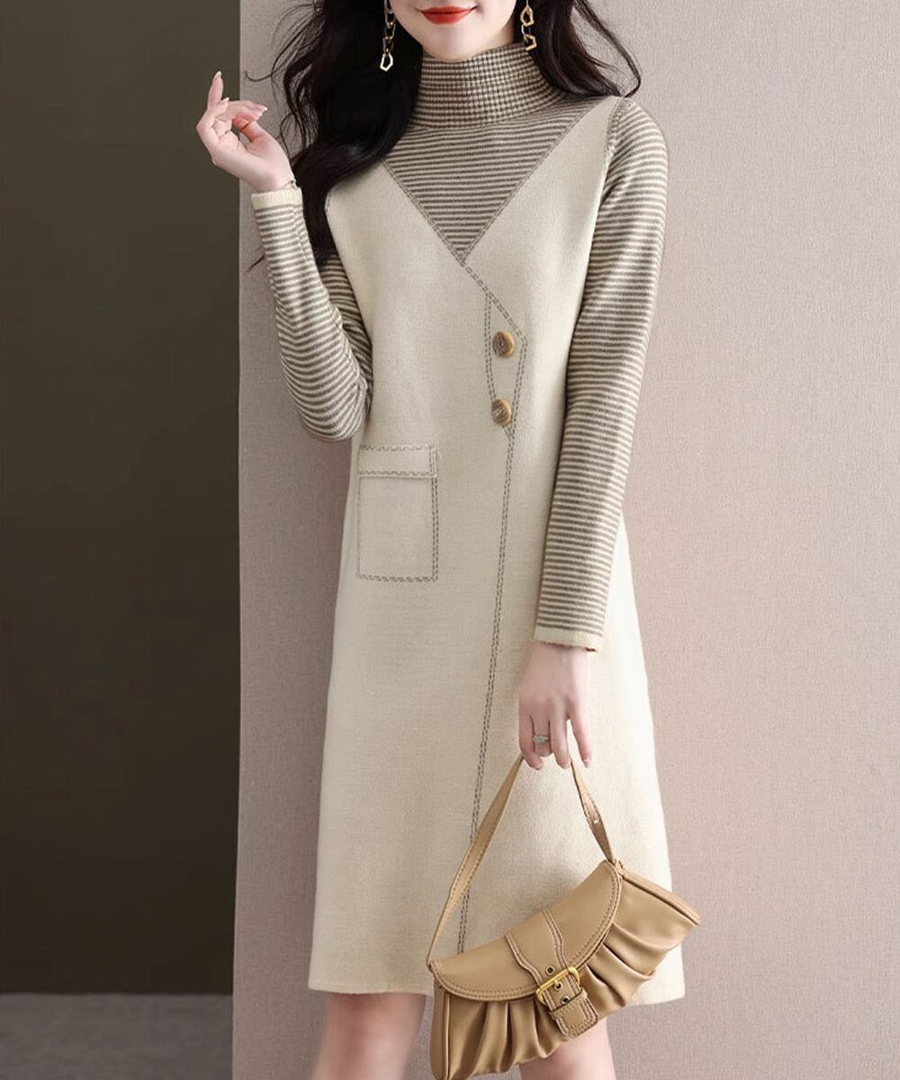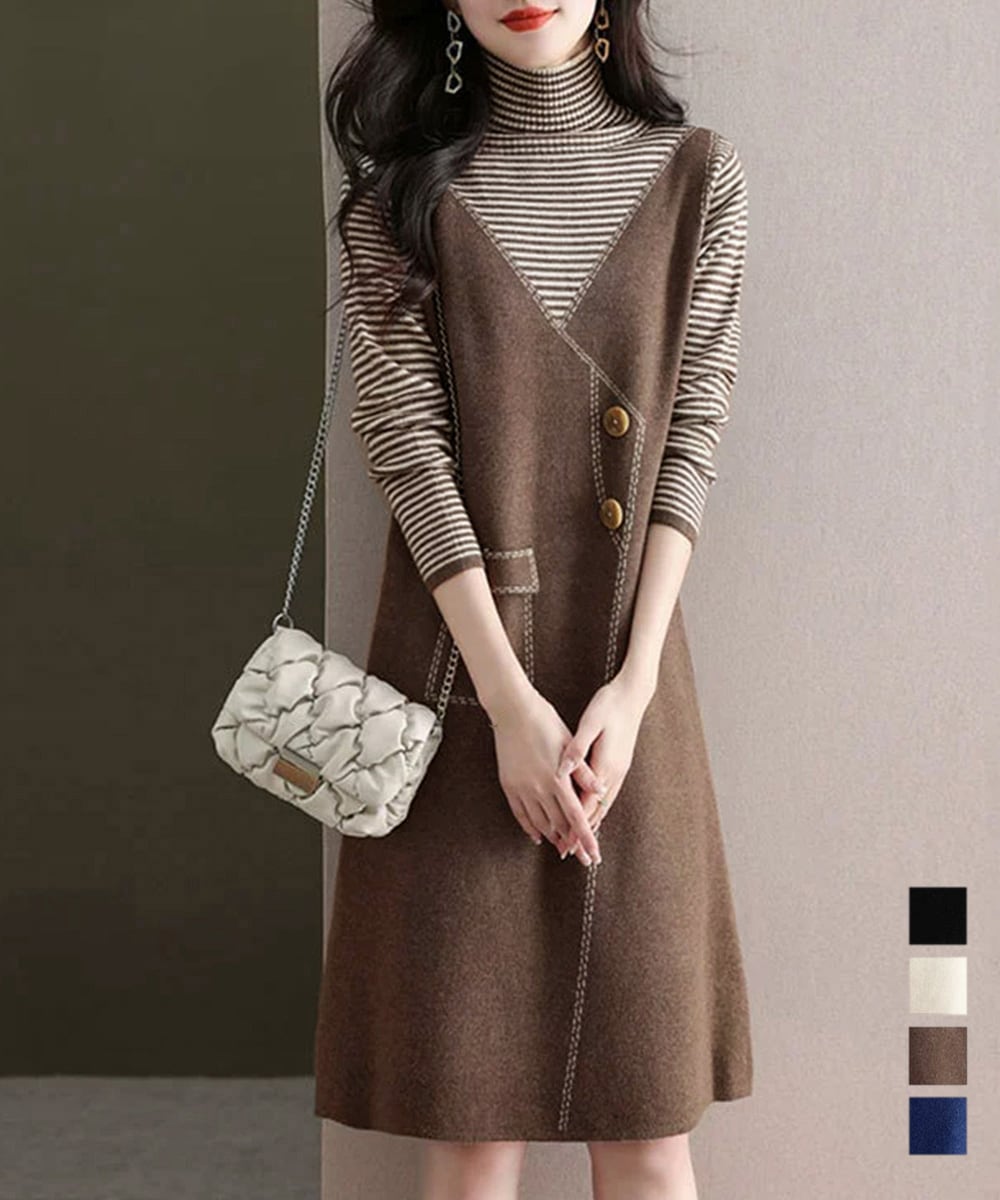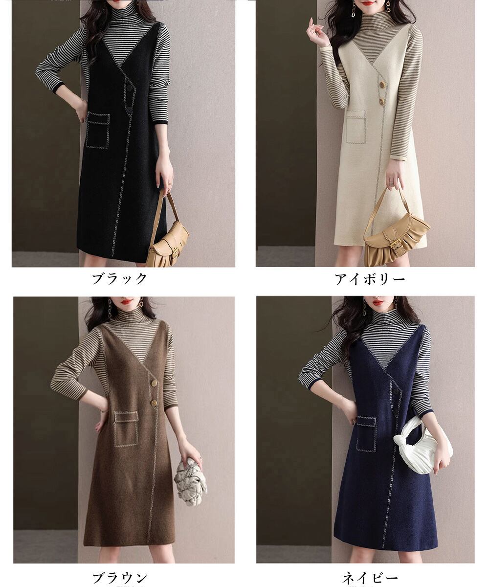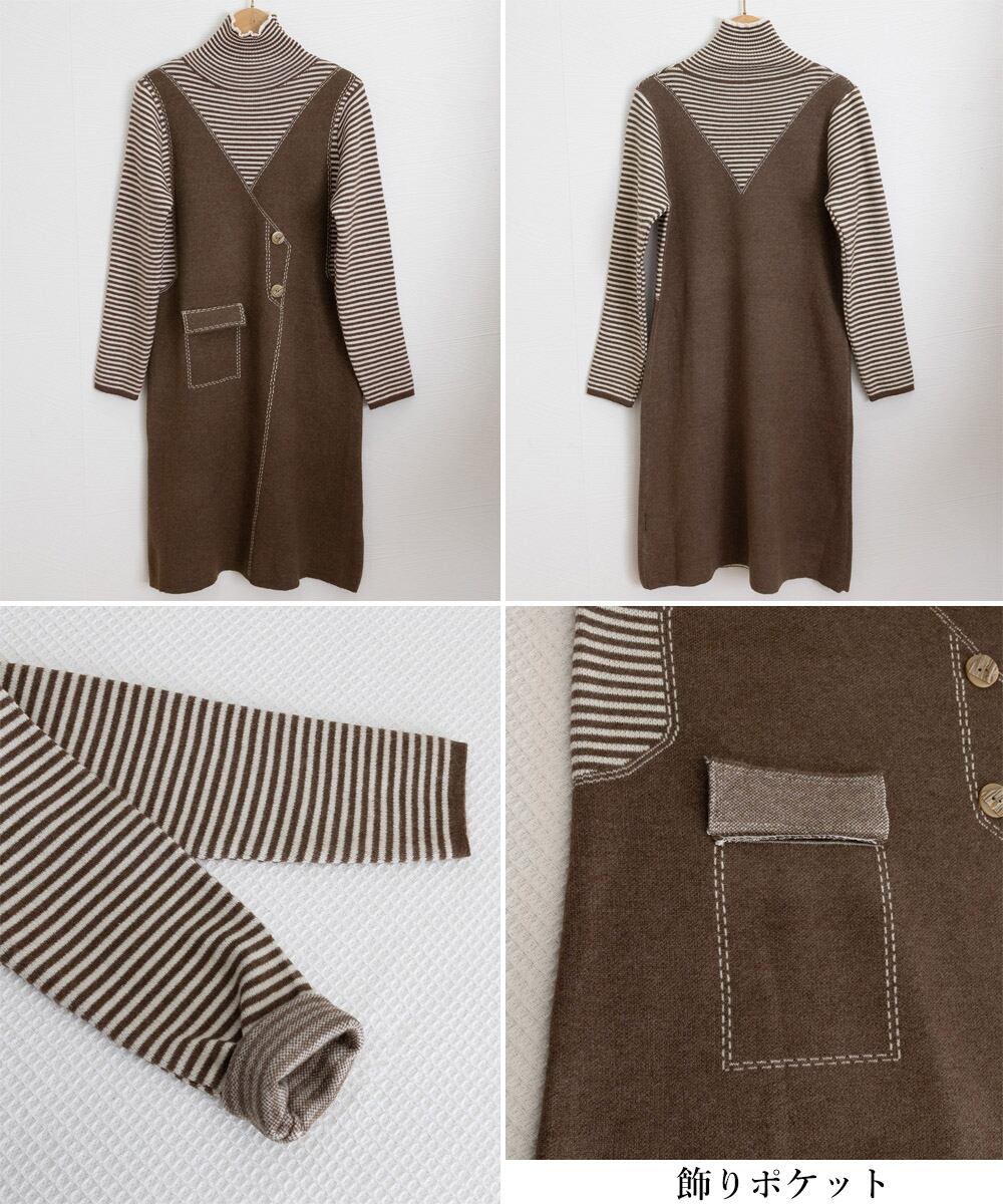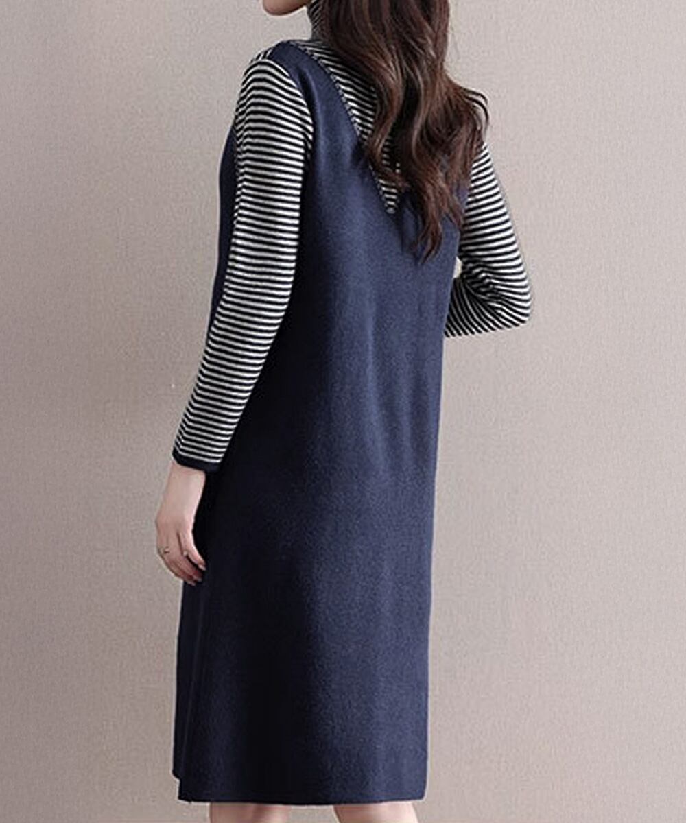 ハイネック ドッキングワンピ ボーダー柄切り替え 膝丈ワンピース 配色ステッチ 秋冬長袖インナーワンピ 大人可愛い着回し