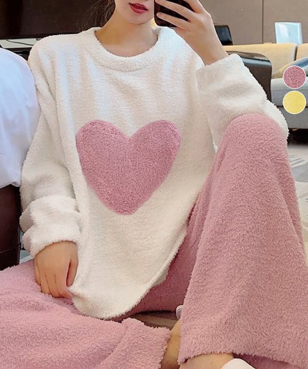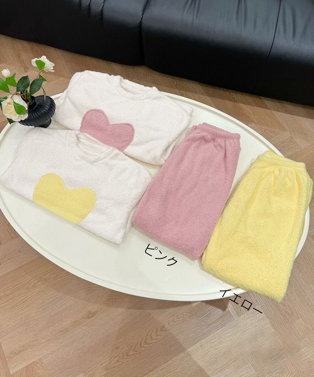 ハート柄が可愛いもこもこルームウェア上下セット。