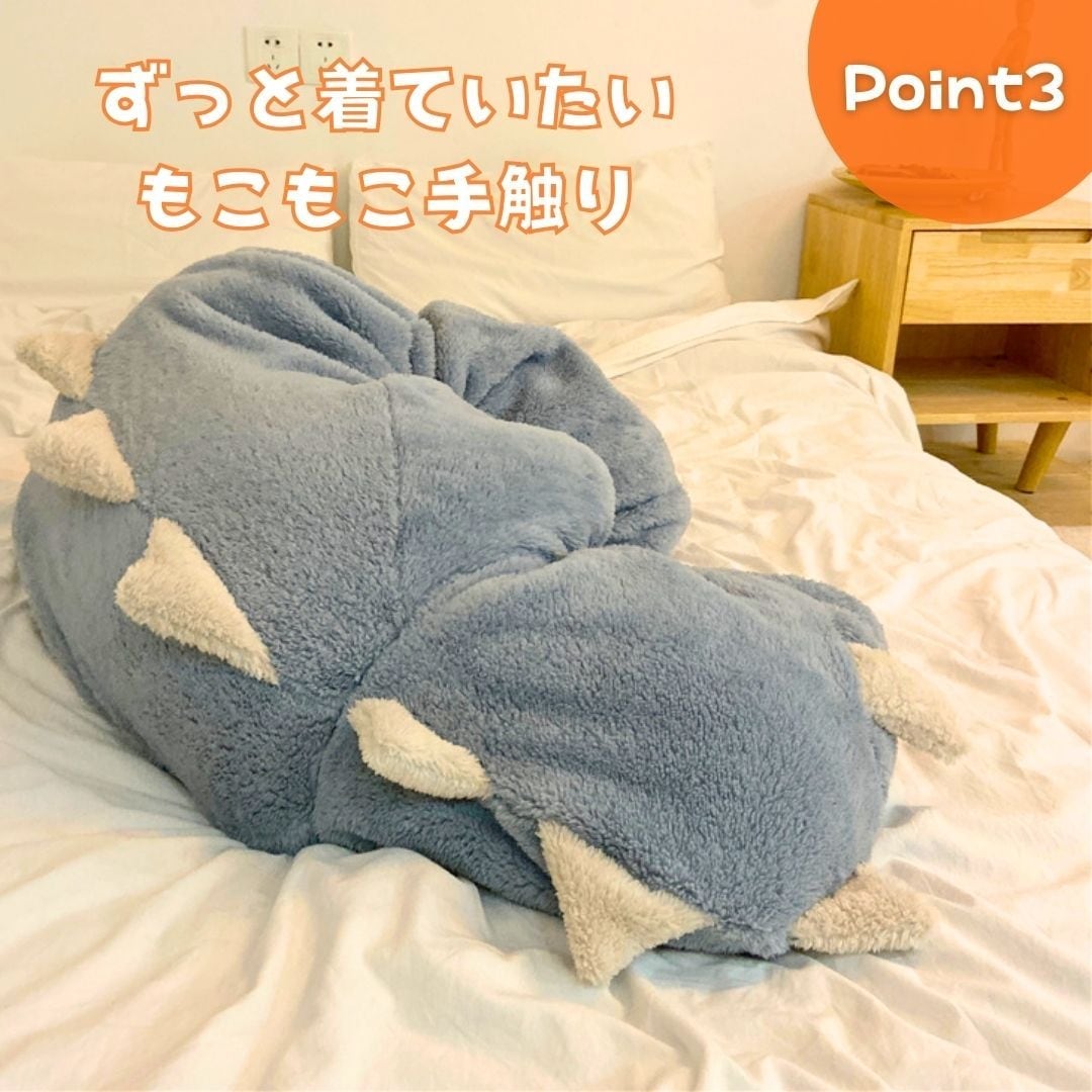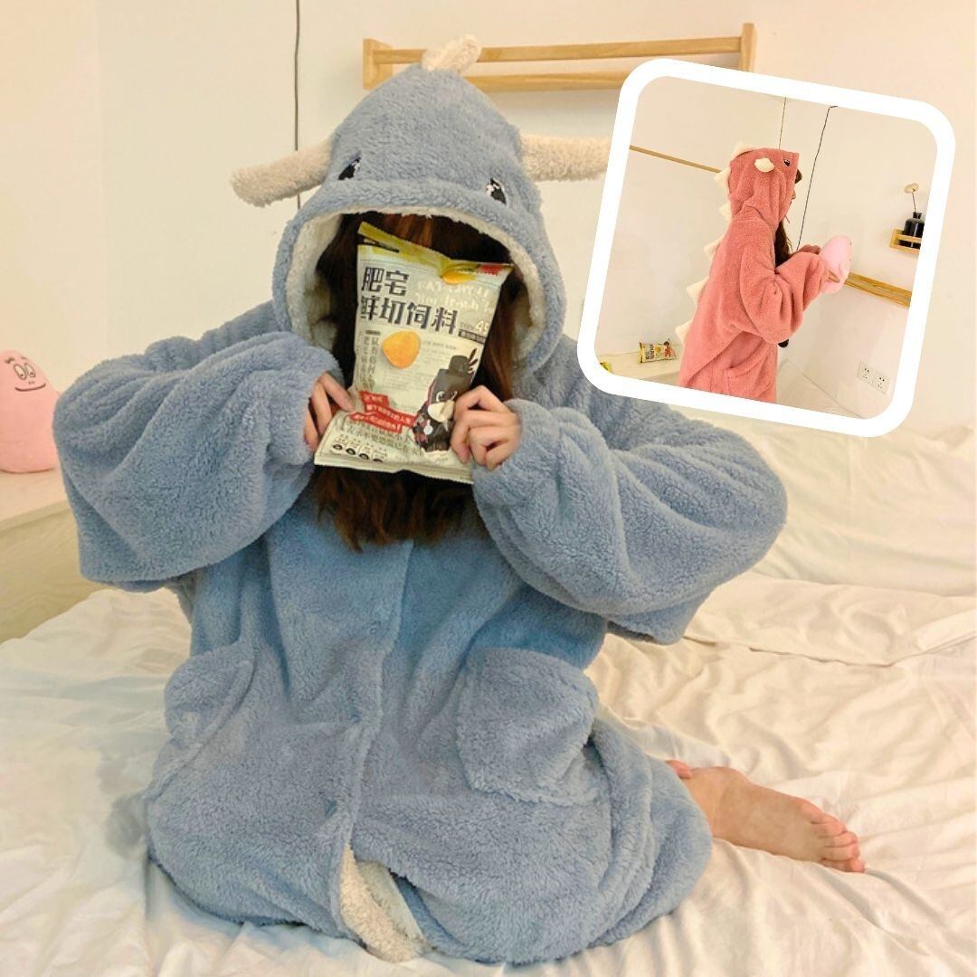恐竜がモチーフのもこもこあったかのルームウェアとなっております。フード付きで丈が長めに作られているのでお尻の部分もすっぽり入って広範囲で温めてくれます。