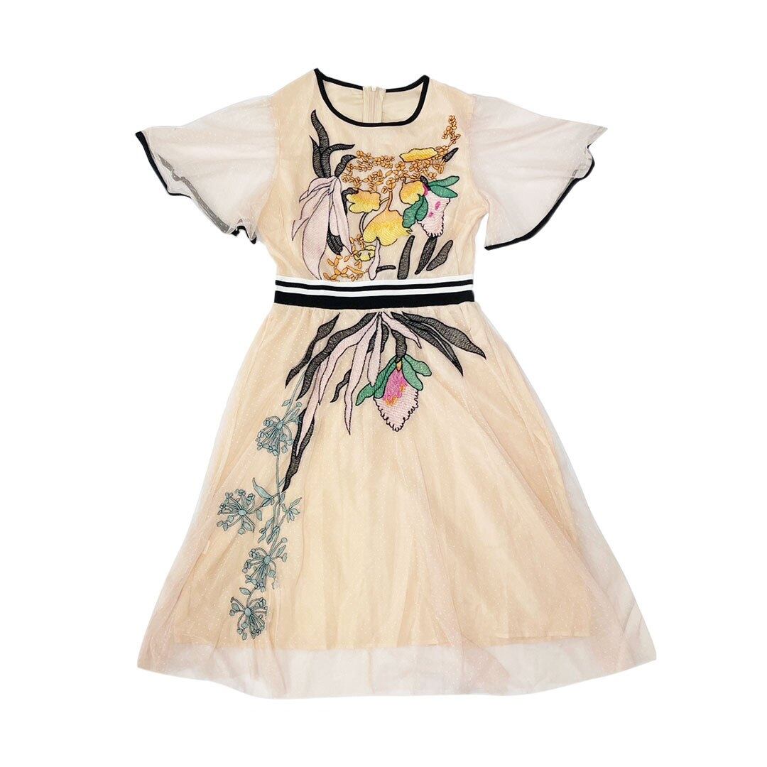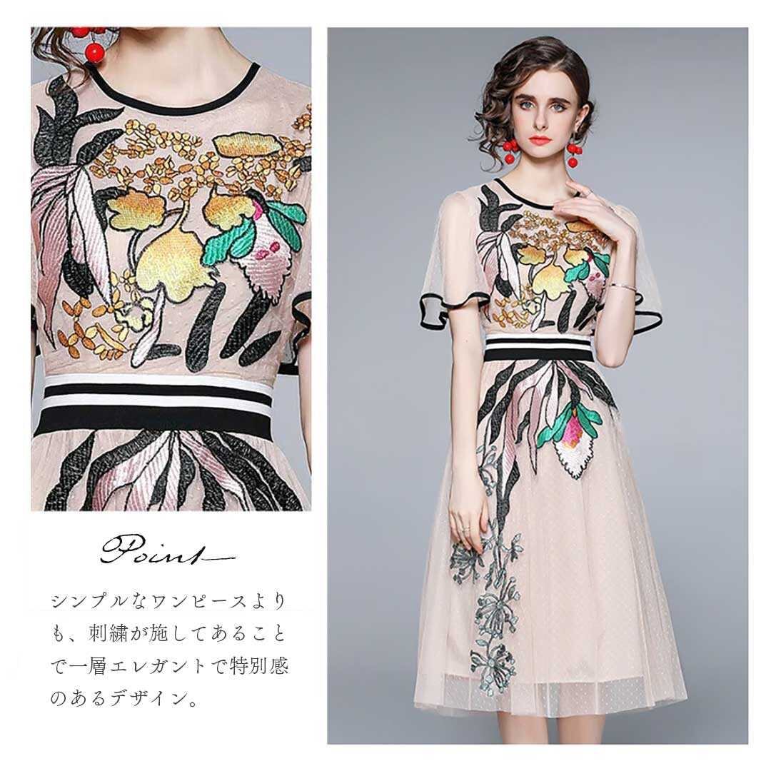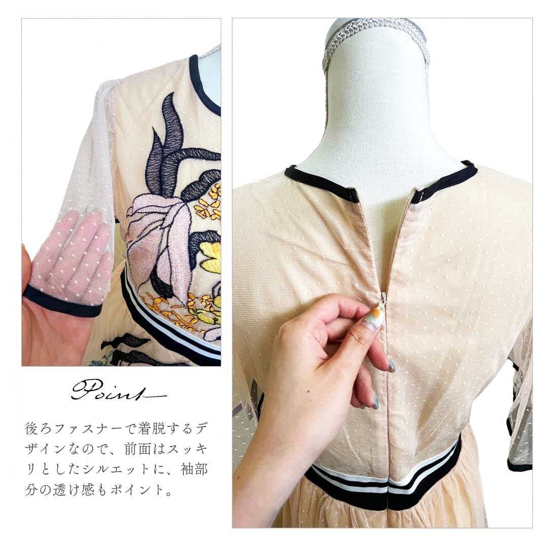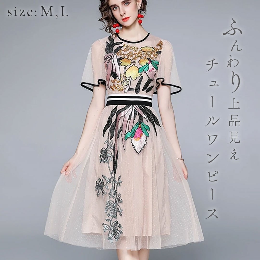 ワンピース 花刺繍 チュールワンピース ベージュ MサイズorLサイズ フラワー 膝丈 Aライン 伸縮性