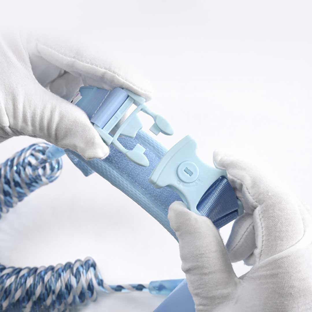 手触りがよくやさしい付け心地の迷子紐。保護者しか開けることができない鍵の安全ロックがついているため、危険からも子どもを守ります。また、長く愛用できます