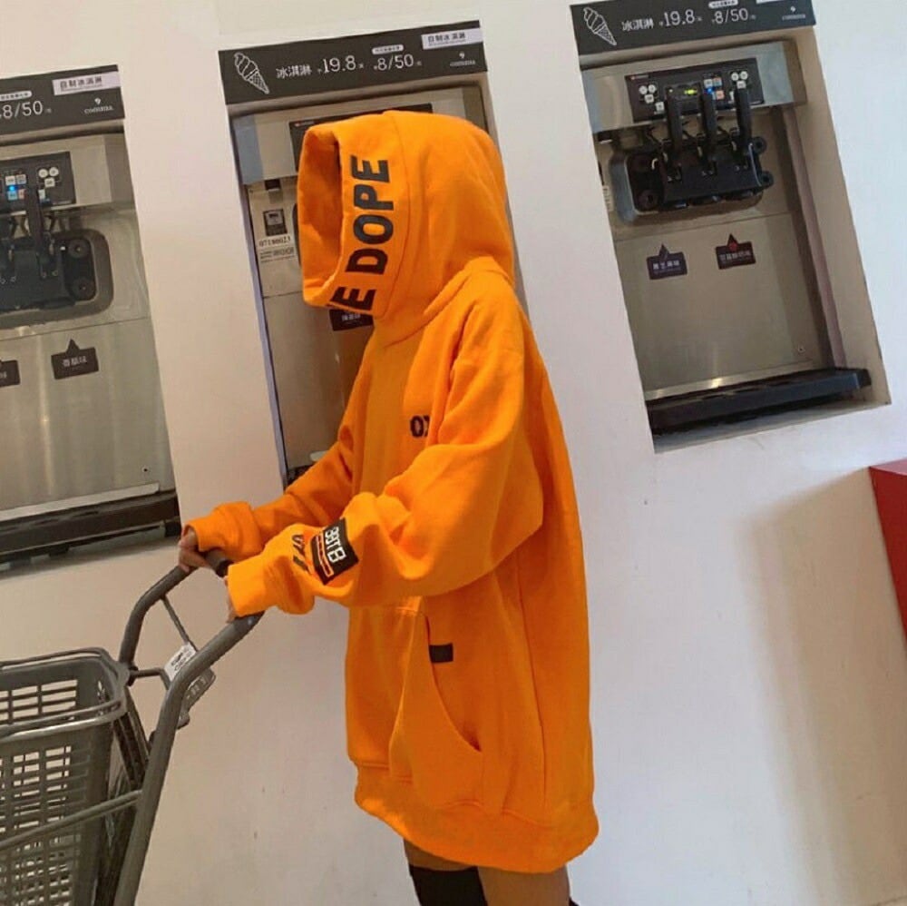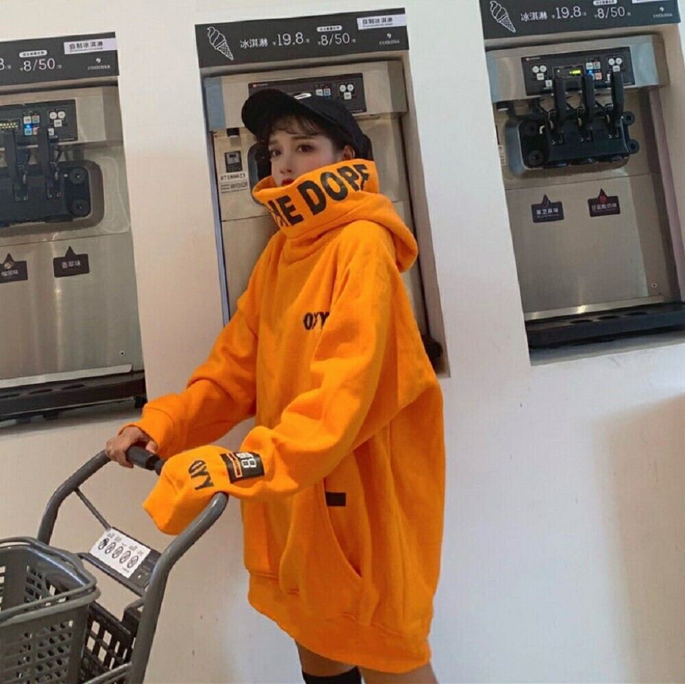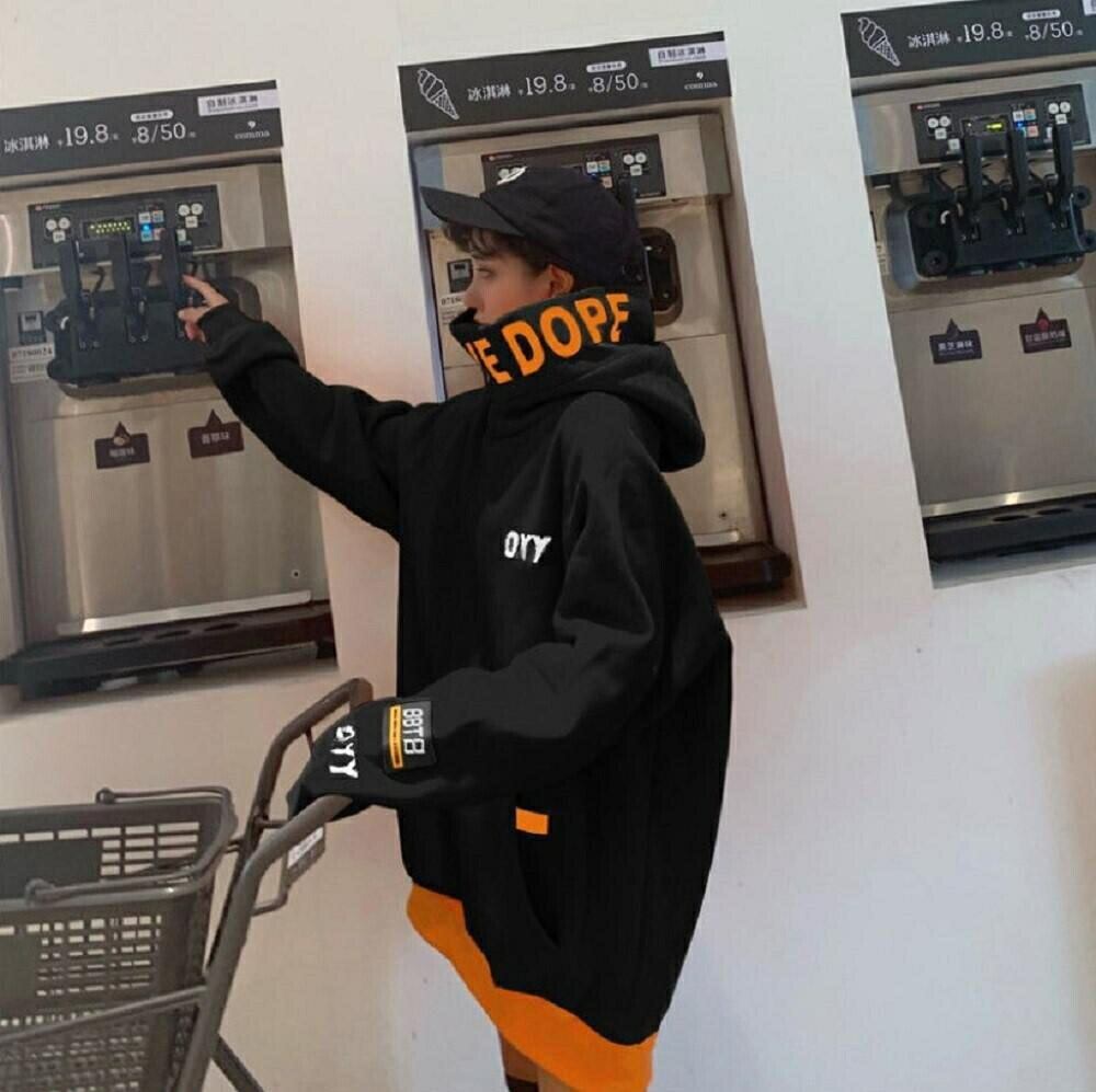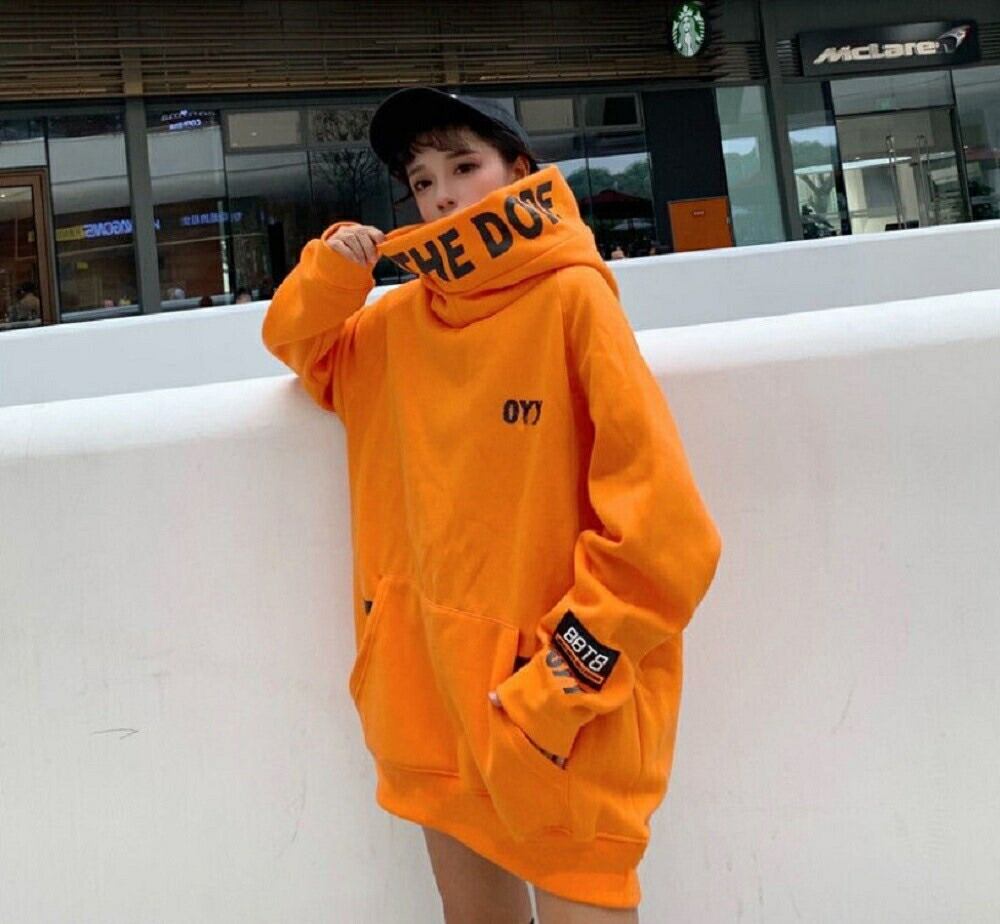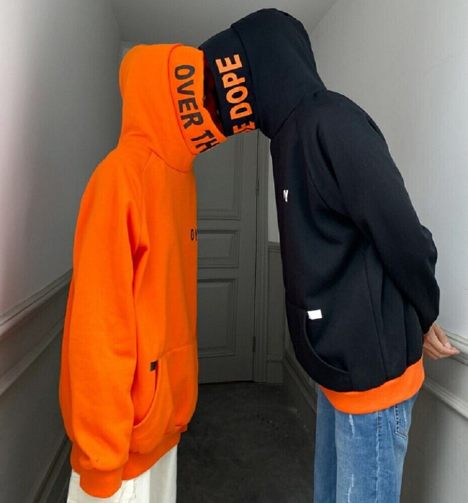大胆なデザインのビッグフードとハイネックが目を引くストリート系パーカーです。