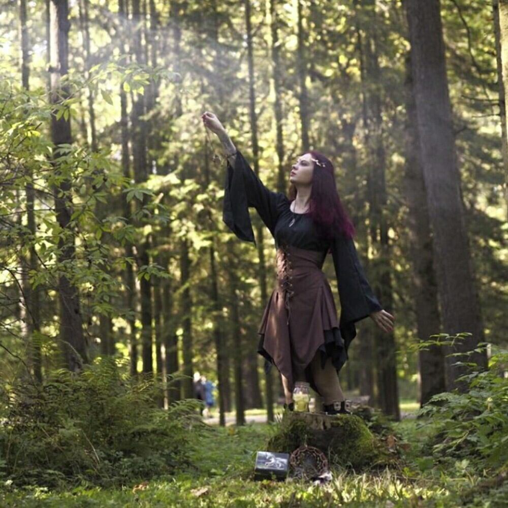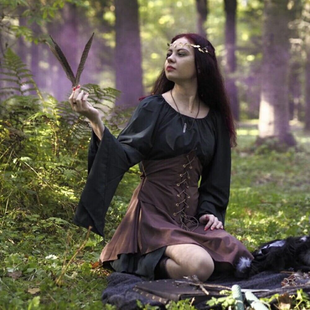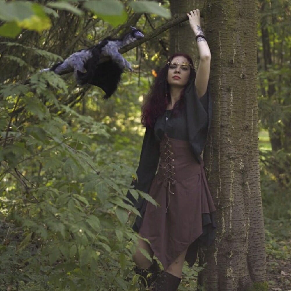 森の中に自然と溶け込みそうな雰囲気のドレスで、その姿はまるでファンタジーの中から飛び出してきたエルフのようです