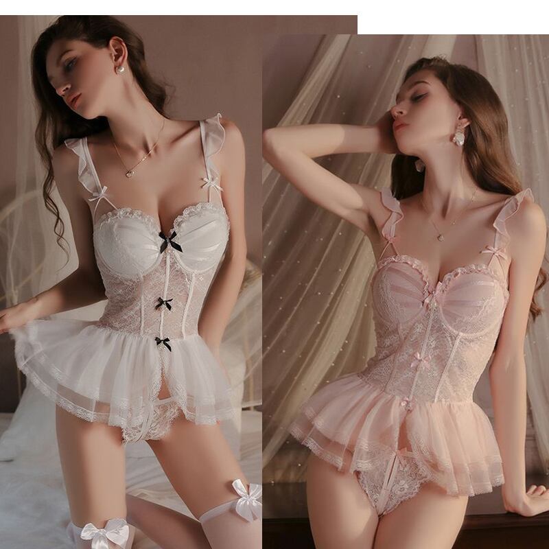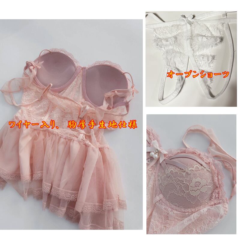 透け感のある花柄レースが上品さを引き立て、裾部のゆらゆらとしたフリルが女性らしい魅力をプラスします。胸部分には厚手の生地を使用しており、安心感とサポートを提供します。オープンショーツがセットになっており、遊び心を加えたデザインが特徴です。