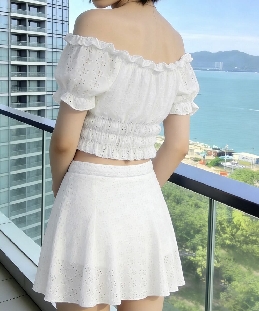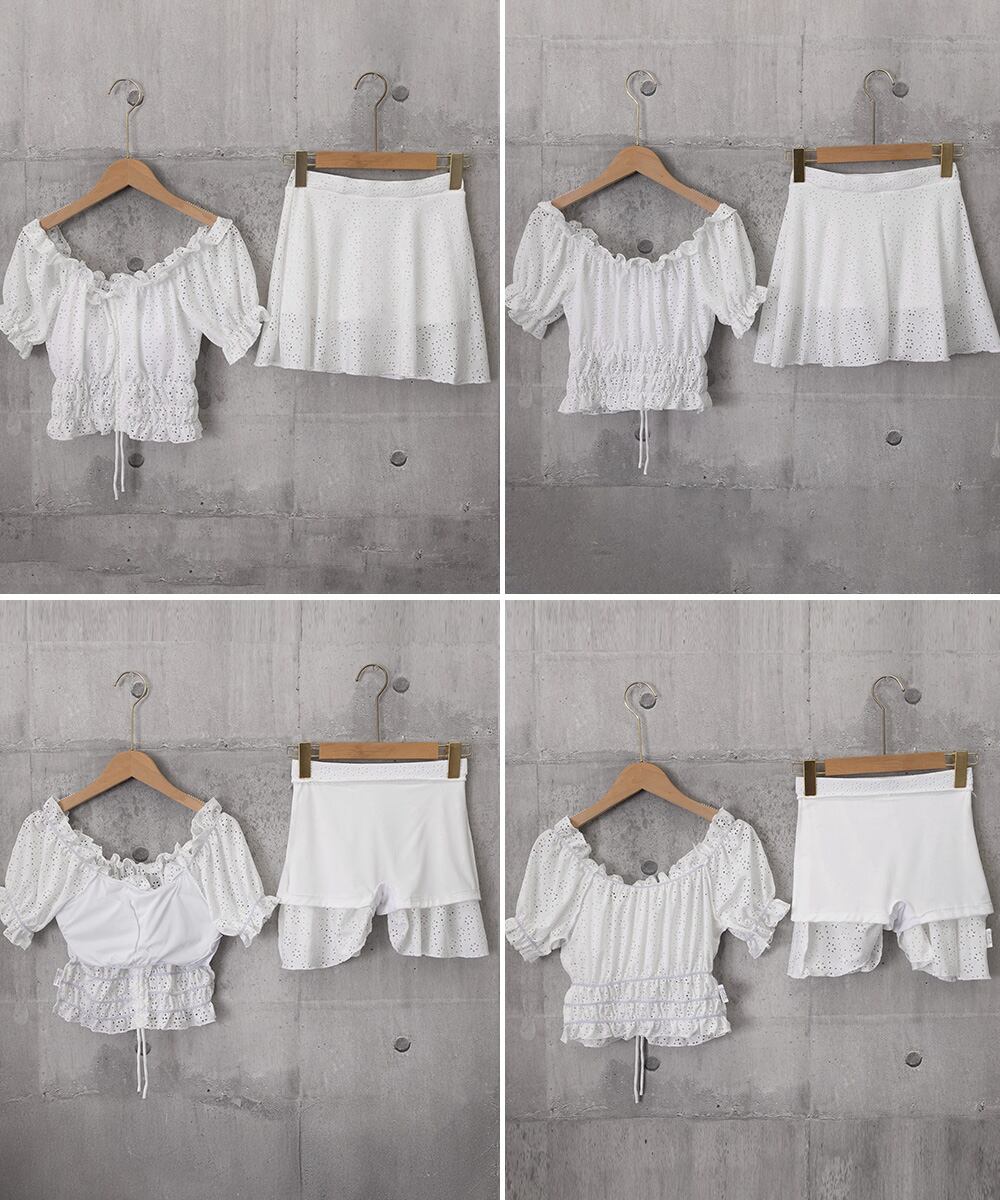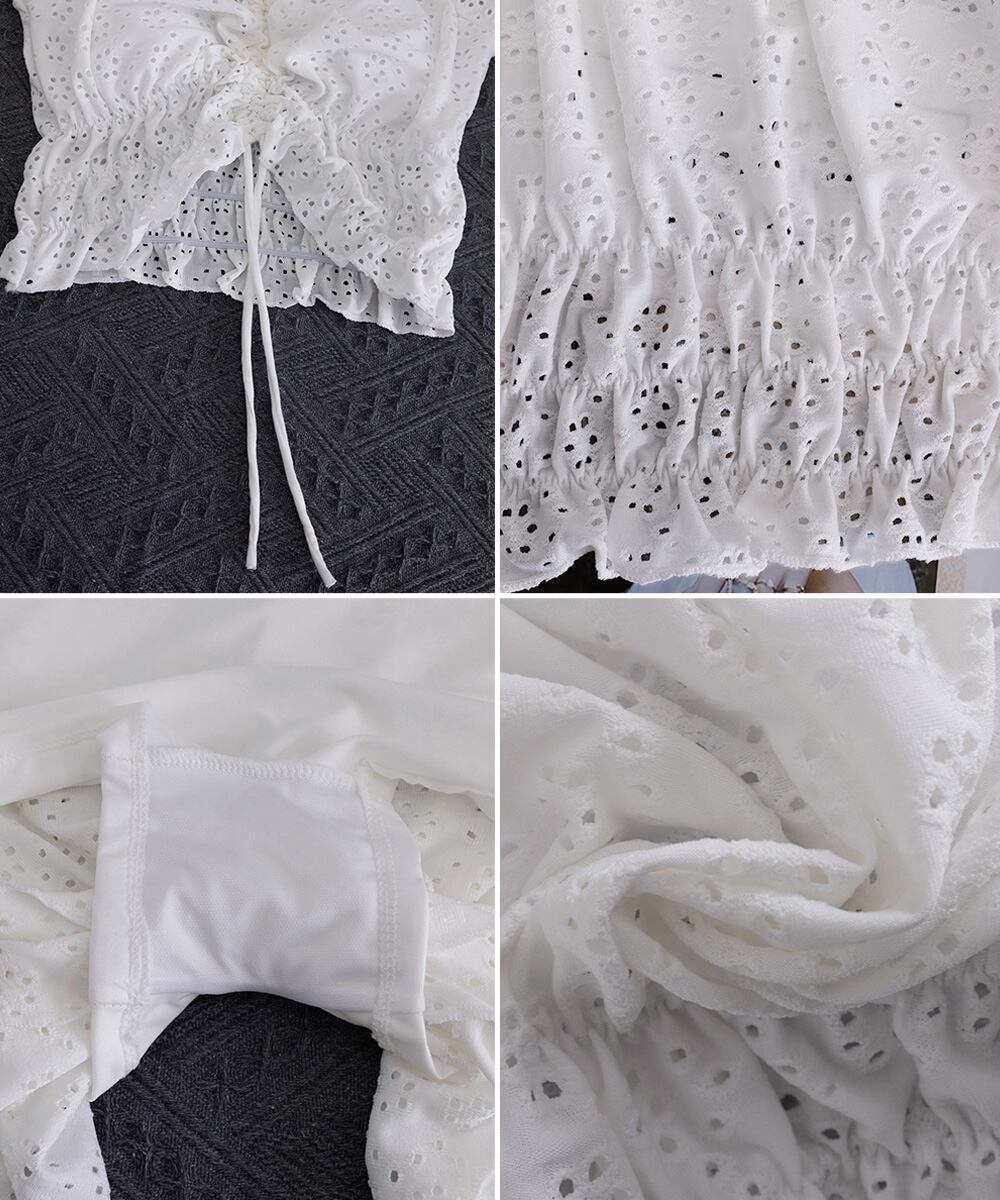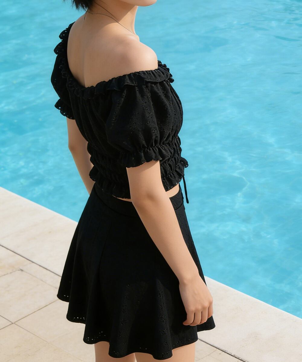 フリルレース水着オフショルダー チラ見え防止インナーパンツ付きスカート 着やせ露出控えめ水着 体型カバー小胸盛れるみずぎ